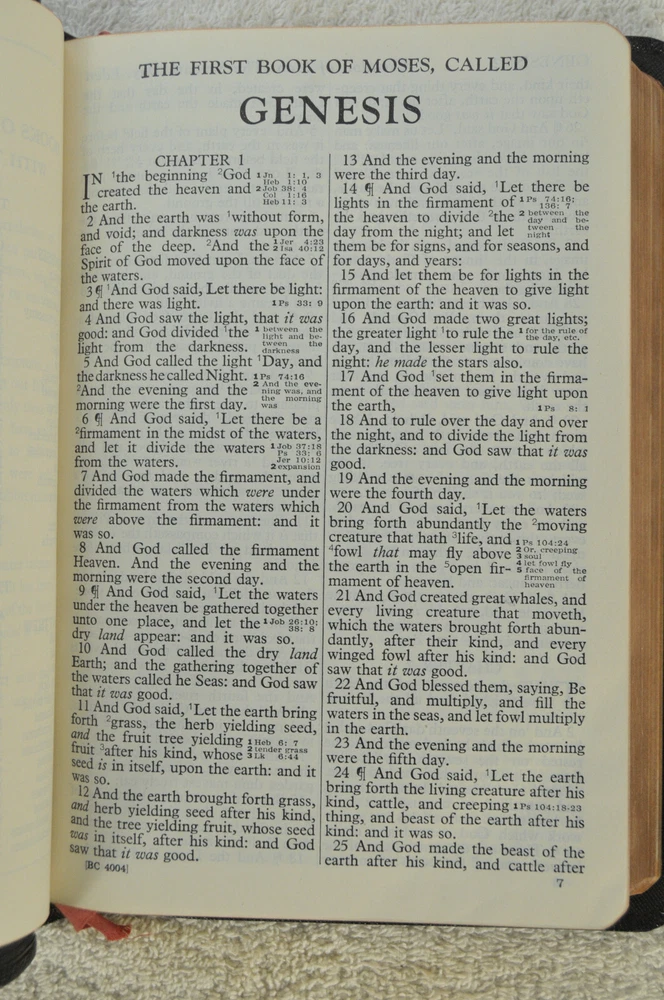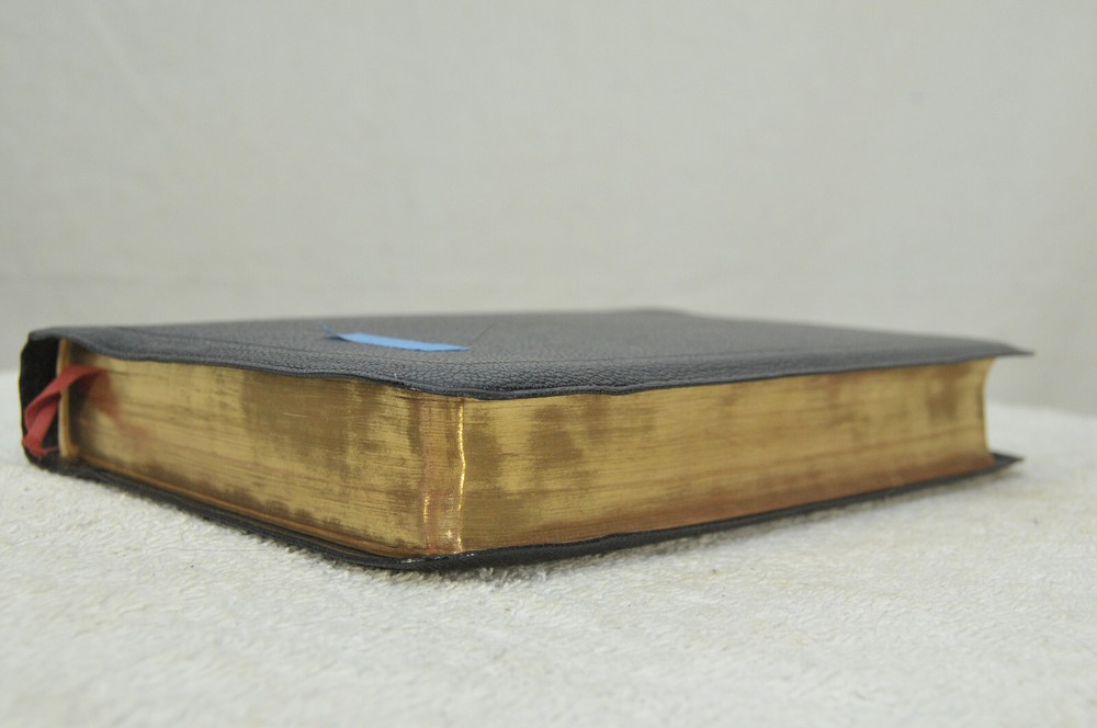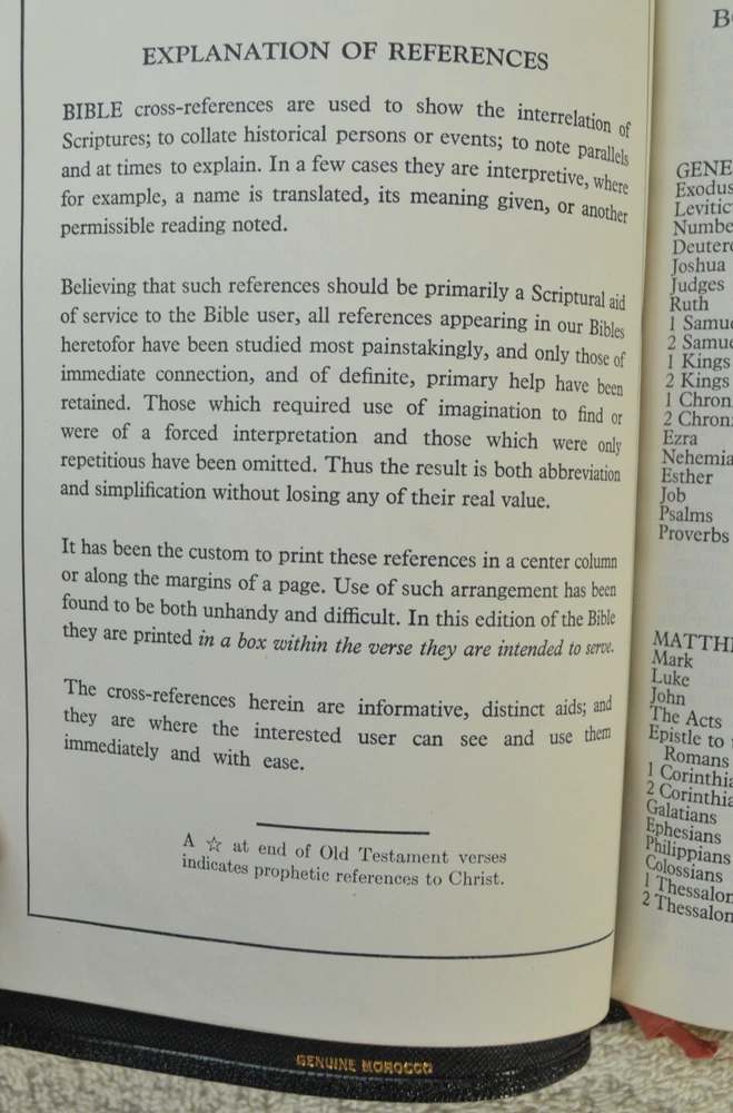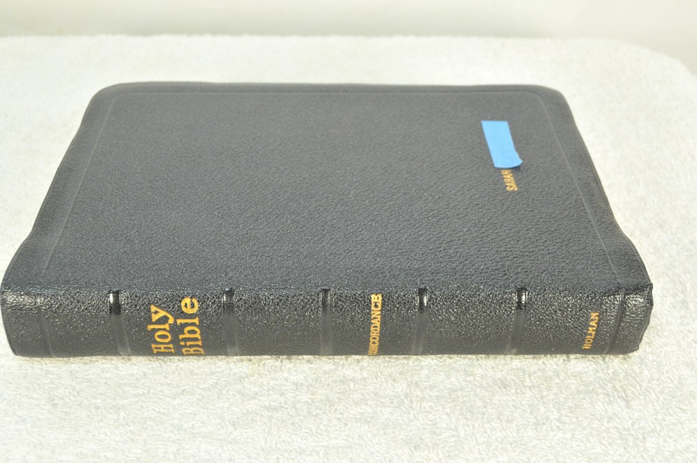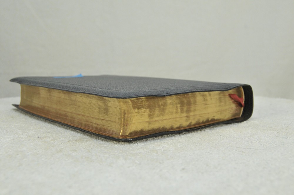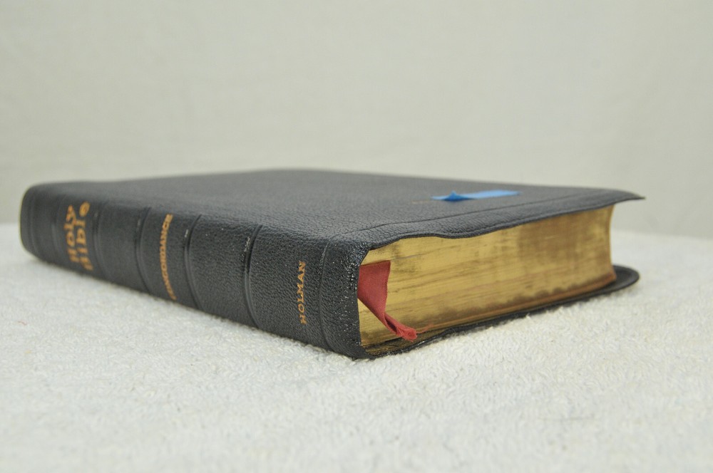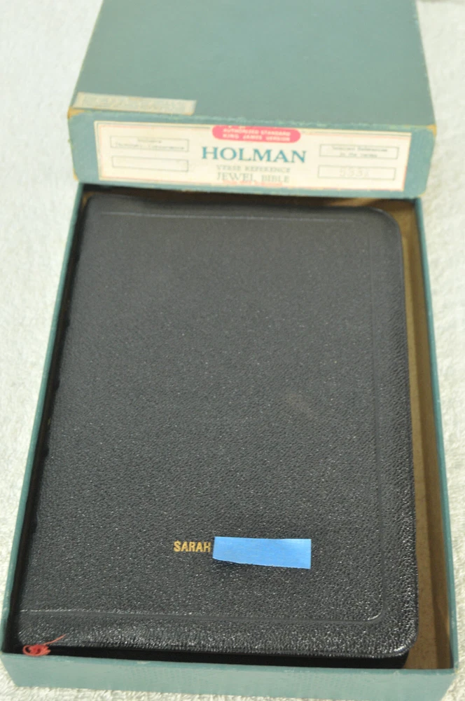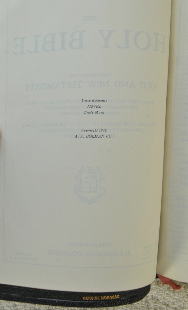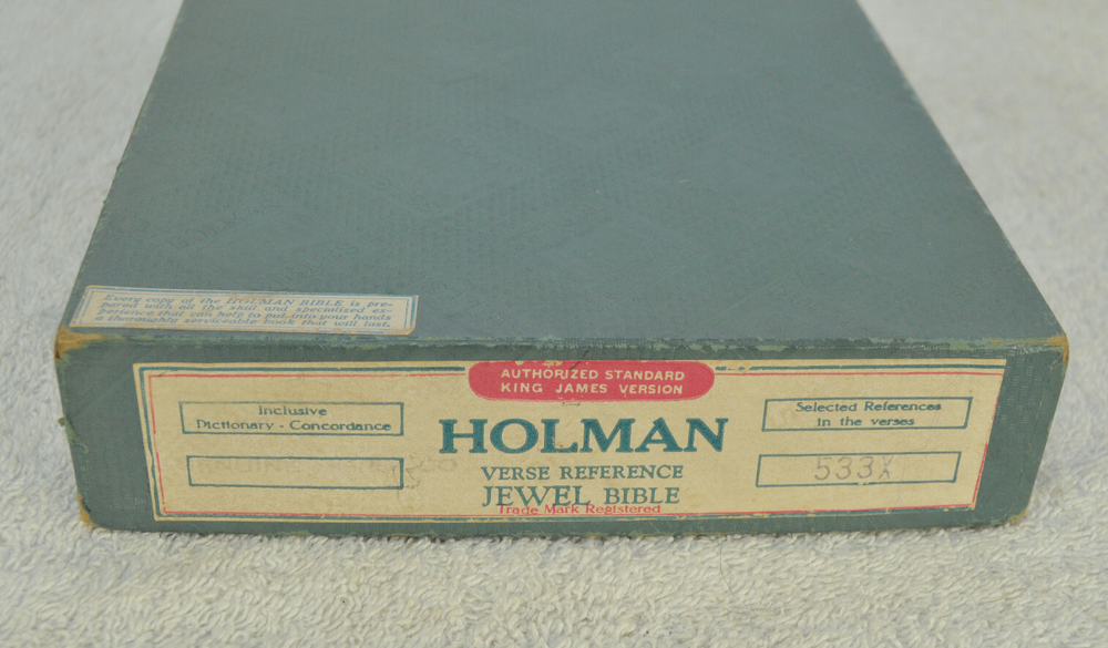 Holman Verse Reference Jewel Bible King James Version Copyright 1942 Black Genuine Morocco Leather Binding. Printed in the USA. Bible includes a combination Dictionary Concordance. This Bible is 1280 pages in length. 16 mo Clearface type on India Paper. End of Verse Reference Bible. Comes in the Original box which has minimal shelf wear. It is seemingly rare to find a quality Bible such as this in Like New Condition after this many years. Back in 1942 World War II was still raging in chaotic times. The world has changed since then but the Bible remains the same as ever. With reasonable care this Bible should provide many more years of service. Like New condition still in the original box. Original Owner's name Imprinted in Gold on front cover. No hand writing nor markings inside this Bible. No wrinkled nor dogeared pages in this Bible which appears to be unread after approximately 83 years. Genuine Morocco Leather cover is in excellent flexible condition. Please see all photos for details and condition.