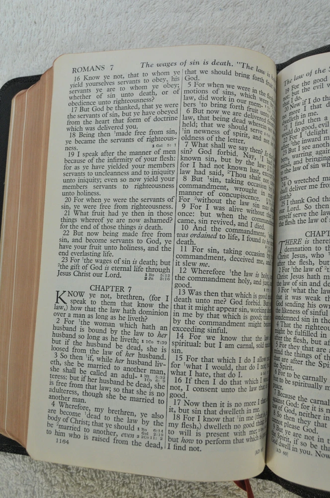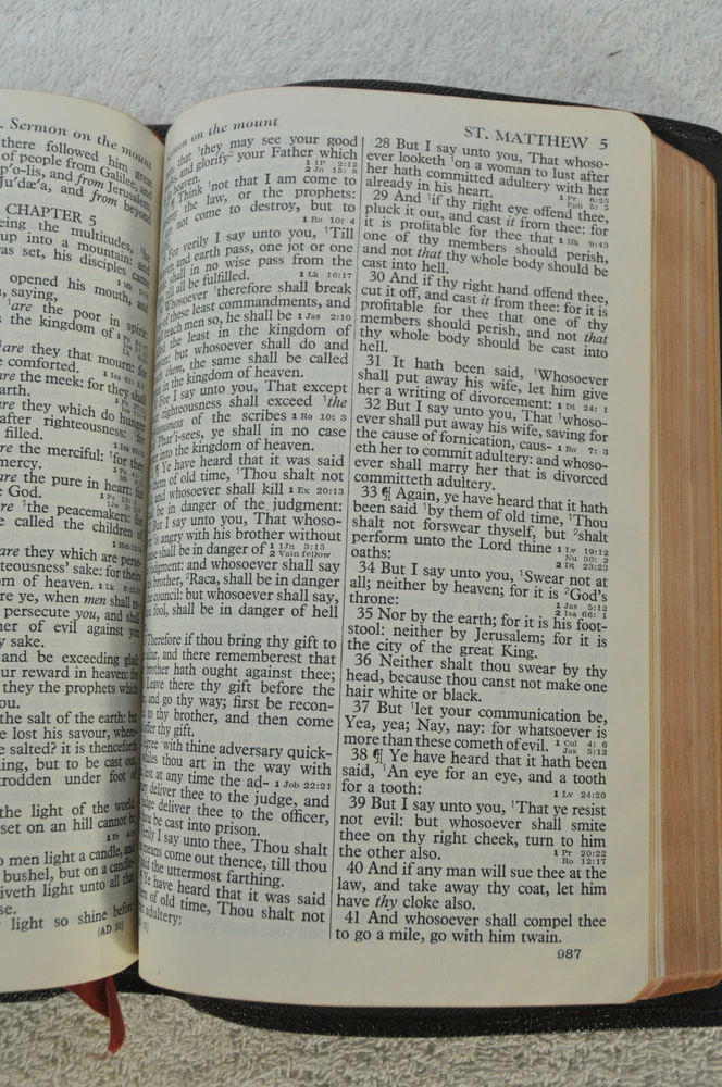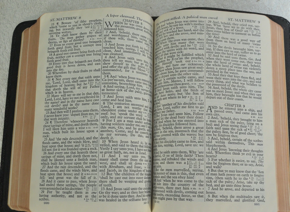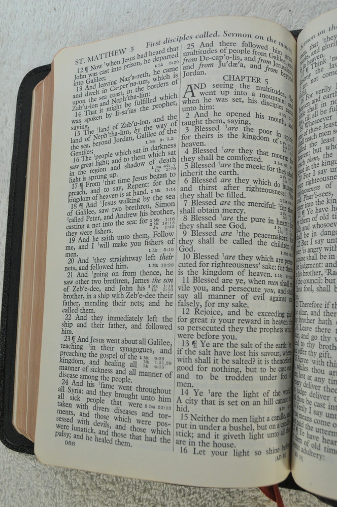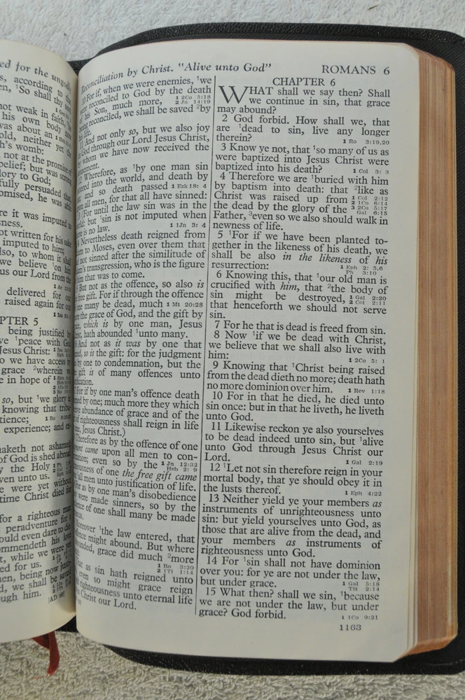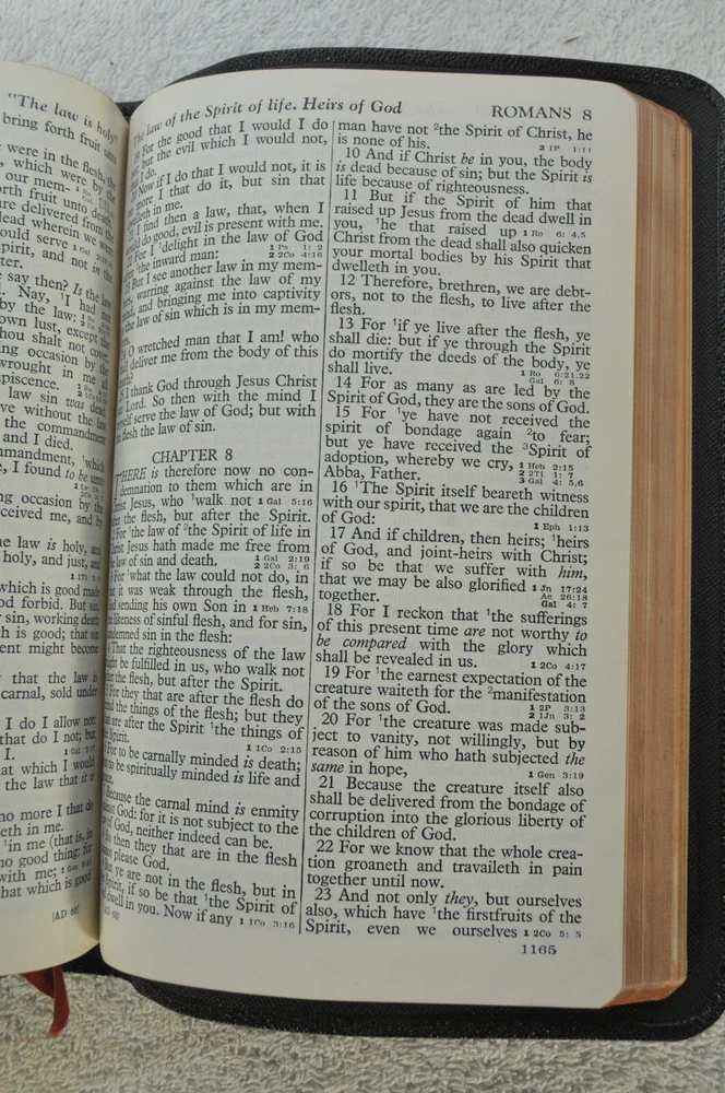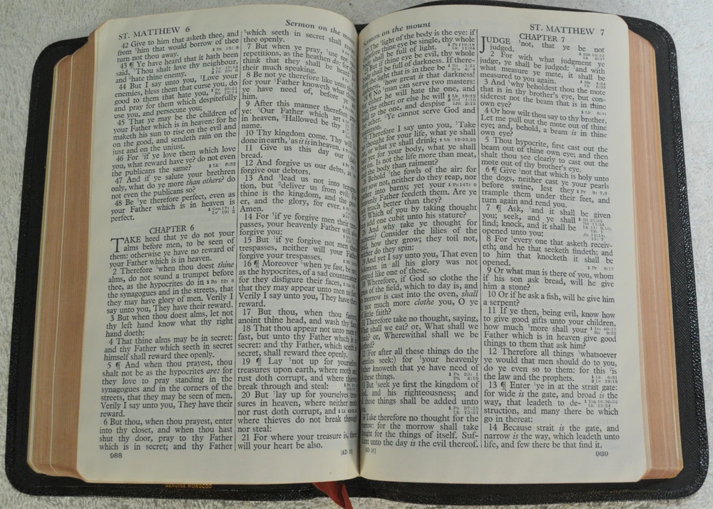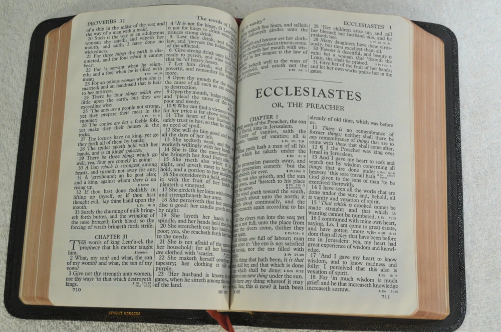 Holman Verse Reference Jewel Bible King James Version Copyright 1942 Black Genuine Morocco Leather Binding. Printed in the USA. Bible includes a combination Dictionary Concordance. This Bible is 1280 pages in length. 16 mo Clearface type on India Paper. End of Verse Reference Bible. Comes in the Original box which has minimal shelf wear. It is seemingly rare to find a quality Bible such as this in Like New Condition after this many years. Back in 1942 World War II was still raging in chaotic times. The world has changed since then but the Bible remains the same as ever. With reasonable care this Bible should provide many more years of service. Like New condition still in the original box. Original Owner's name Imprinted in Gold on front cover. No hand writing nor markings inside this Bible. No wrinkled nor dogeared pages in this Bible which appears to be unread after approximately 83 years. Genuine Morocco Leather cover is in excellent flexible condition. Please see all photos for details and condition.