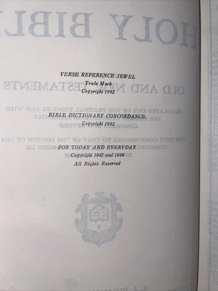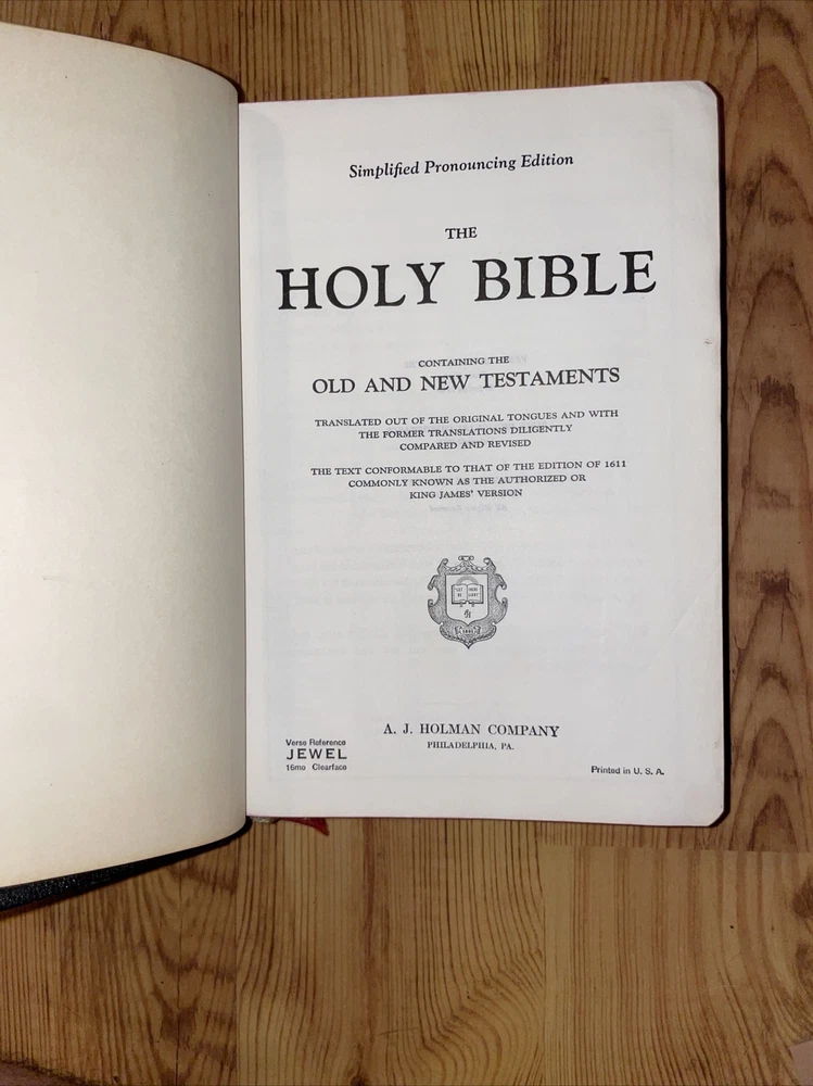 Holy Bible 1942 Holman Simplified Pronouncing Edition A.J. Holman. Water seeped through some pages as shown in the photos above but the rest of the Bible is in great shape to be read. Let me know if you have any other questions.