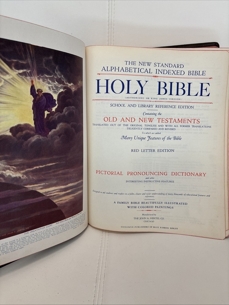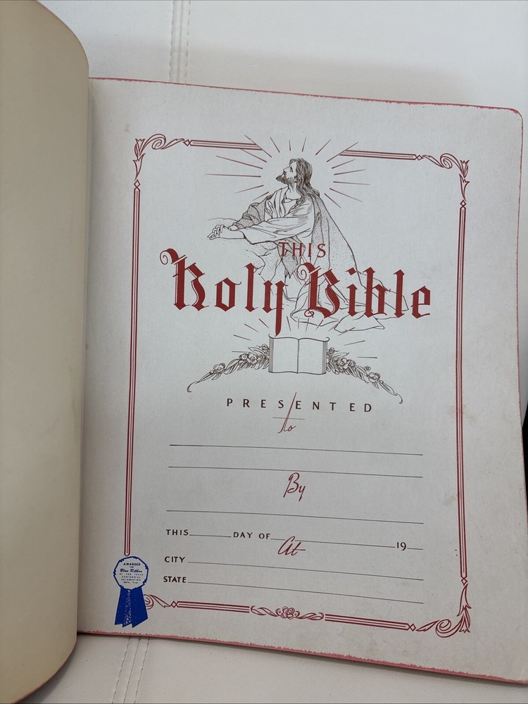 This Holy Bible from 1951 is a rare find for collectors and believers alike. With its beautiful blue ribbon and standard reference edition, it is a valuable addition to any library or collection. The binding is made of high-quality leather and the pages are filled with the wisdom and teachings of Christianity. This original copy was printed in the United States and is a must-have for anyone interested in reference materials or collectible books.