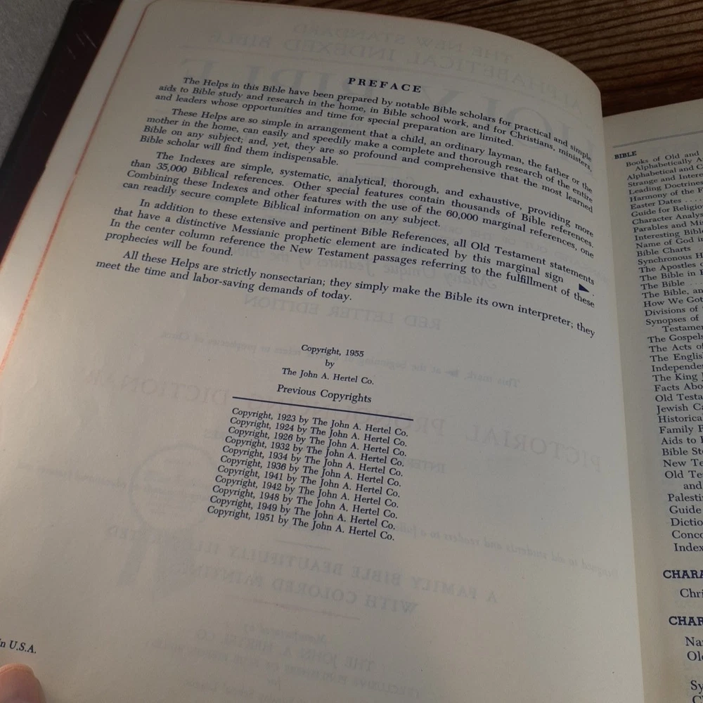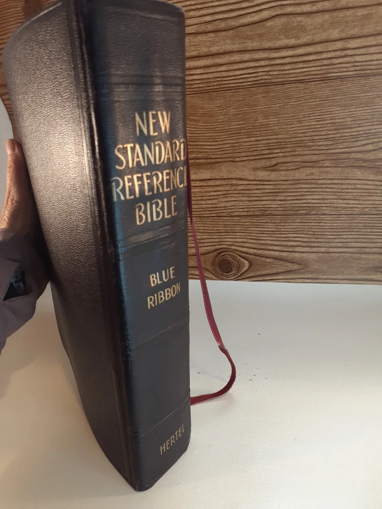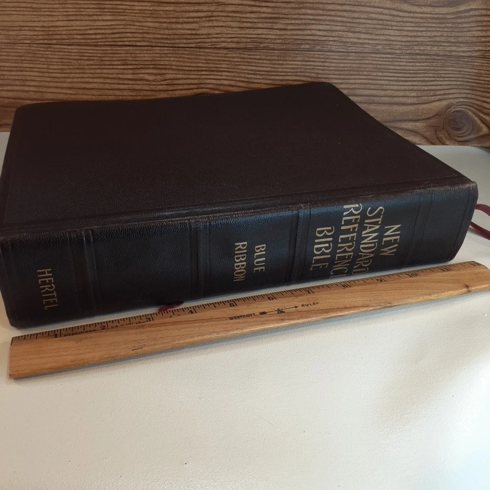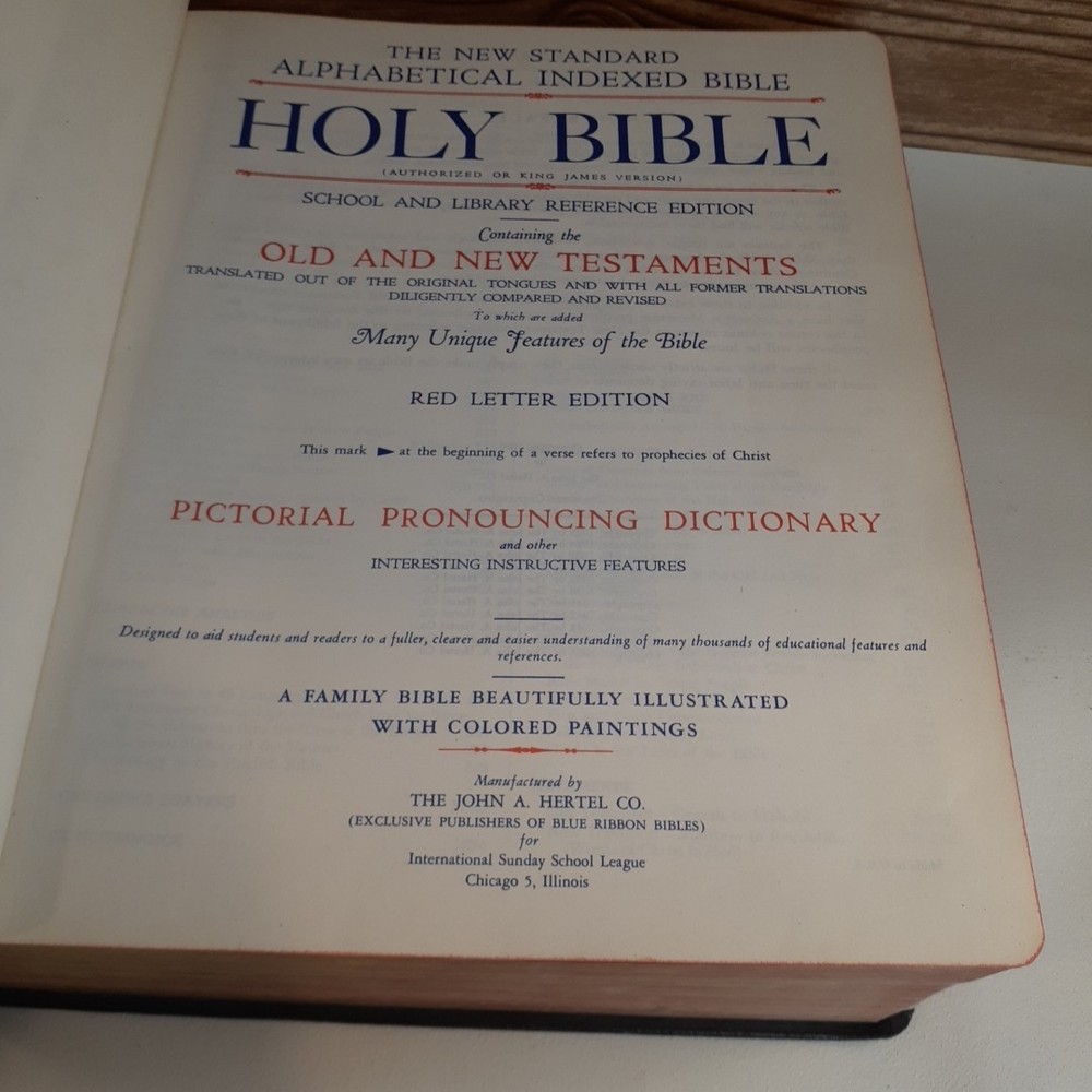 The Holy Bible 1955 Hertel Blue Ribbon New Standard Reference Red Letter Edition is a special and collectible antique Bible published in the USA by John Hertel. This leather-bound Bible features a large size, vintage illustrations, and is in English with a red letter edition. It is a valuable reference for Christians and Bible enthusiasts, making it a unique addition to any collection of religious literature. Item comes from a smoke free home. Payment is expected within 24 hours. I will ship within 48 hours of receiving payment. Check my feedback and shop with confidence. Thanks for looking!!