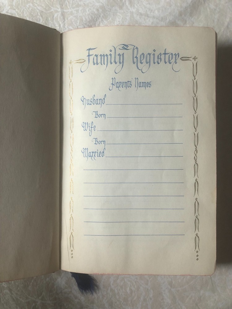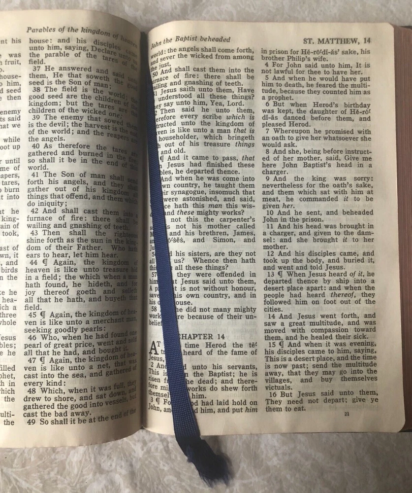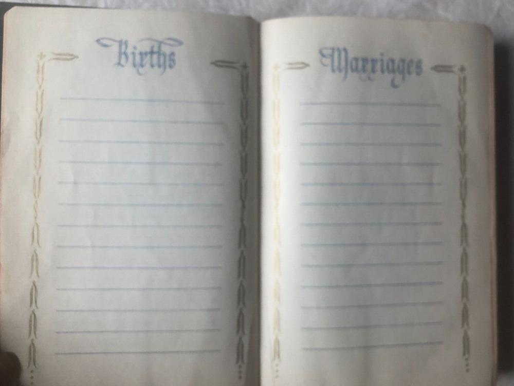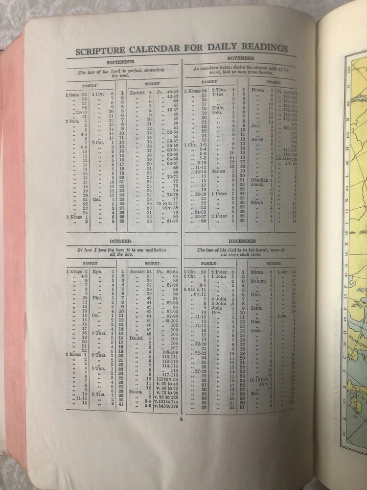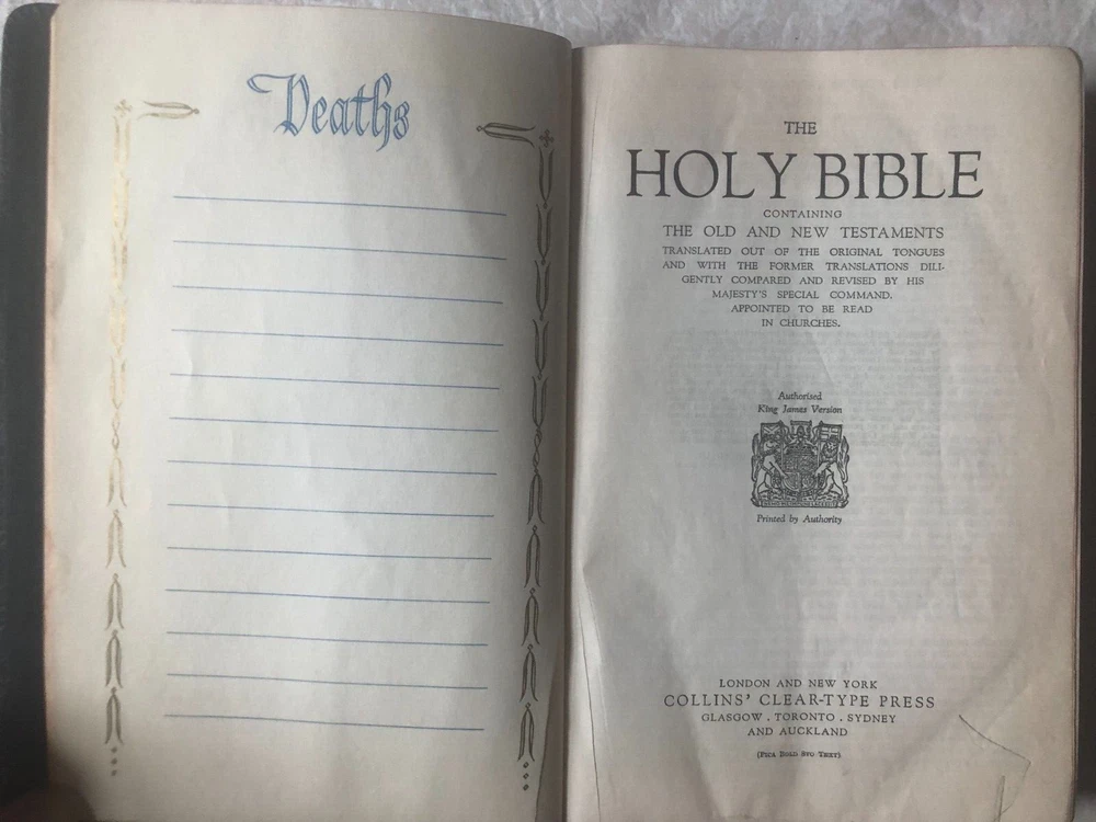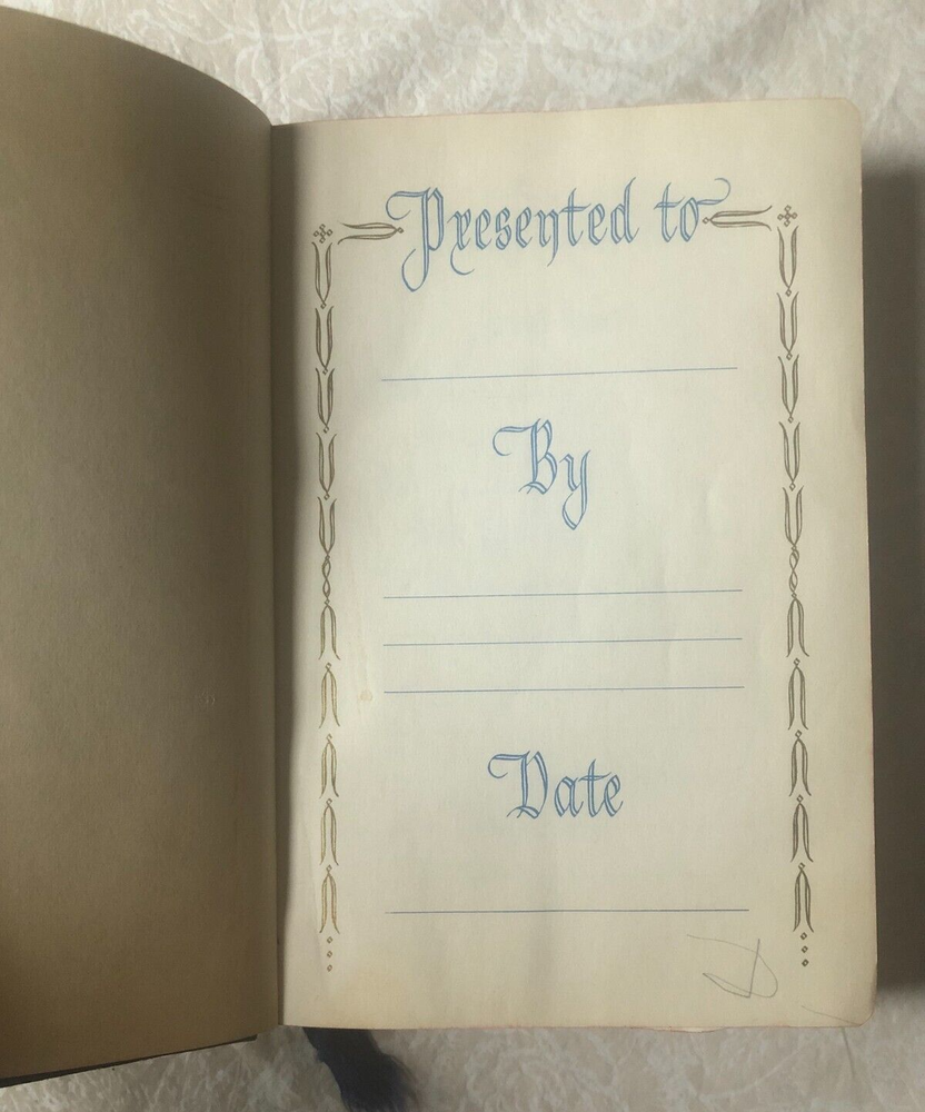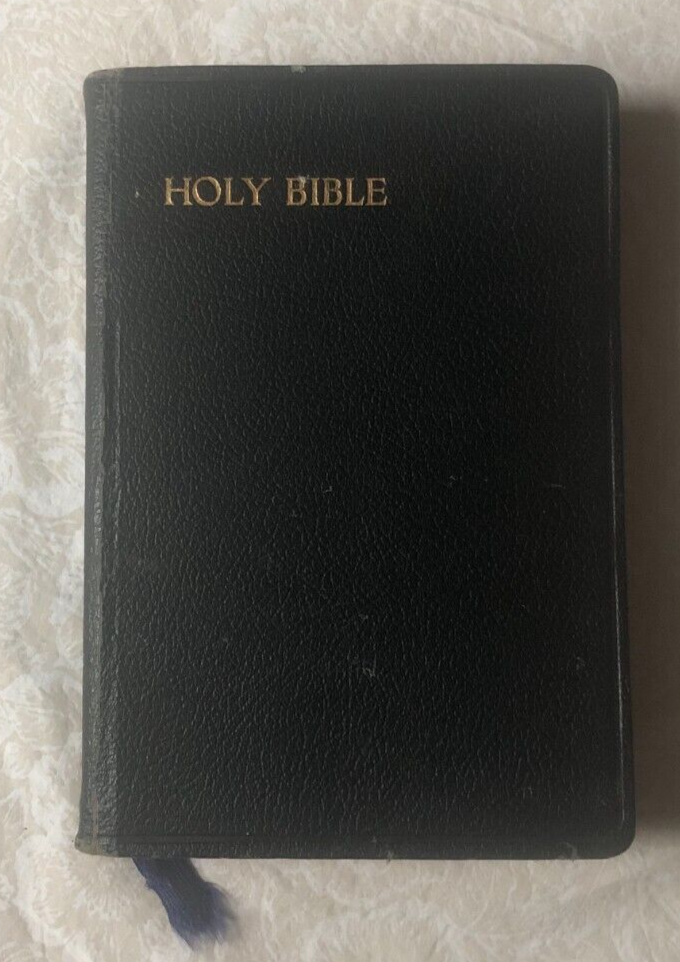 1958 Great Britain printing of the Holy Bible. This Bible features a "Presented to" Page as well as pages to register family members and record births, marriages, and deaths. There is a Scripture Calendar for daily readings and about 15-16 color maps. Pages are thin and there is a blue ribbon bookmark. There is a marking on the lower right hand corner of the cover page (as shown in photo) and one page in the Book of Matthew is torn. Otherwise, this Bible is in excellent condition. Feel free to reach out with any questions. Thank you for looking! :)