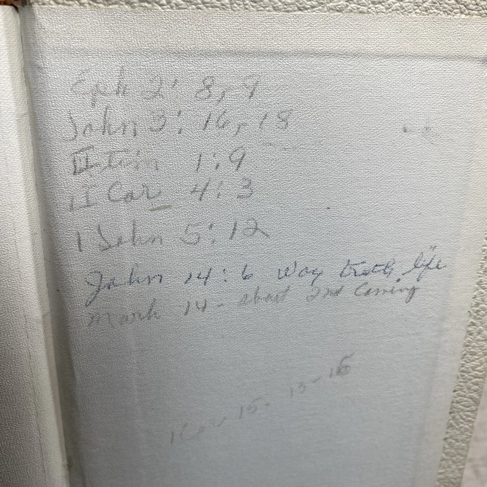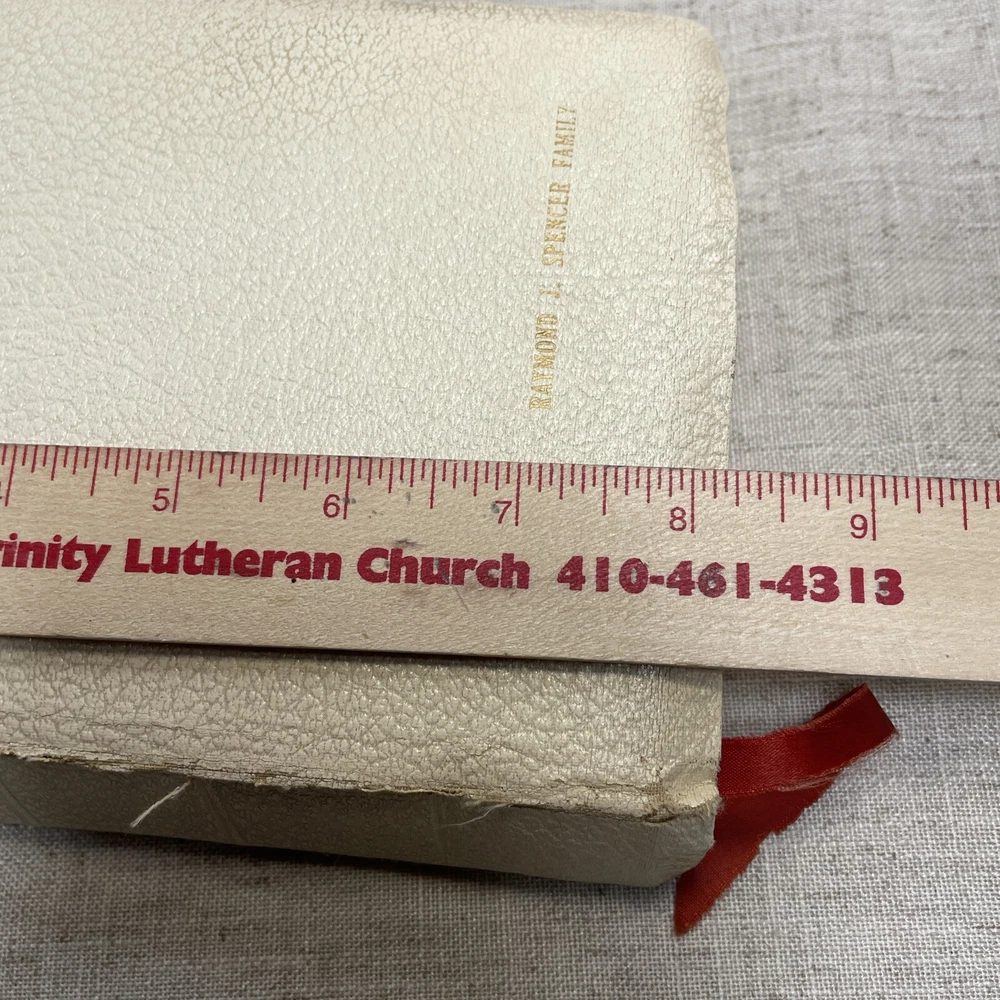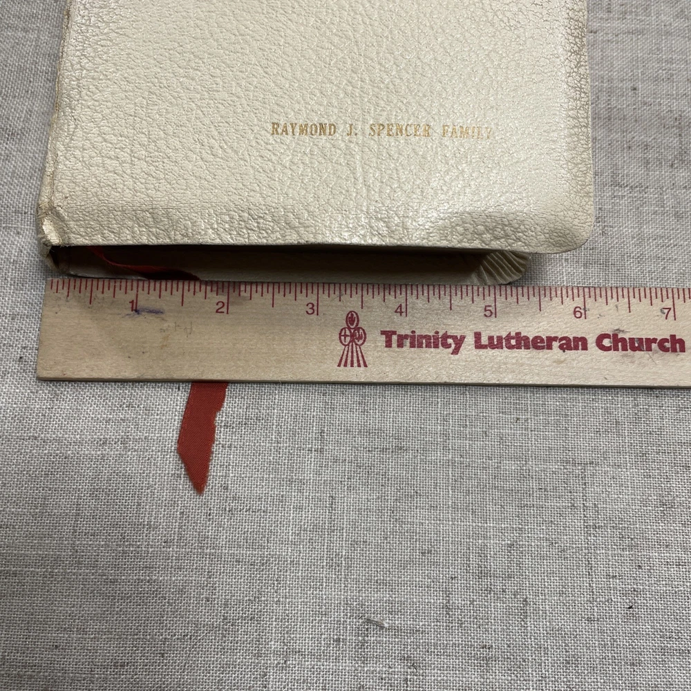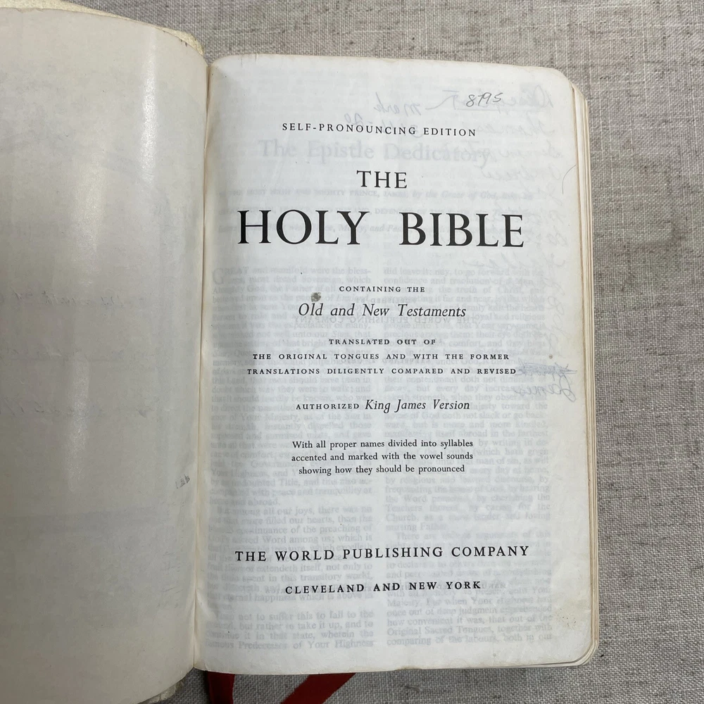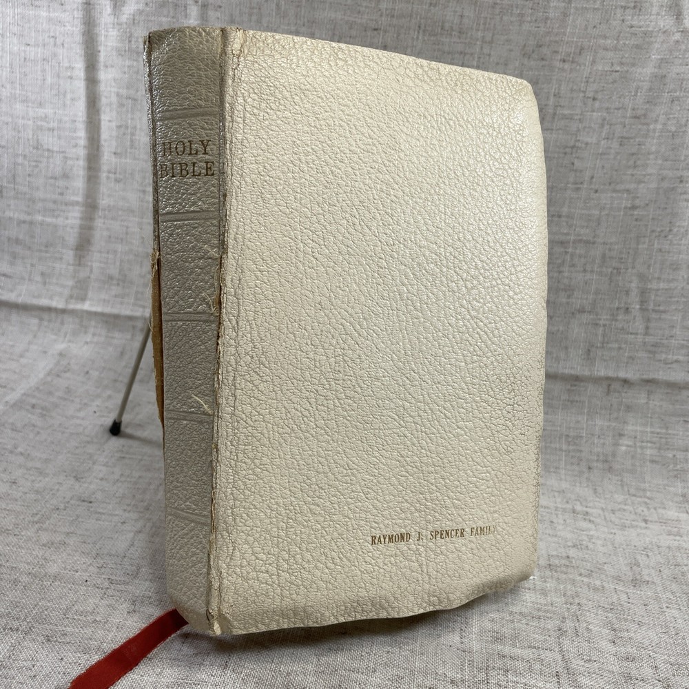 Holy Bible 1961 White Illustrated World Publishing KJV King James Vintage Red text. Condition: The spine on this bible is in poor condition. There is a lot of writing and circled text on many pages.