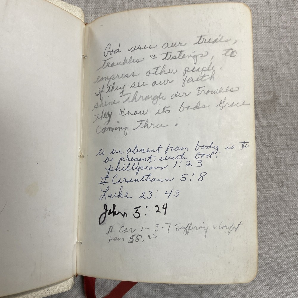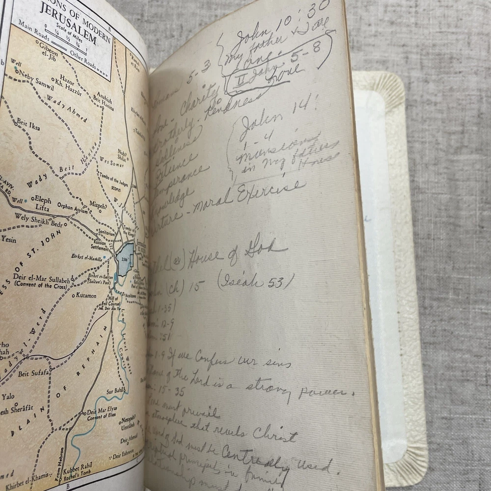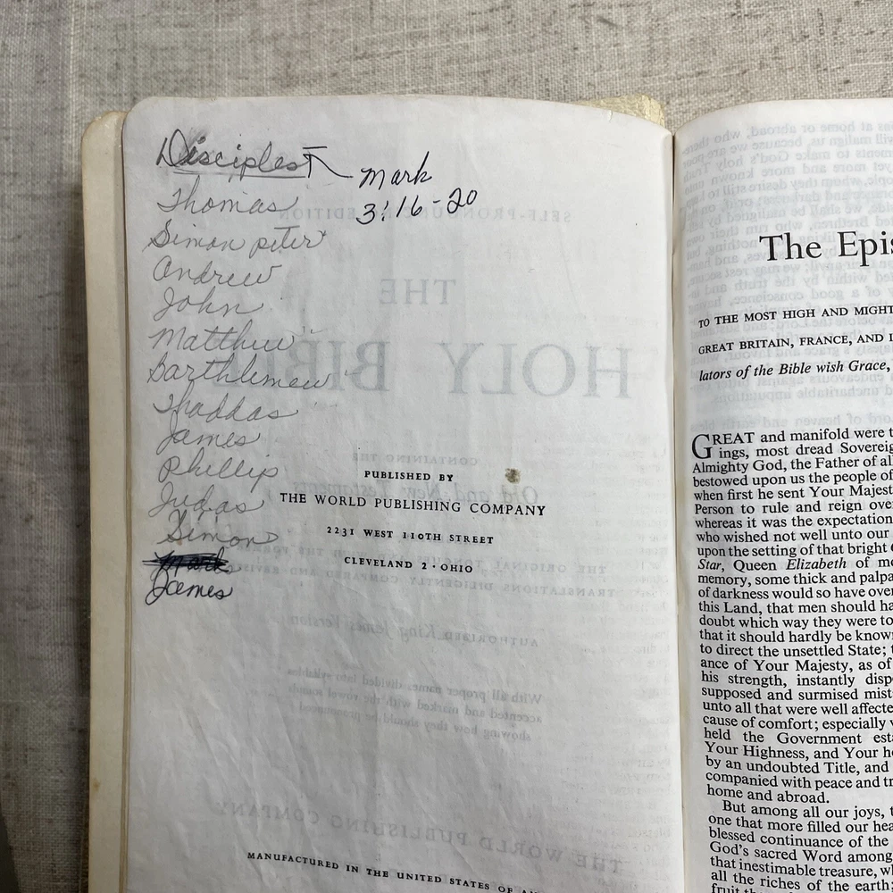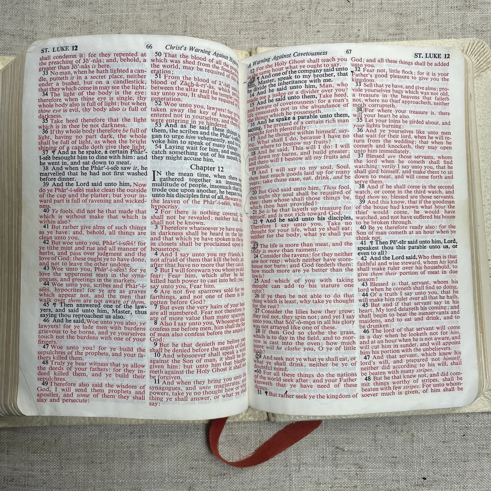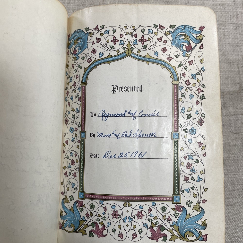 Holy Bible 1961 White Illustrated World Publishing KJV King James Vintage Red text. Condition: The spine on this bible is in poor condition. There is a lot of writing and circled text on many pages.