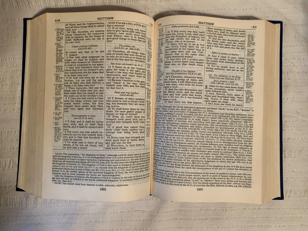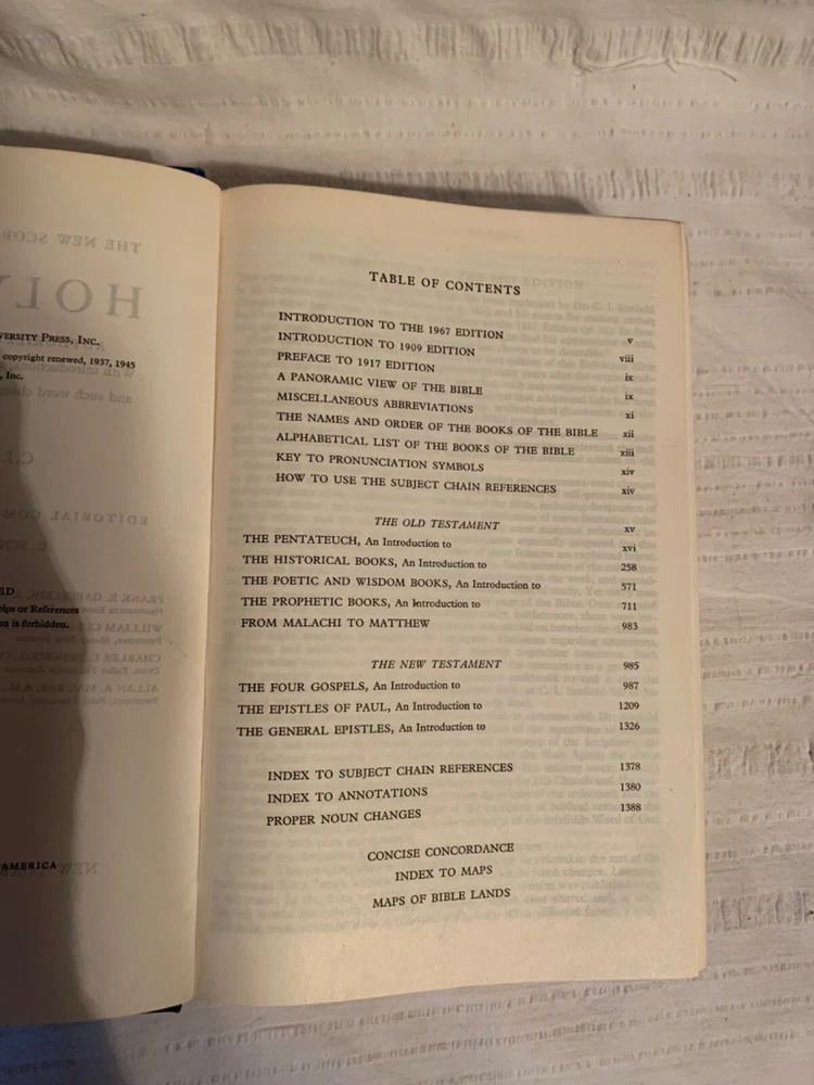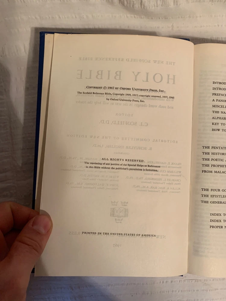 Holy Bible Concordance New Scofield Edition Reference Edition Oxford 1967 Blue. Hardcover This book has edge wear, scuffs, some stains, writing on the front end-page, and creased pages. Check out the photos. Thanks for looking! 23-391