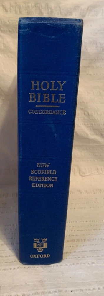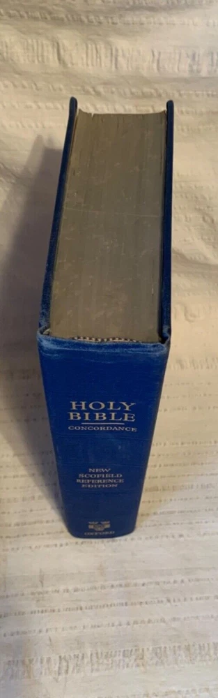 Holy Bible Concordance New Scofield Edition Reference Edition Oxford 1967 Blue. Hardcover This book has edge wear, scuffs, some stains, writing on the front end-page, and creased pages. Check out the ...