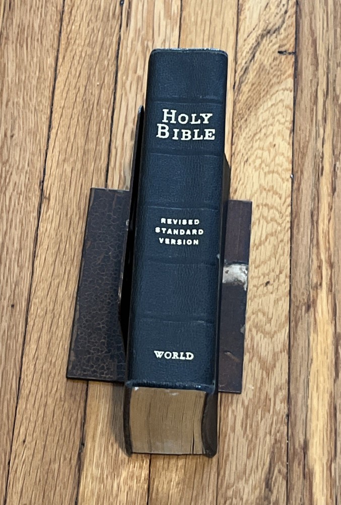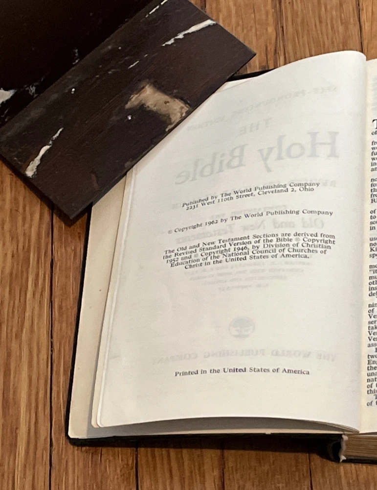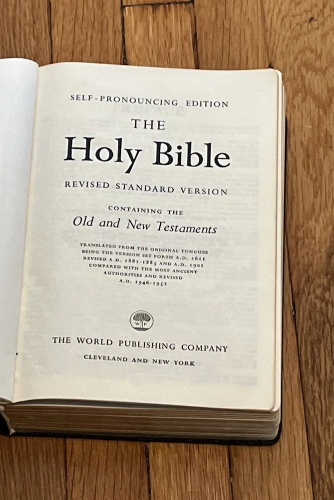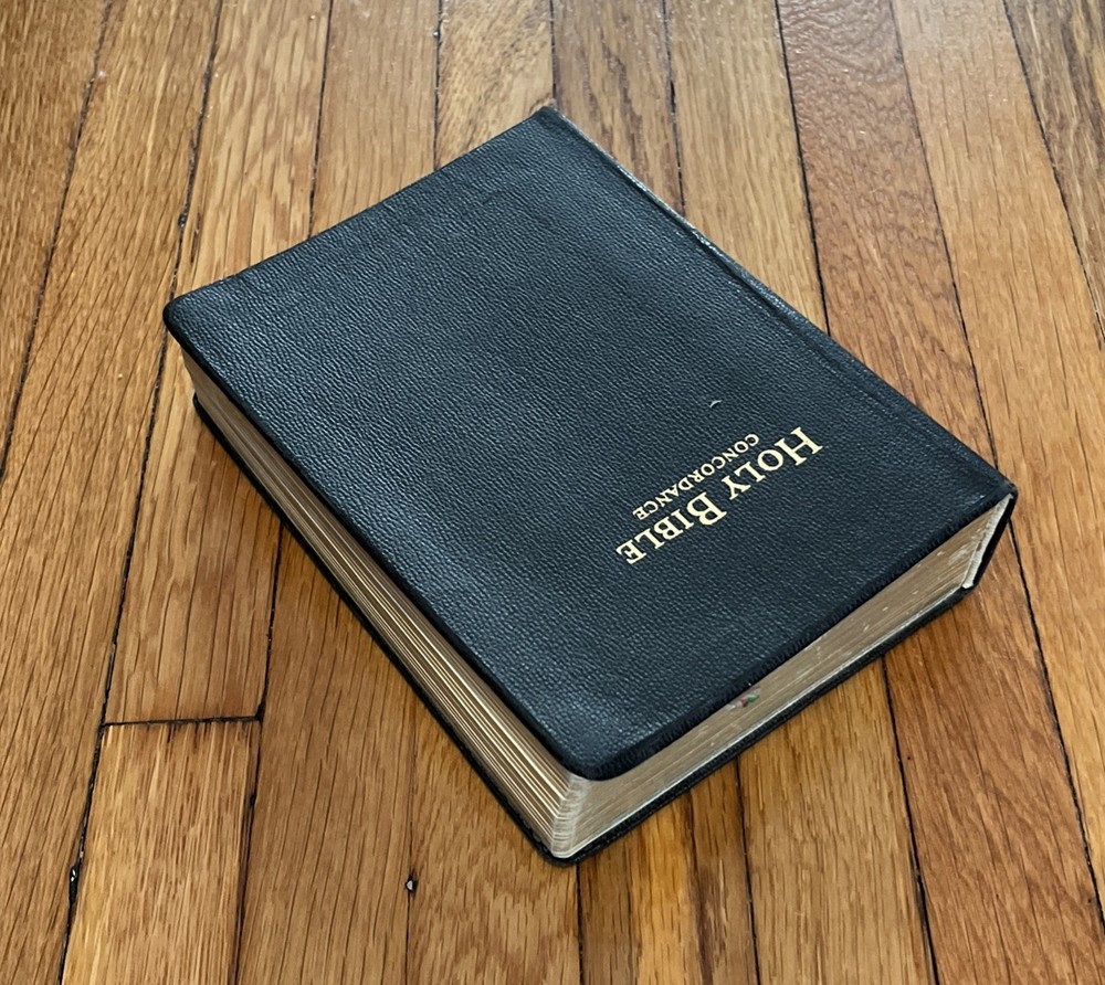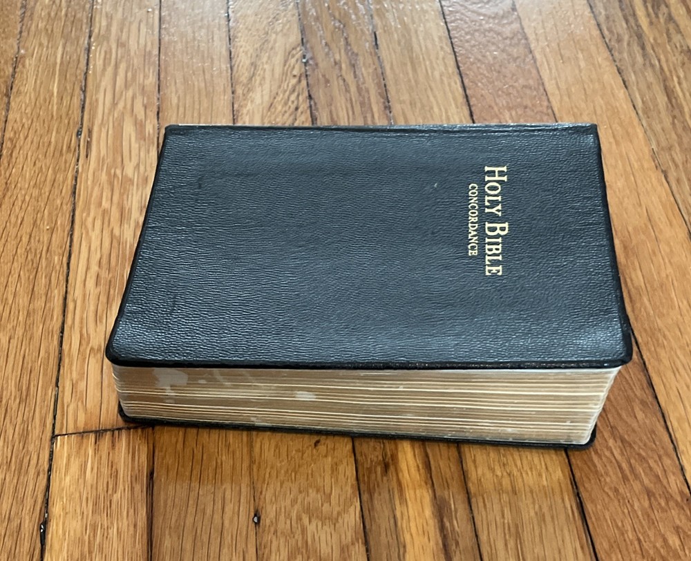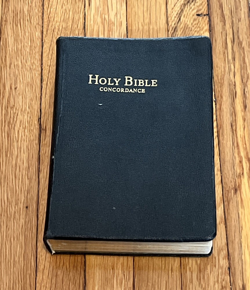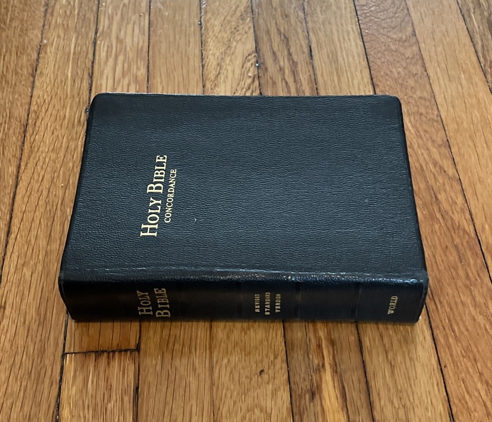Holy Bible Concordance Revised Standard Version World In good condition, with wear and tear to the covers, wear and tear to the gold page edges, rip page on 287/288, and browning pages. The word!...