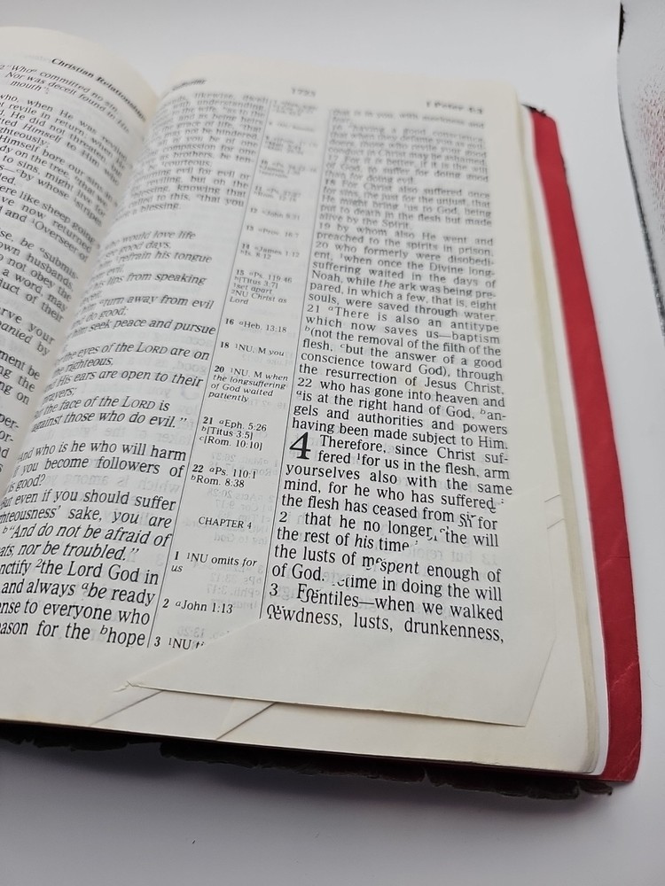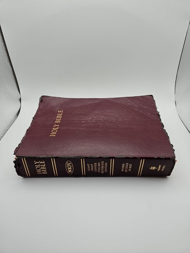 Very well used and worn. As you can see from the photos, this bible has been used A LOT. Cover is very worn. Dogeared and wrinkled pages are to be expected. Minimal writing on pages themselves. The book is complete and still very readable. See photos for further condition details.