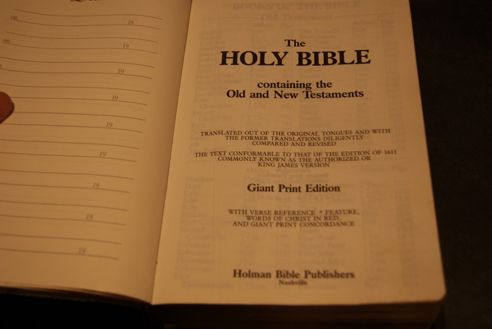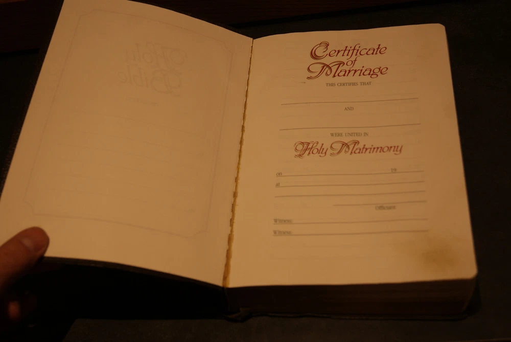 Holy Bible- Giant Print, KJV Reference, Concordance- Red-Letter, Holman 1982 Ed Staining on marriage page, and binding exposed. The Bible is free of any underlines or highlighting - see photos...