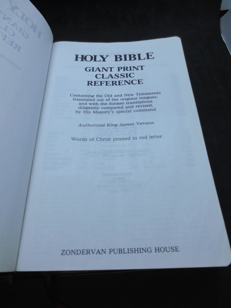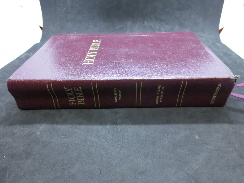 Holy Bible Giant Print Reference Bible KJV Red Letter Zondervan Vtg 1994 Burgundy Leather. Good condition. There are some pages with minor pencil marks on the edge. The presented to page is missing. Please look at pictures to see the actual item that you will be receiving so there are no surprises. Smoke free home. Email me with any questions. Thanks.