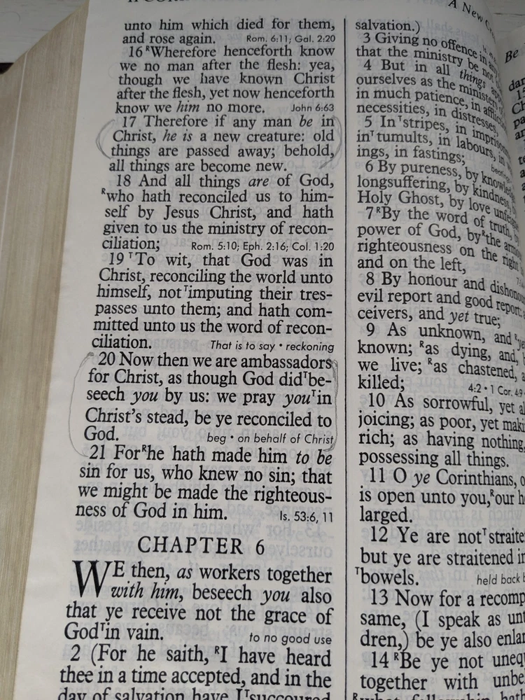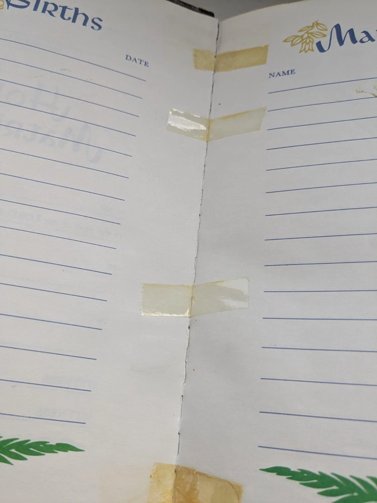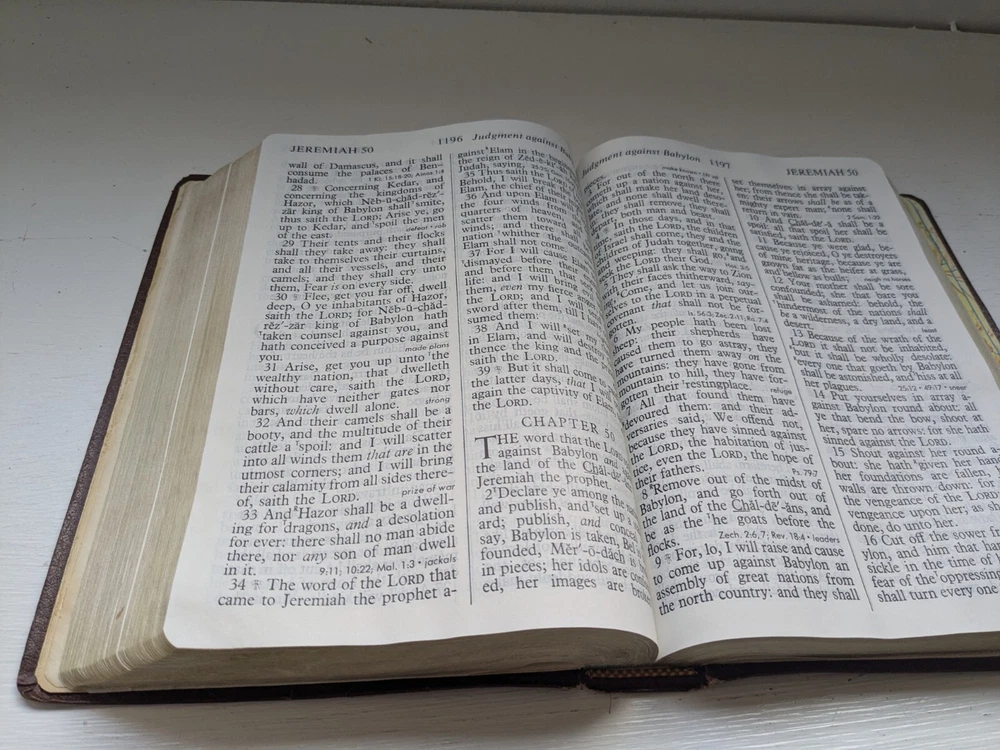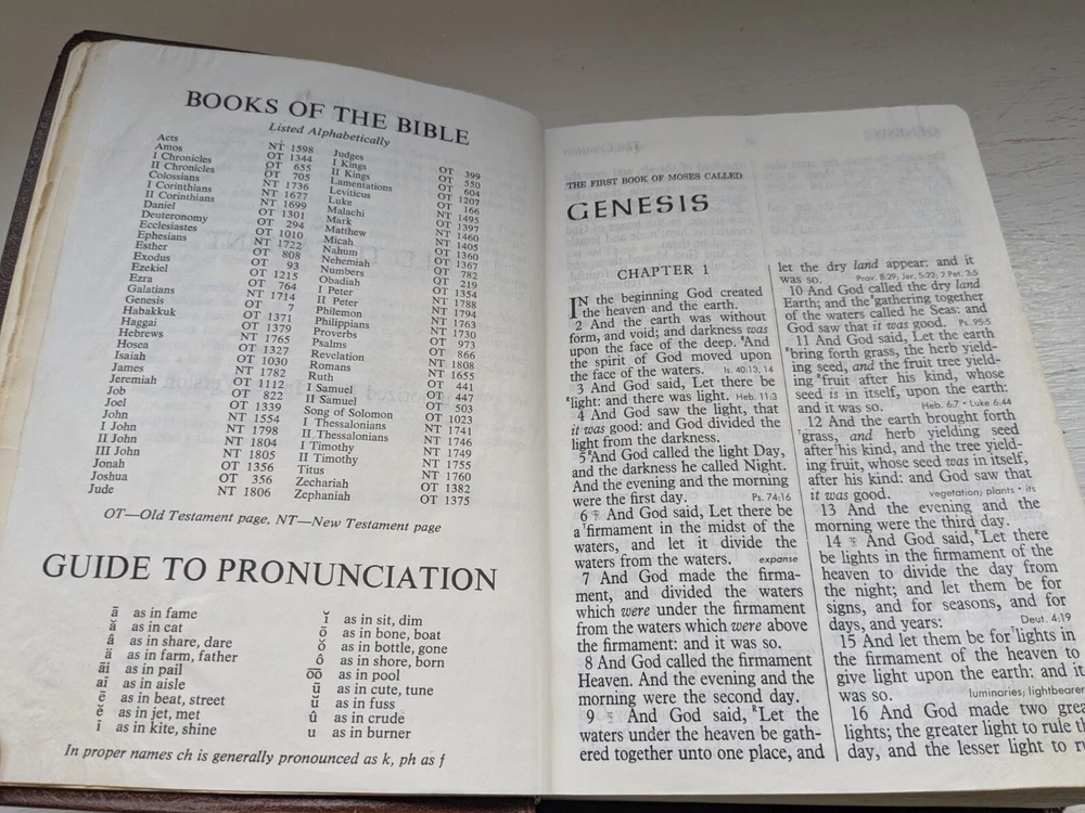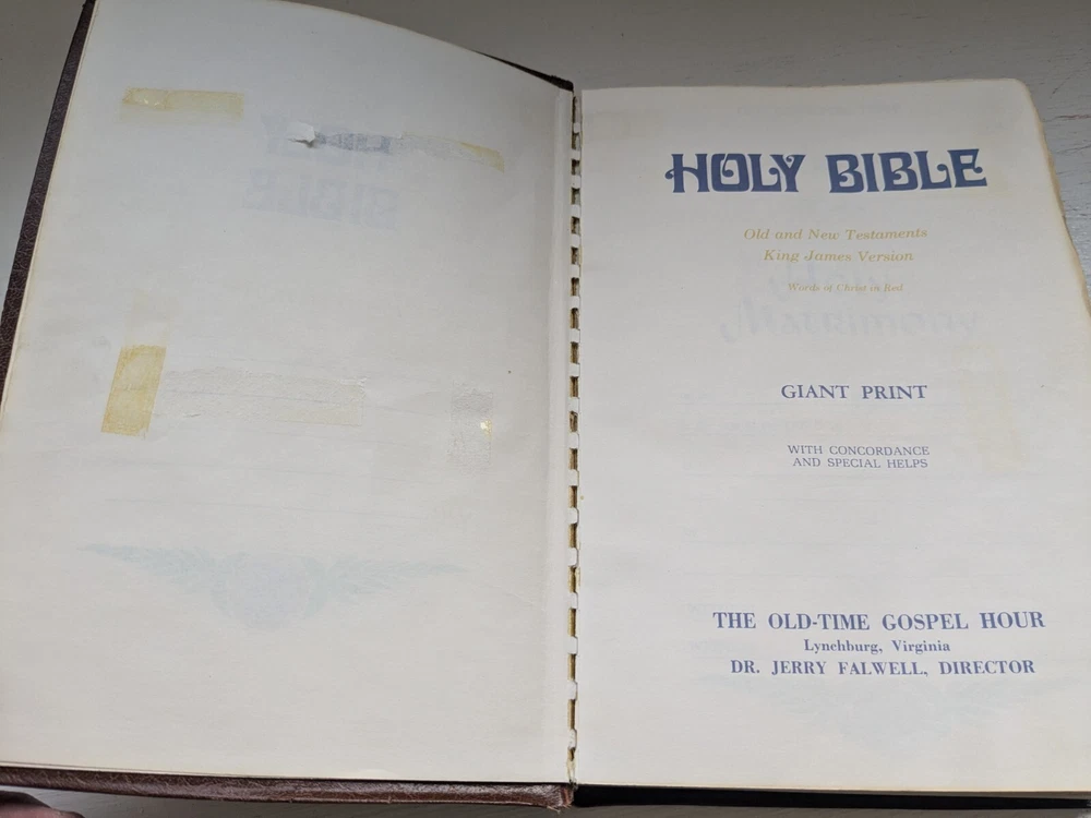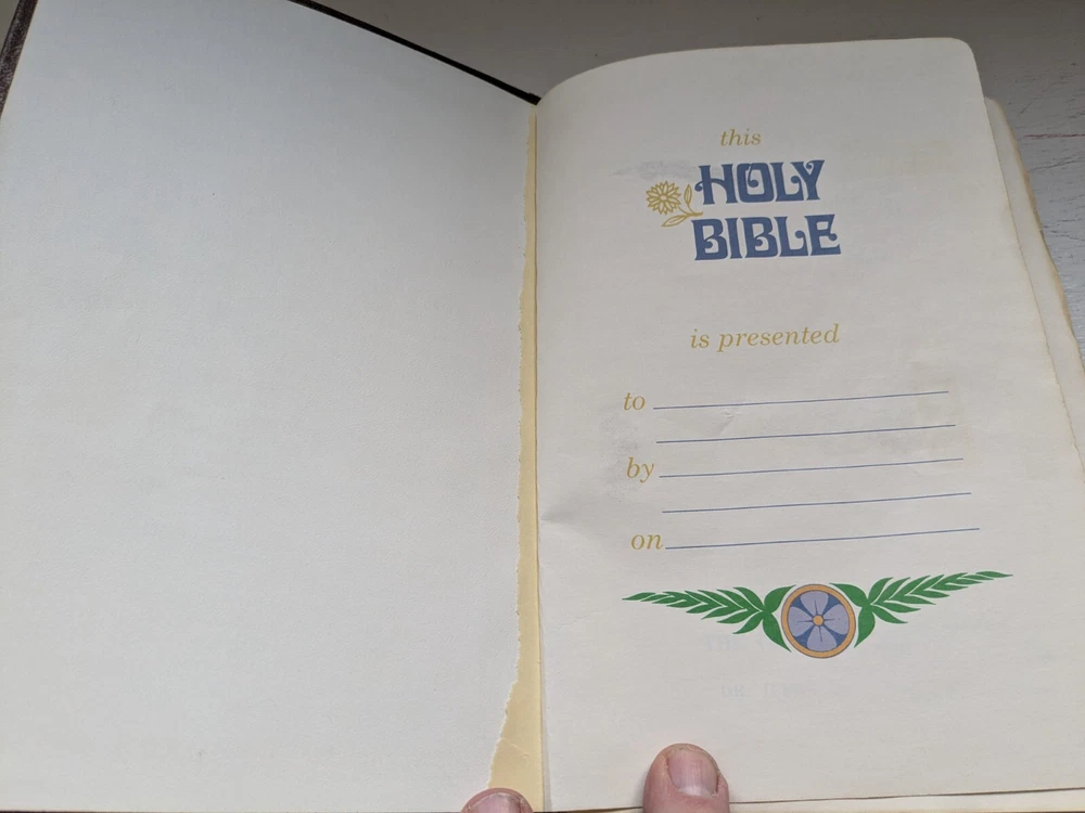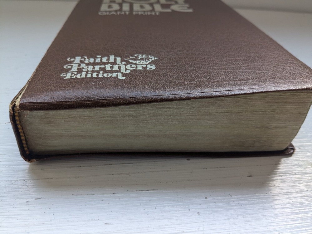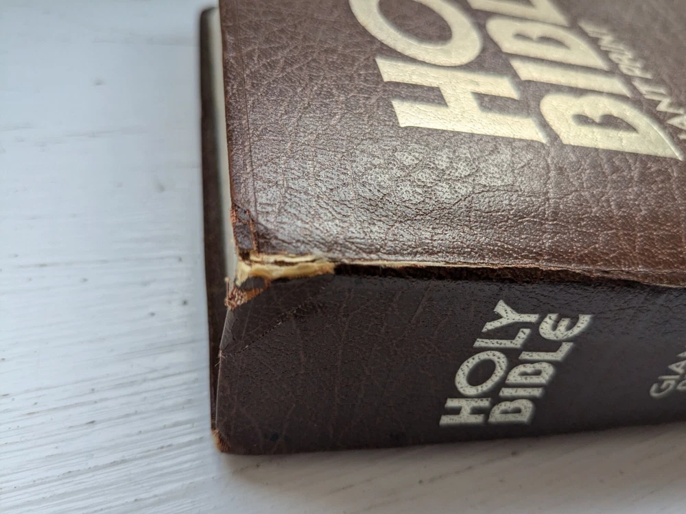 Binding is strong. Red letter edition. No name in front. Flipping through the Bible I see maybe 50 pages with some margin marks. See last five photos for Bible wear which includes minor wear to front hinge , 4 pages have scotch tape one page is torn and some cosmetic wear to spine