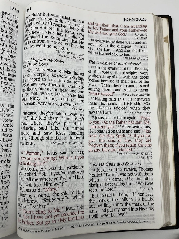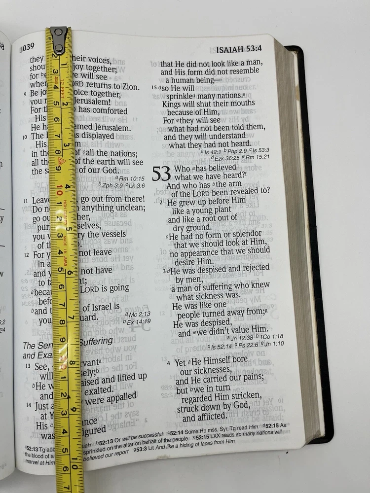 This was an exceptional purchase! As described, 'like new' and really better! NO blemishes or evidence of ever having been read. Packaging was good, so it arrived UNDAMAGED! A very high quality Bible with references but not a lot of notes, so the focus is on what God has spoken and not human notes. The Bible, because it was not abused or treated roughly, still retains it original value and like new appearance, which were motivators for my purchase. I highly recommend this seller! 10/10