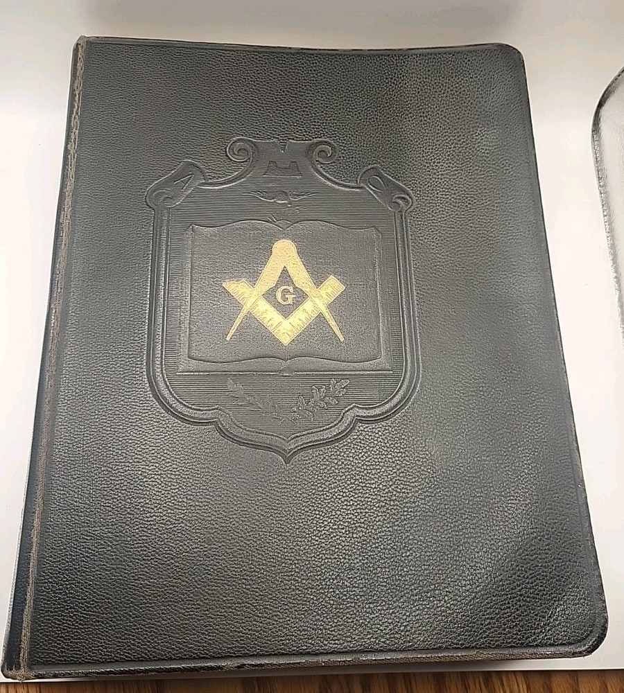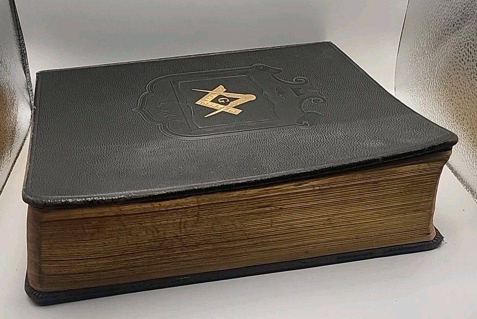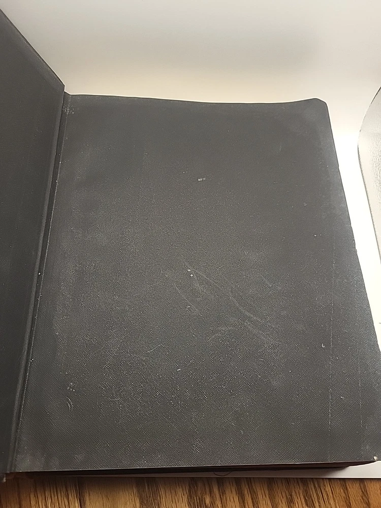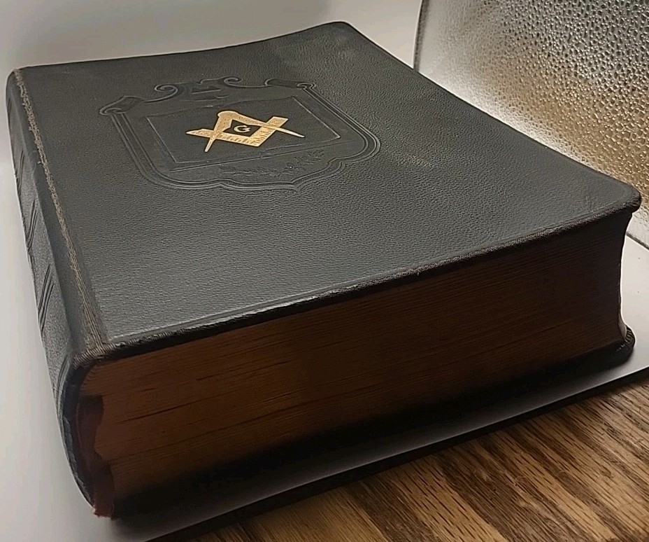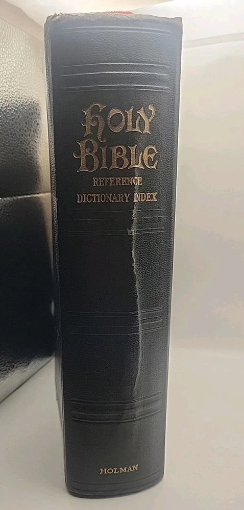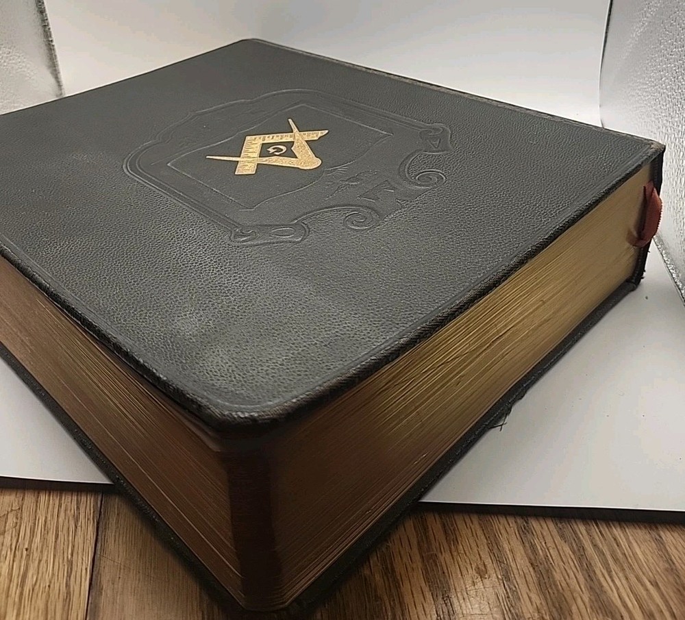 Measures approximately 11.75in x 9.5in and 3in thick. It weighs over 9lbs Has some wear and aging. Biding is in good condition. It does have a line down the spine. Some of the pages in the front and in other spots are getting frayed / torn. There are some family history pages that are completed. Two family history pages are taped. Otherwise, pages appear clean. Gold guilding on page edges is faded and has some scratches. Cover appears to be leather but isn't marked as such. Ships in a box by USPS Media Mail. Please note I often use recycled packaging materials to ship items in