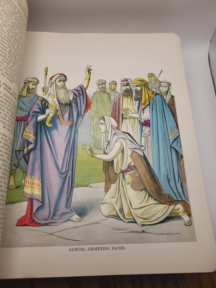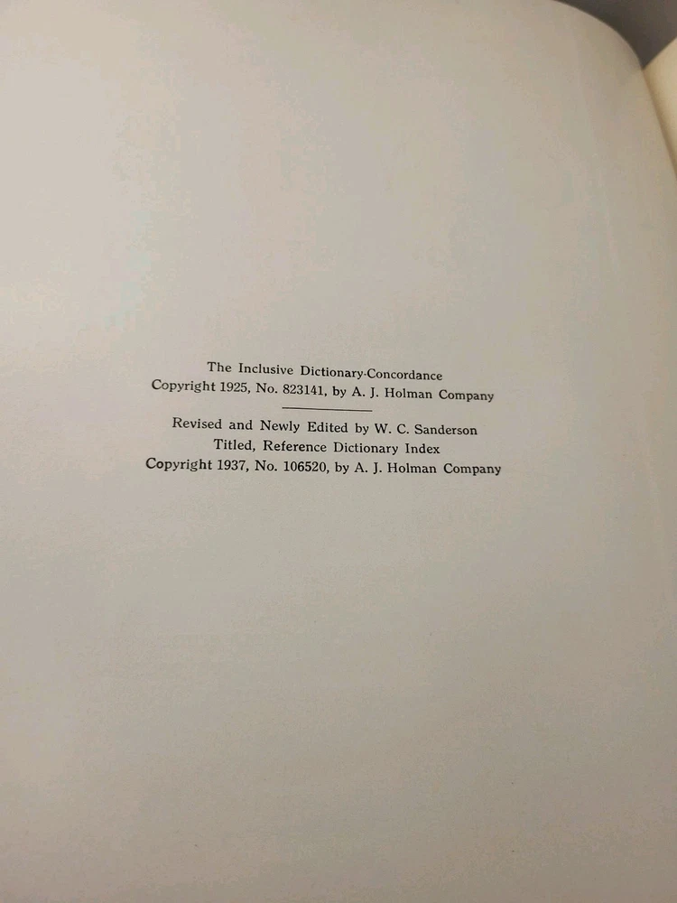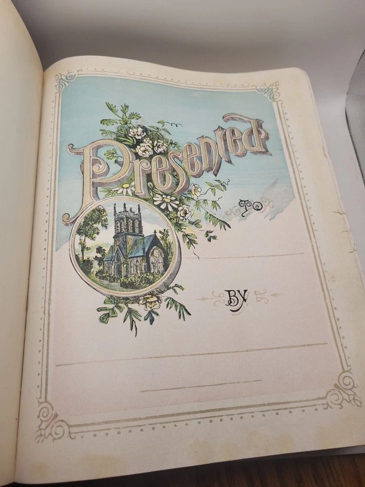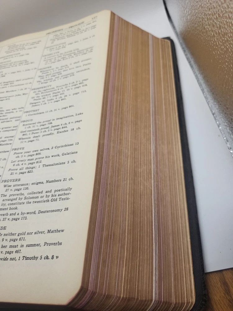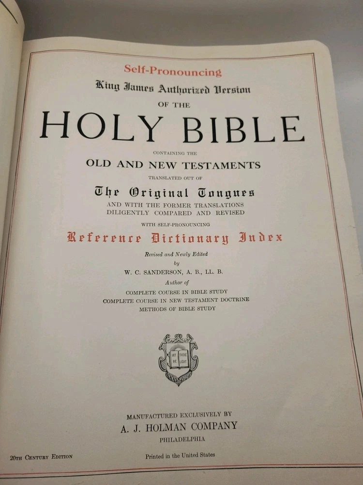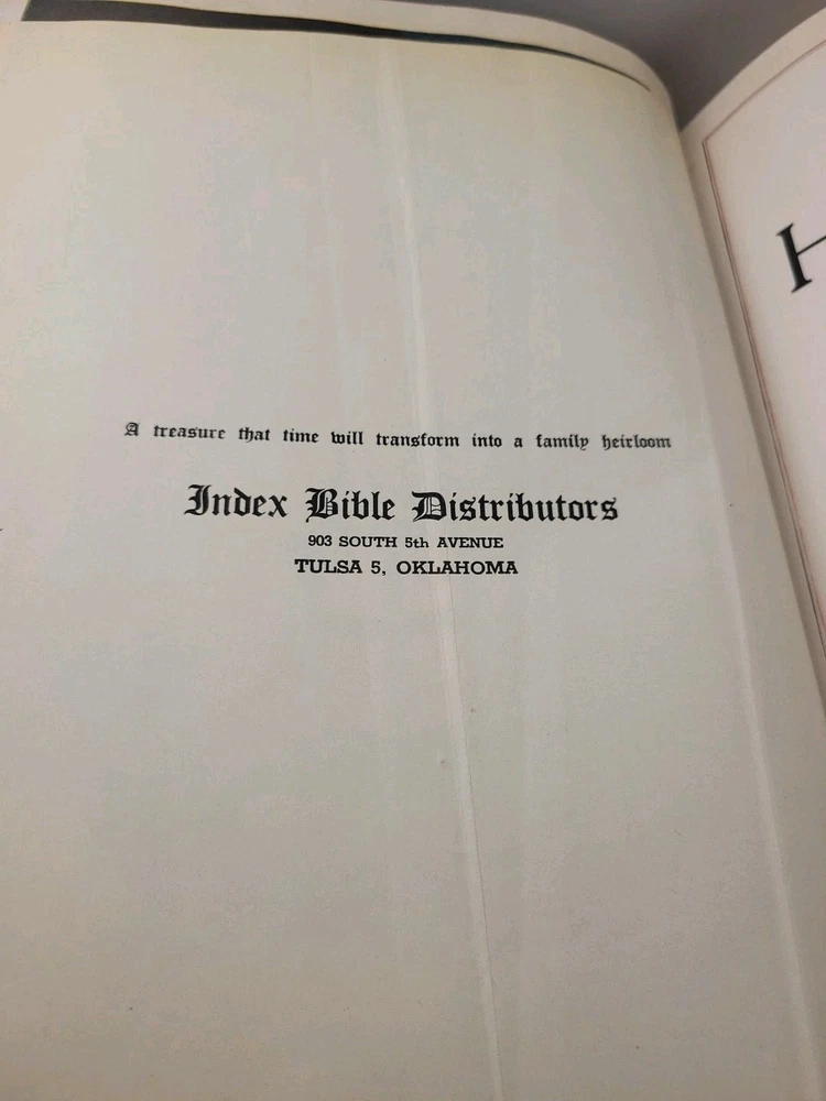 Measures approximately 11.75in x 9.5in and 3in thick. It weighs over 9lbs Has some wear and aging. Biding is in good condition. It does have a line down the spine. Some of the pages in the front and in other spots are getting frayed / torn. There are some family history pages that are completed. Two family history pages are taped. Otherwise, pages appear clean. Gold guilding on page edges is faded and has some scratches. Cover appears to be leather but isn't marked as such. Ships in a box by USPS Media Mail. Please note I often use recycled packaging materials to ship items in