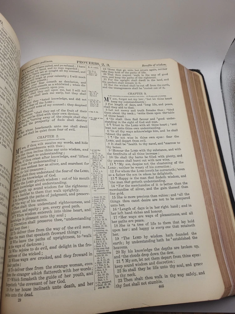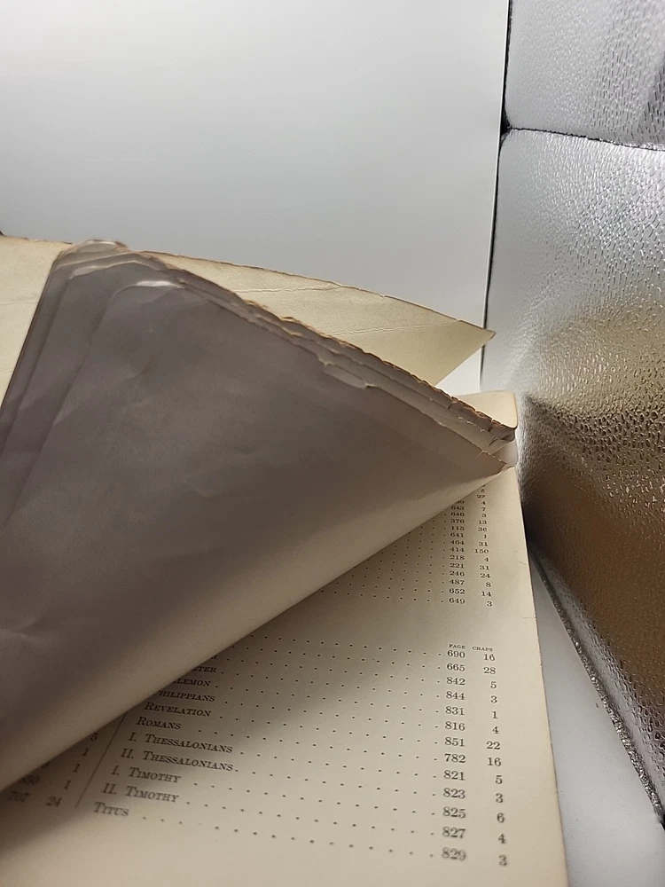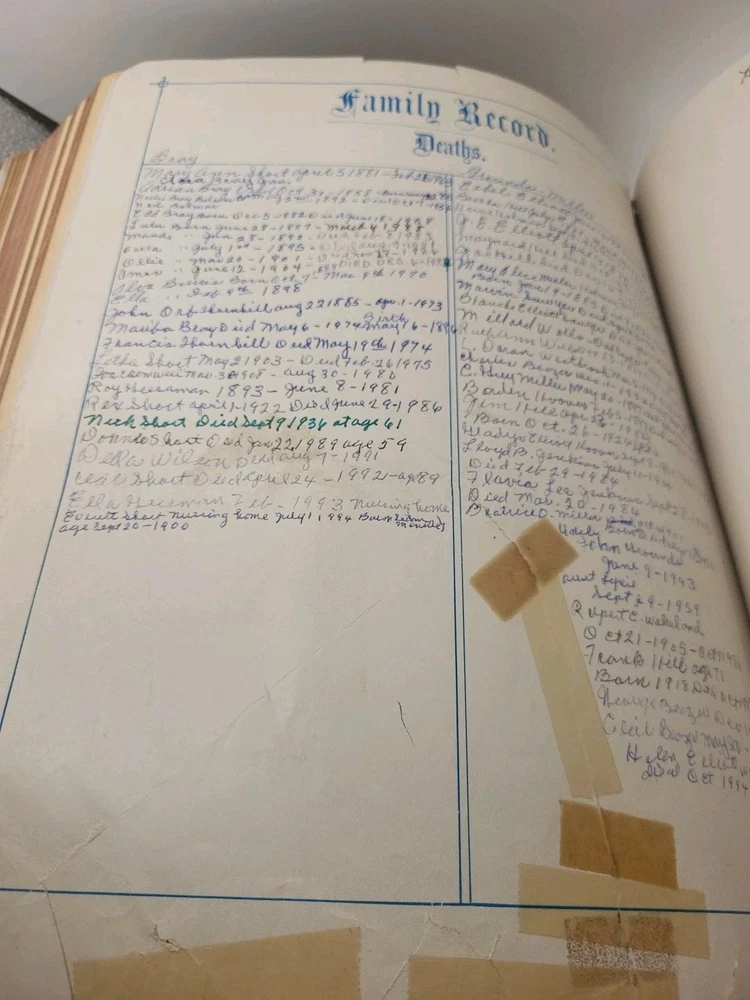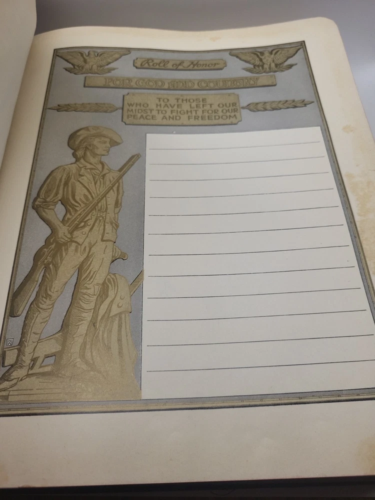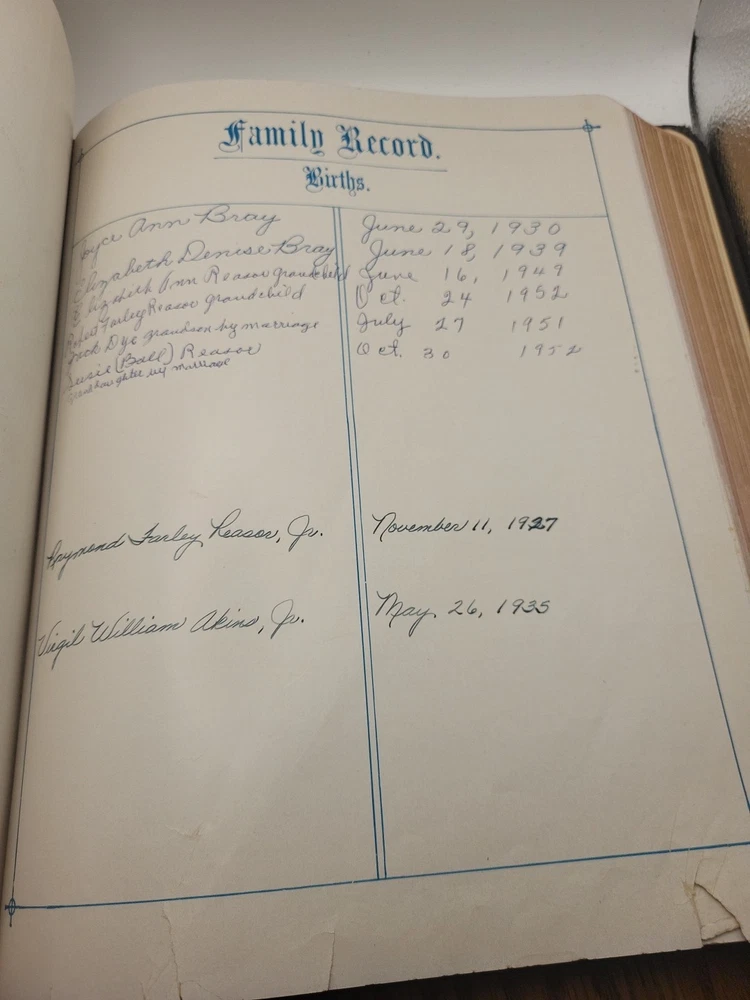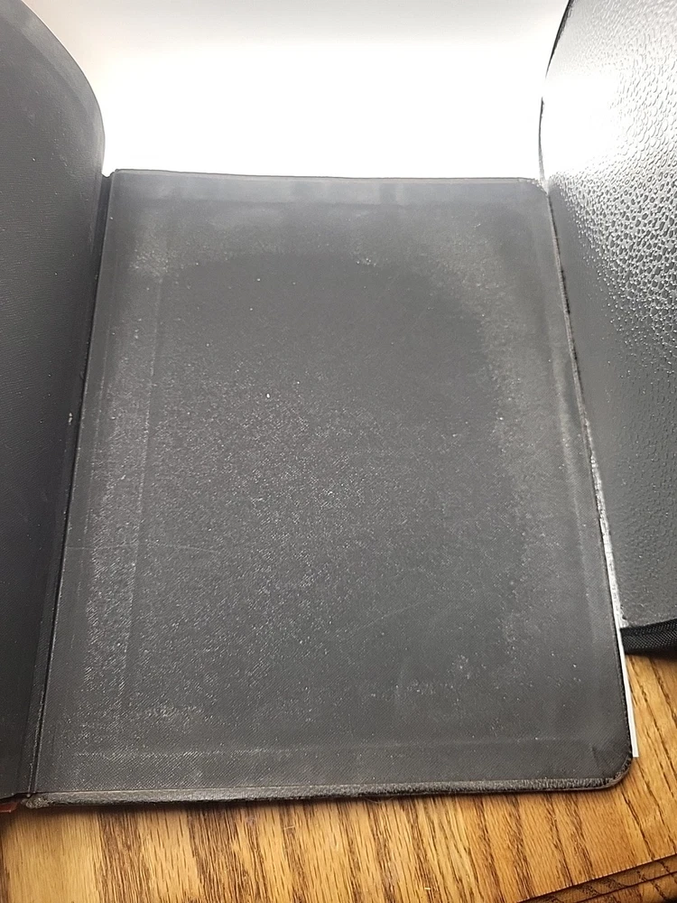 Measures approximately 11.75in x 9.5in and 3in thick. It weighs over 9lbs Has some wear and aging. Biding is in good condition. It does have a line down the spine. Some of the pages in the front and in other spots are getting frayed / torn. There are some family history pages that are completed. Two family history pages are taped. Otherwise, pages appear clean. Gold guilding on page edges is faded and has some scratches. Cover appears to be leather but isn't marked as such. Ships in a box by USPS Media Mail. Please note I often use recycled packaging materials to ship items in