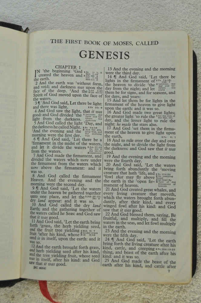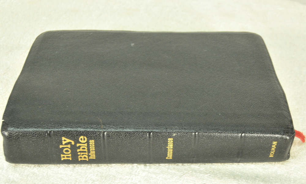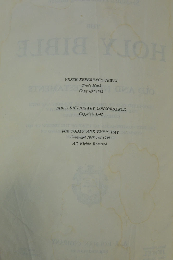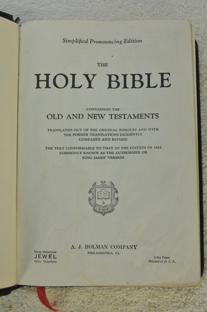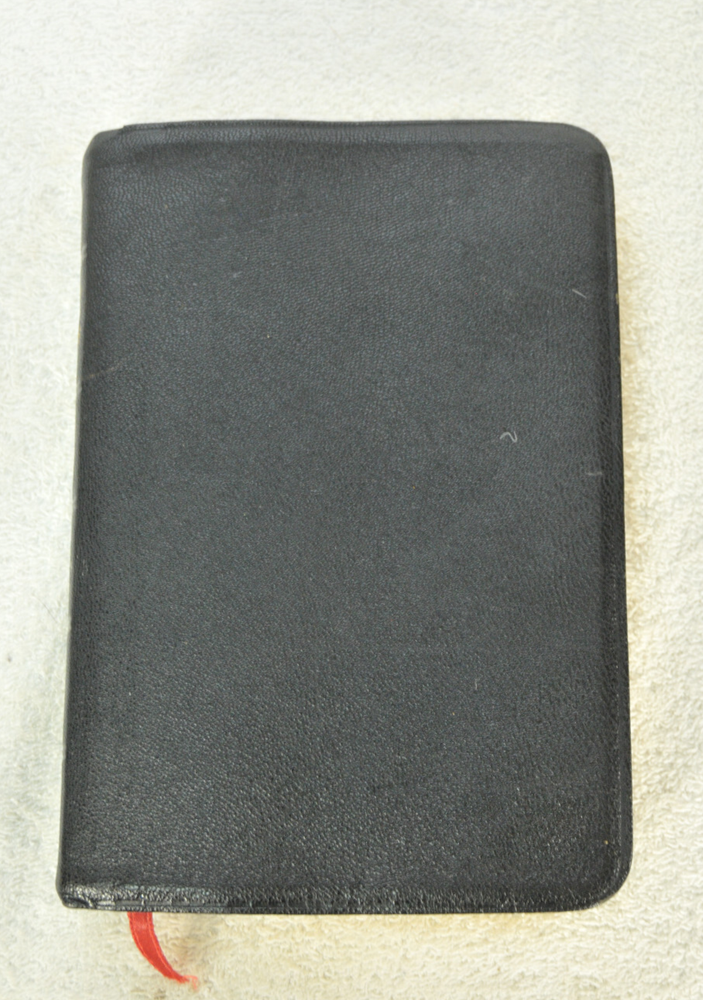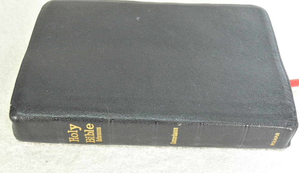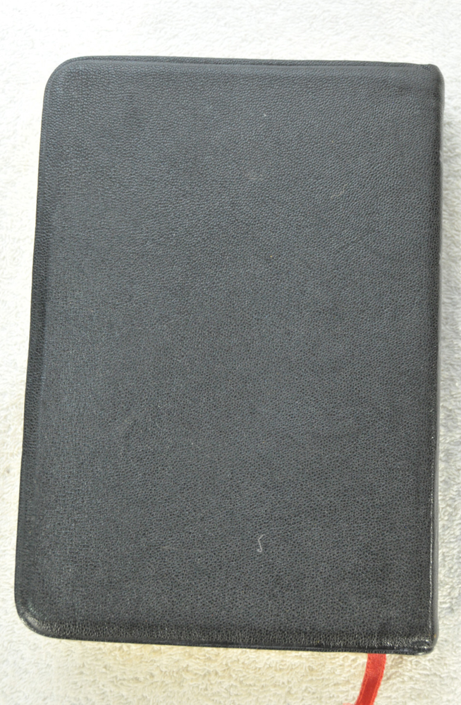 Holy Bible Jewel Verse Reference Edition King James Version Black Morocco Leather Holman Copyright 1949. The Bible measures approximately 8 x 5.5 x 1.5 inches. It is a handy and convenient size for carrying and personal use. Good pre-ownd condition. Presentation page completed with ink pen dated 1953. Minor wear to pages at front of Bible. The early pages are not flat and crisp and just show evidence the Bible has had normal usage. No hand writings or markings inside this Bible. The leather cover is soft and flexible and has a very nice feel to it. This Bible is now approximately seventy five years old and still looks good reflecting its quality construction when it was first manufactured. Please see all photos for details and condition.