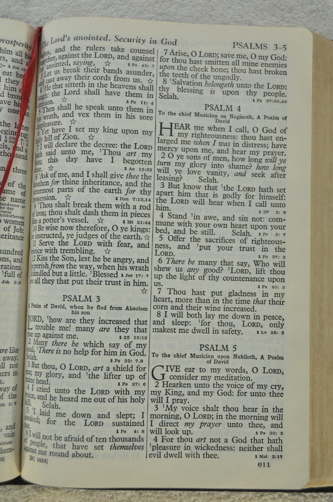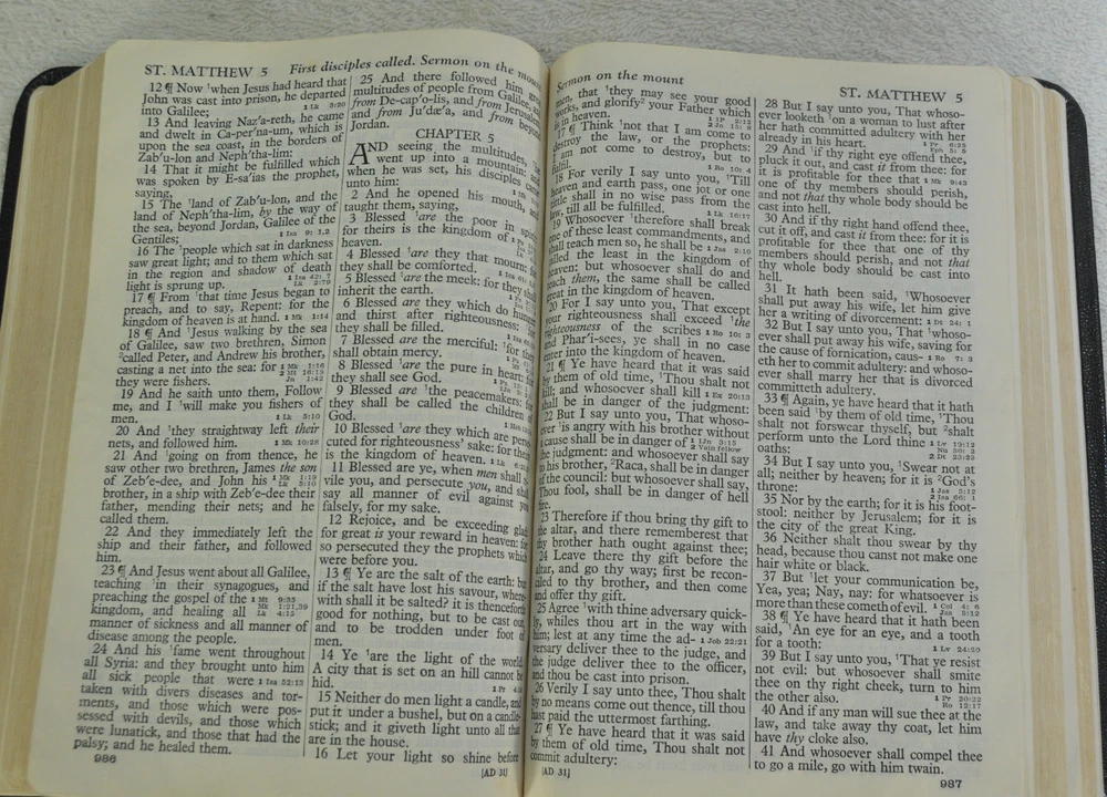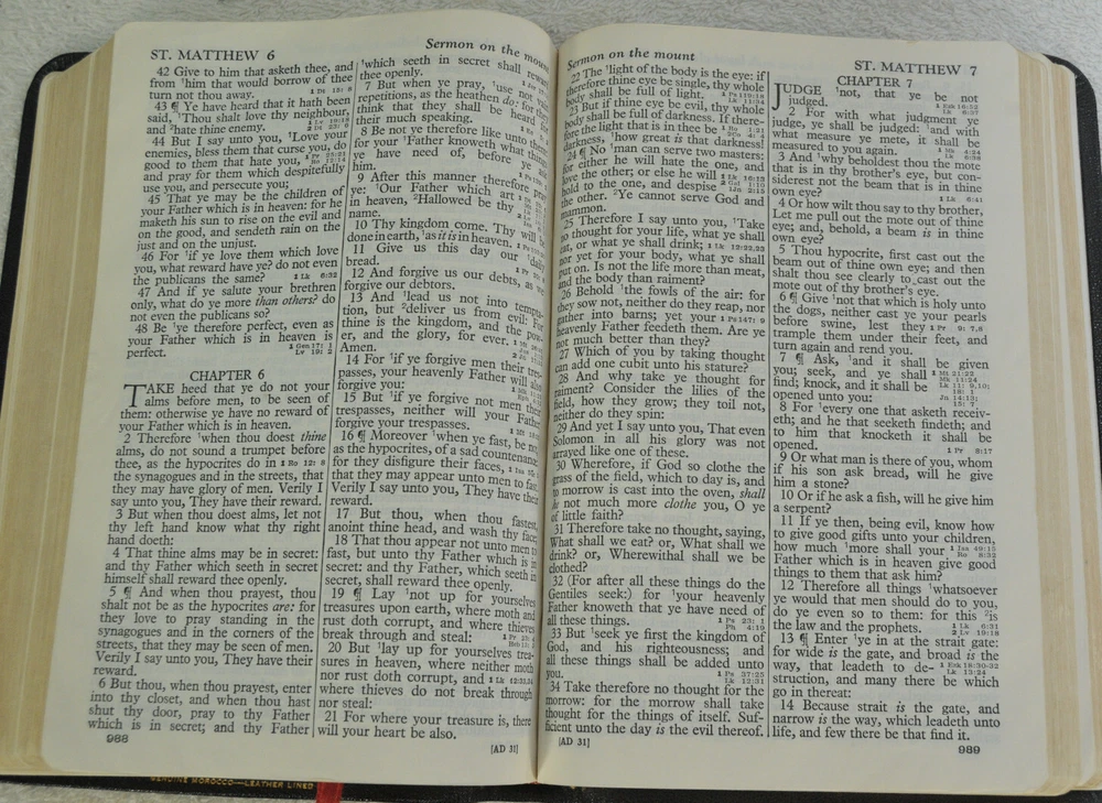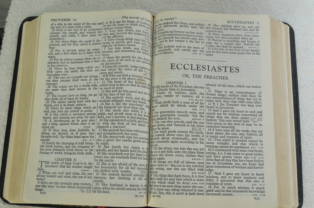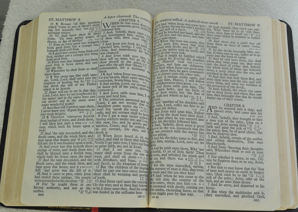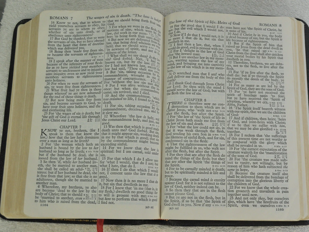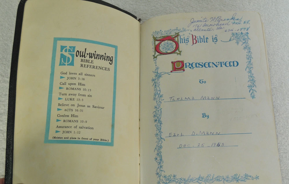 Holy Bible Jewel Verse Reference Edition King James Version Black Morocco Leather Holman Copyright 1949. The Bible measures approximately 8 x 5.5 x 1.5 inches. It is a handy and convenient size for carrying and personal use. Good pre-ownd condition. Presentation page completed with ink pen dated 1953. Minor wear to pages at front of Bible. The early pages are not flat and crisp and just show evidence the Bible has had normal usage. No hand writings or markings inside this Bible. The leather cover is soft and flexible and has a very nice feel to it. This Bible is now approximately seventy five years old and still looks good reflecting its quality construction when it was first manufactured. Please see all photos for details and condition.