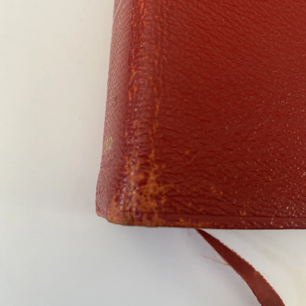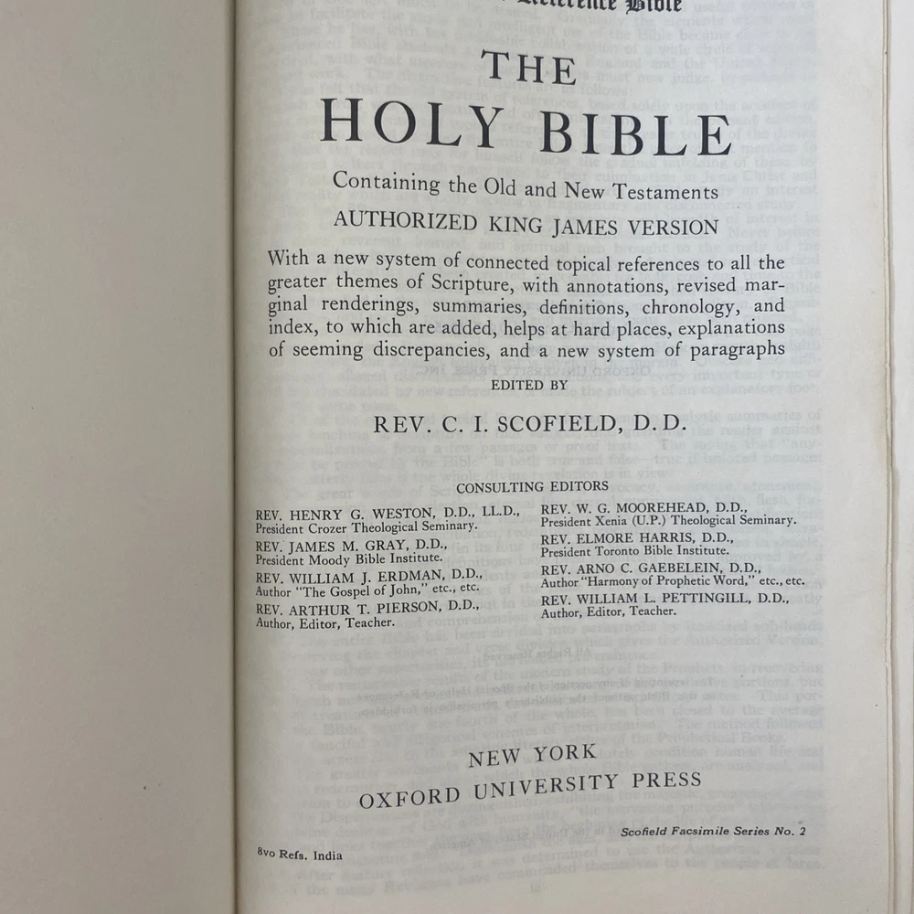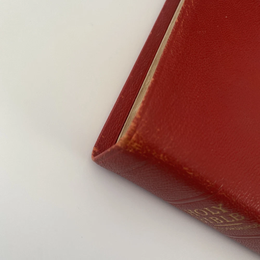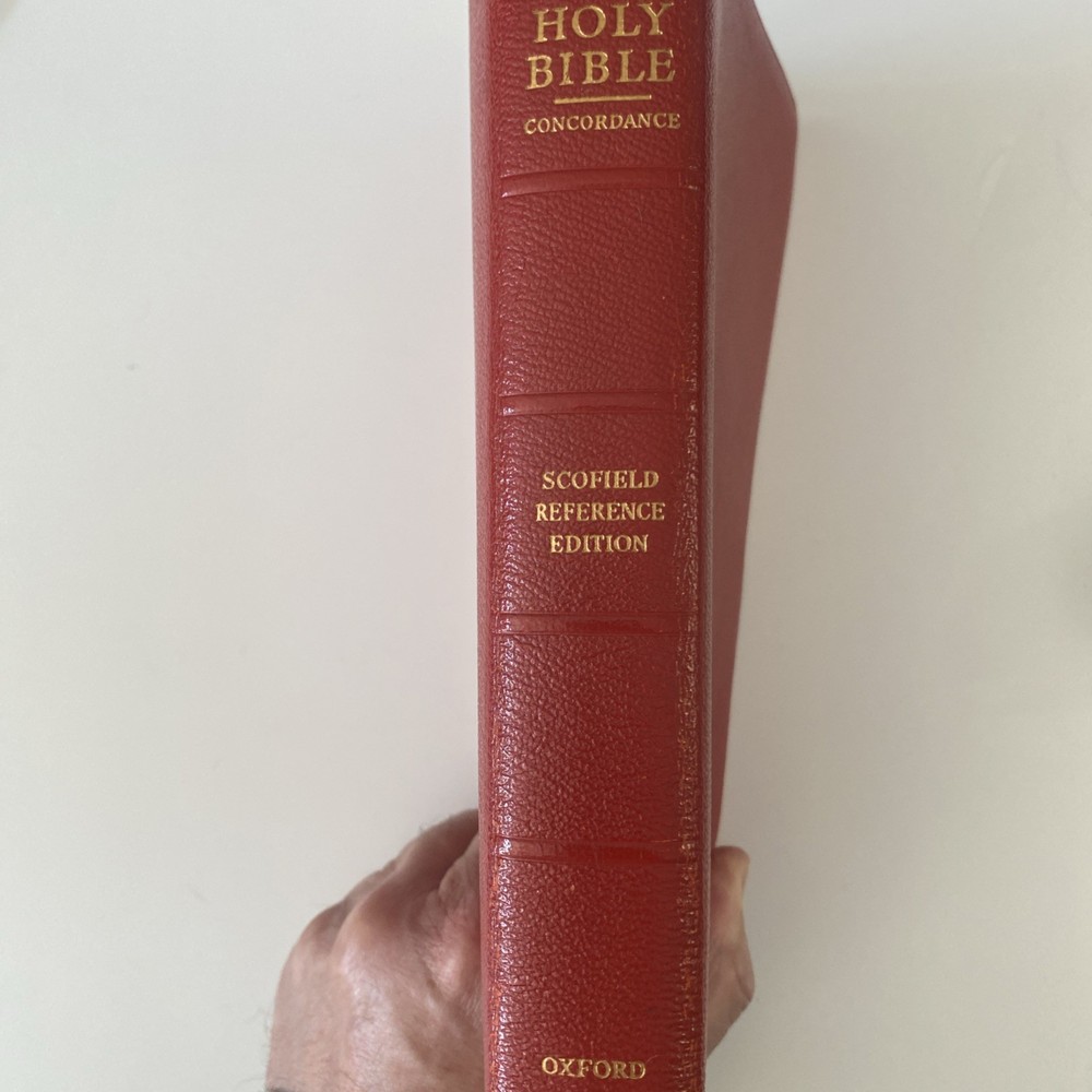Beautiful red Morocco bonded leather cover. Some writing and an inscription. Personalized with previous owners name on cover. See pictures. This edition is prized for its study notes and commentary. This is a Holy Bible KJV 1945 Oxford Scofield Reference Edition made in the United States. It features genuine cowhide leather, gold gilt pages, and double column-center column references. The book measures 6 inches in length, 9 inches in height, and 1 inch in width, with a weight of 28 ounces. The publication year is 1945 and the book is in the nonfiction genre, with a topic of Christianity. The book is in a vintage condition and is a prayer study type.