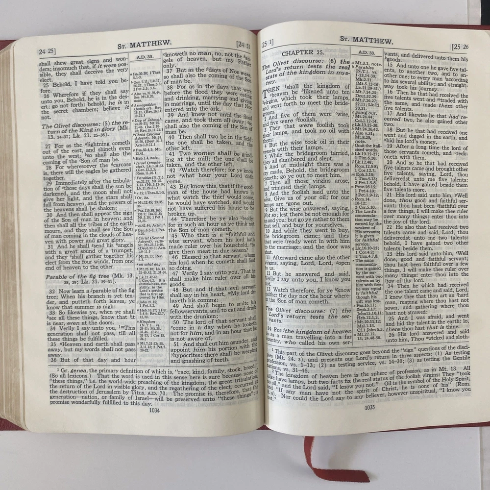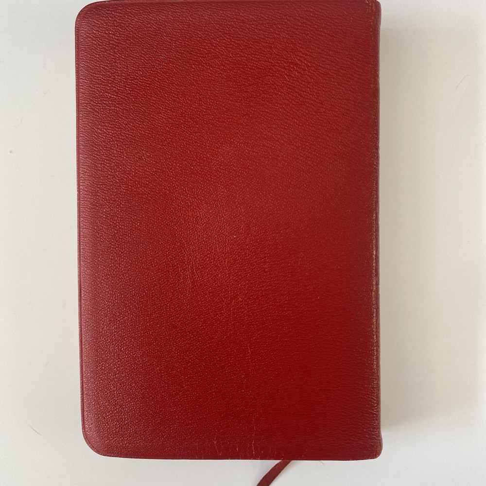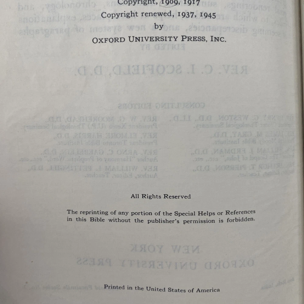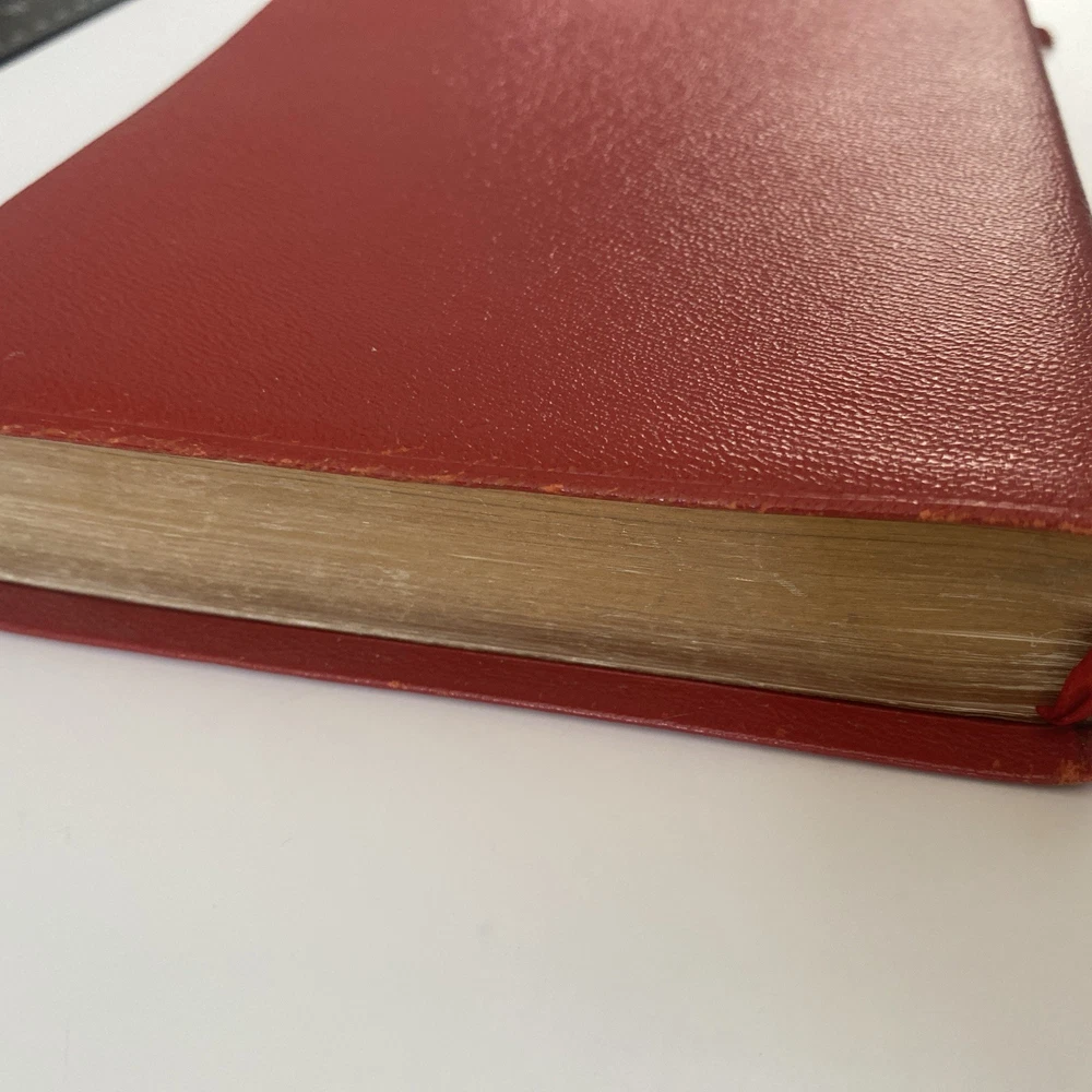 Beautiful red Morocco bonded leather cover. Some writing and an inscription. Personalized with previous owners name on cover. See pictures. This edition is prized for its study notes and commentary. This is a Holy Bible KJV 1945 Oxford Scofield Reference Edition made in the United States. It features genuine cowhide leather, gold gilt pages, and double column-center column references. The book measures 6 inches in length, 9 inches in height, and 1 inch in width, with a weight of 28 ounces. The publication year is 1945 and the book is in the nonfiction genre, with a topic of Christianity. The book is in a vintage condition and is a prayer study type.