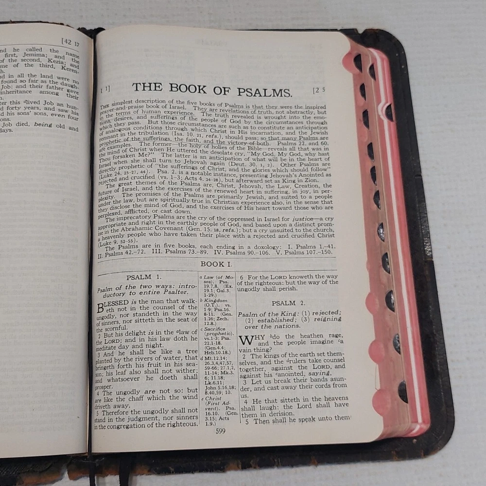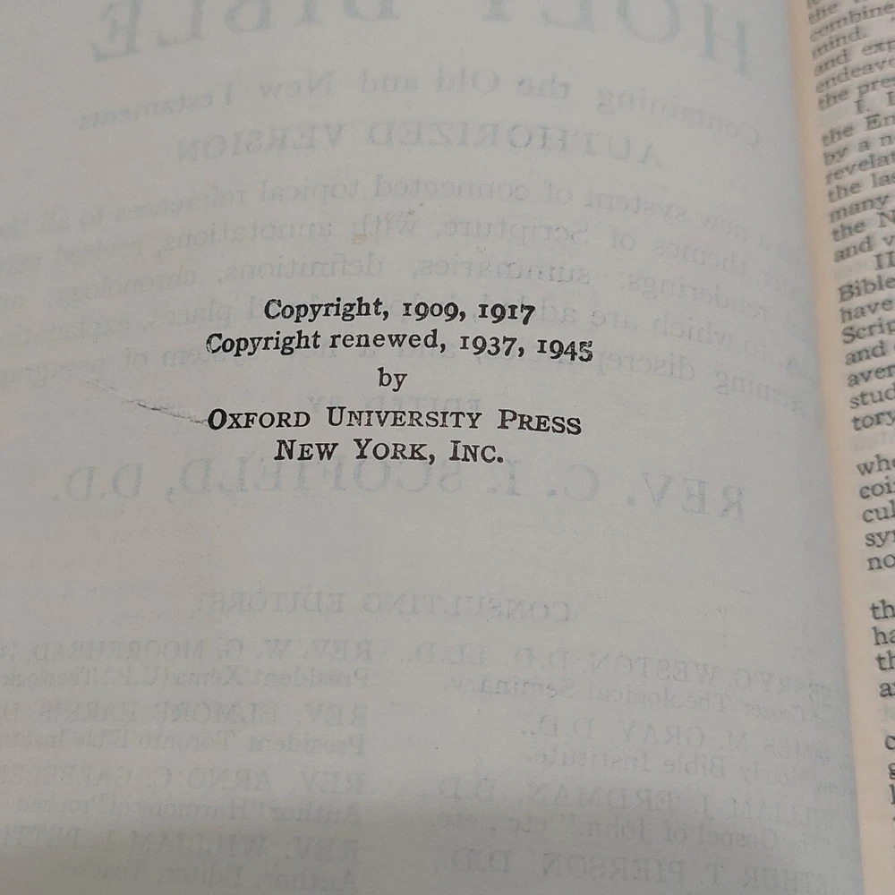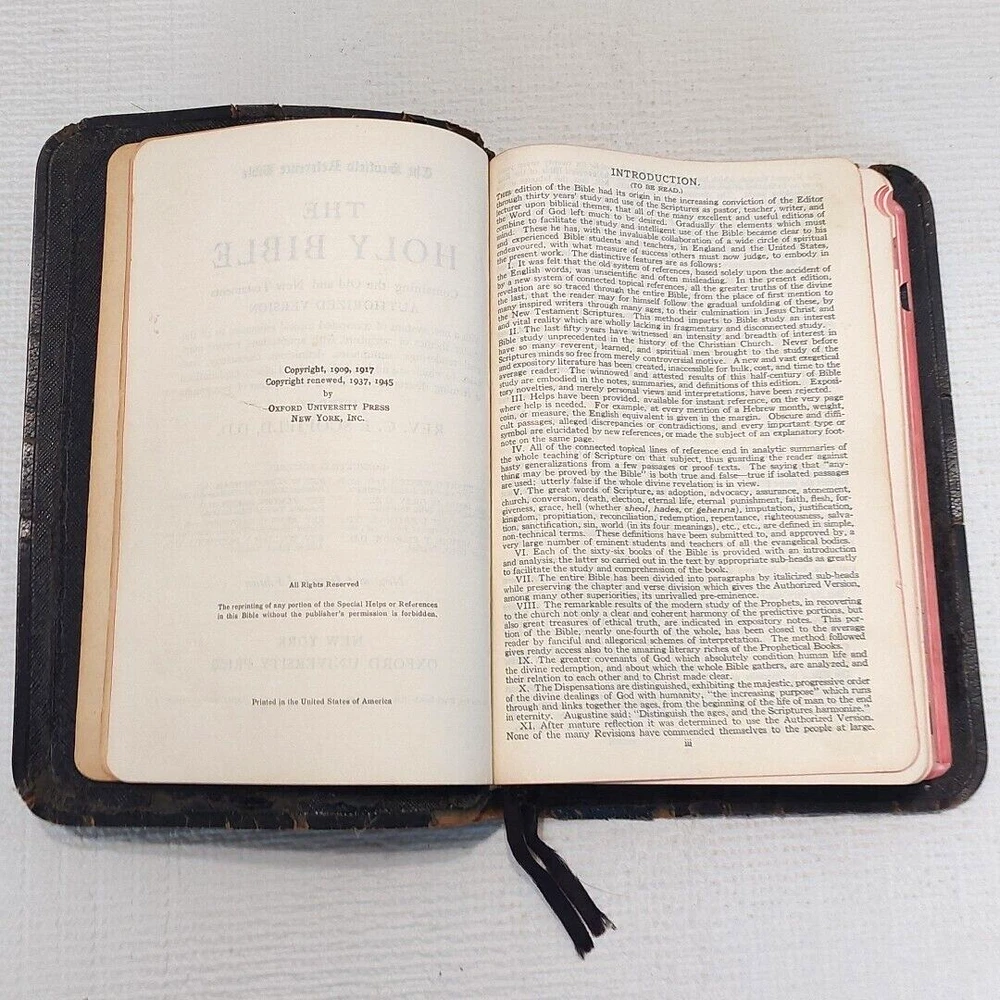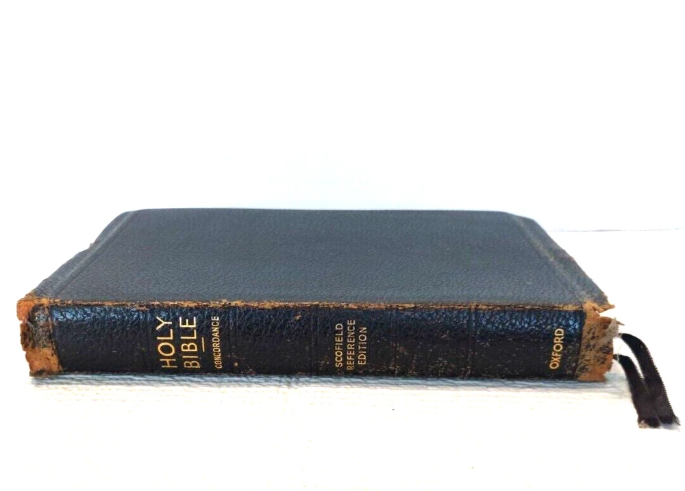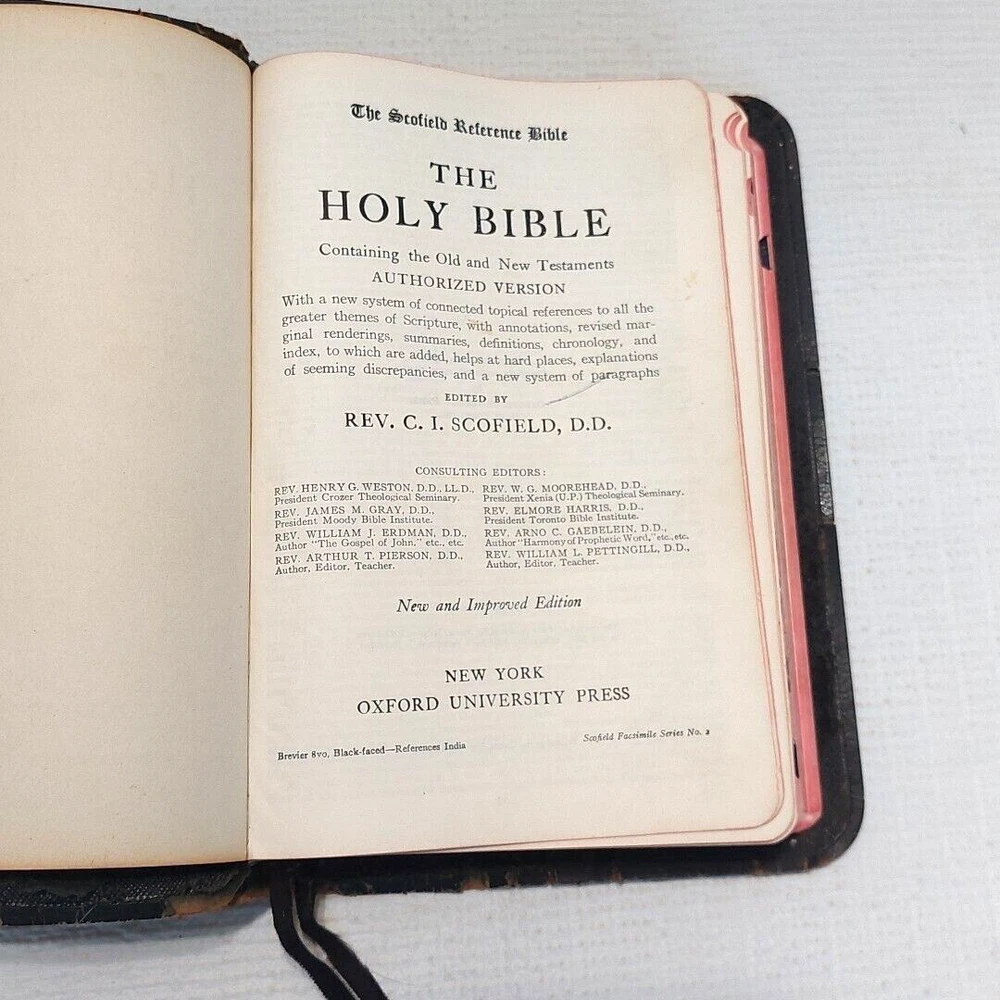 HOLY BIBLE - SCOFIELD REFERENCE EDITION This 1945 Holy Bible Scofield Reference Edition is a timeless treasure for anyone seeking spiritual growth and understanding. With its vintage Oxford University Press publication year its Morocco leather format adds to its durability and beauty, making it a perfect addition to any library or personal collection. Condition: The Bible is in used condition. The cover shows some damage and wear. There is some writing on the inside 1st page; other than that, I do not see any writing or highlighting on the inside pages. Fast shipping: I ship 5 days per week and sometimes on Saturdays so that you receive your item quickly. Thank you for shopping with Christine's Vintage Deals!