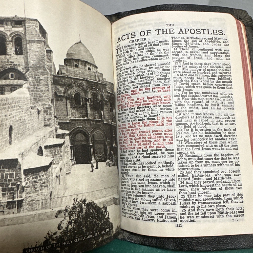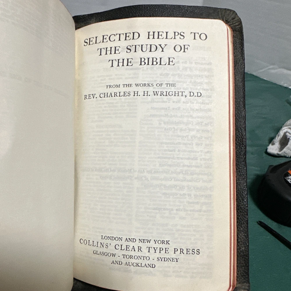 This is an exquisite edition of the Holy Bible in the King James Version. The Bible is beautifully bound in genuine leather covers, making it a perfect addition to any book collection. Published by Collins in 1949, the book includes red-letter indexed pages. The Bible measures 5 inches in length, 8 inches in height, and 1.5 inches in width, making it a convenient size for travel or home use. The book is written in English and covers the topic of religion and spirituality. This vintage book is perfect for young adults and adults alike, and the narrative type is nonfiction.