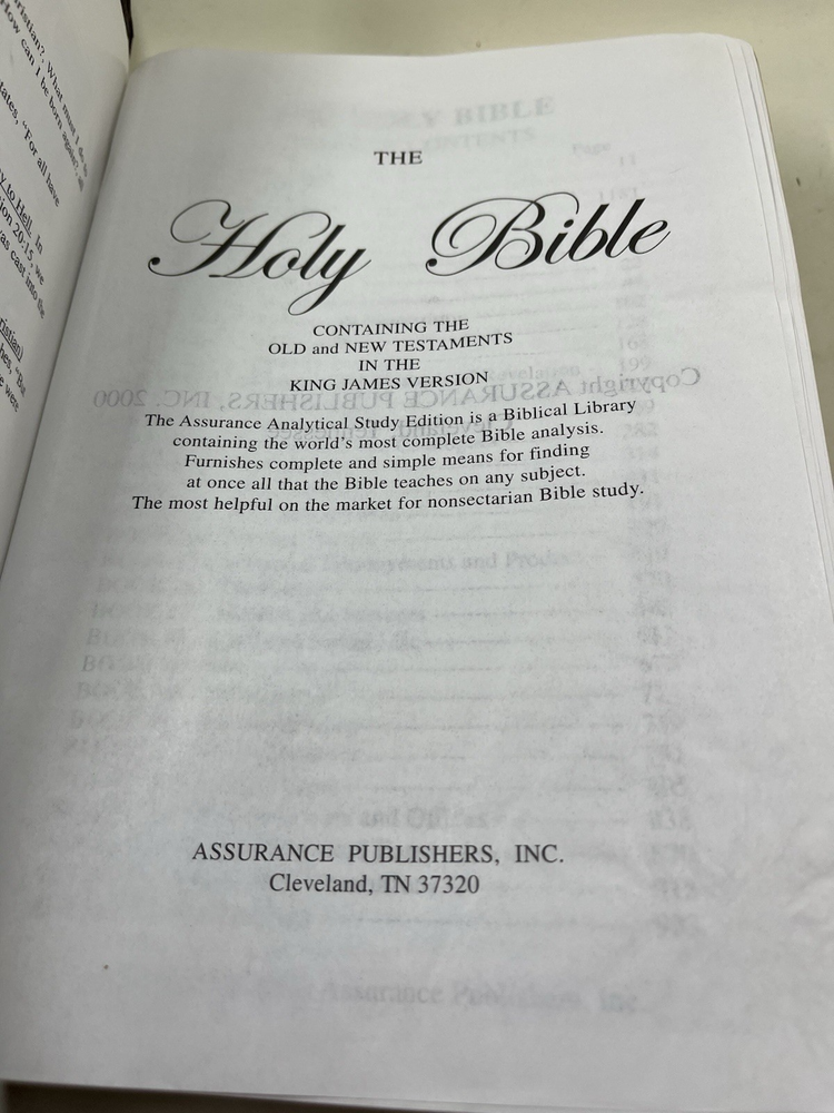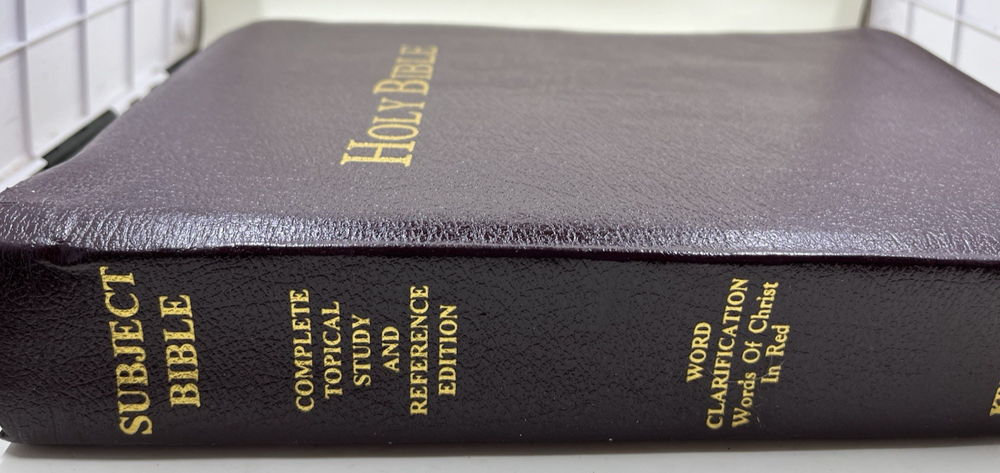 The Holy Bible Subject Bible Complete Topical Study and Reference Edition Word Clarification Words of Christ in Red King James Version. The Assurance Analytical Study Edition is a Biblical Library containing the world's most complete Bible analysis. Furnishes complete and simple means for finding at once all that the Bible teaches on any subject. Large Print Burgundy Faux Leather 2000 Assurance Publishers, pre-owned.