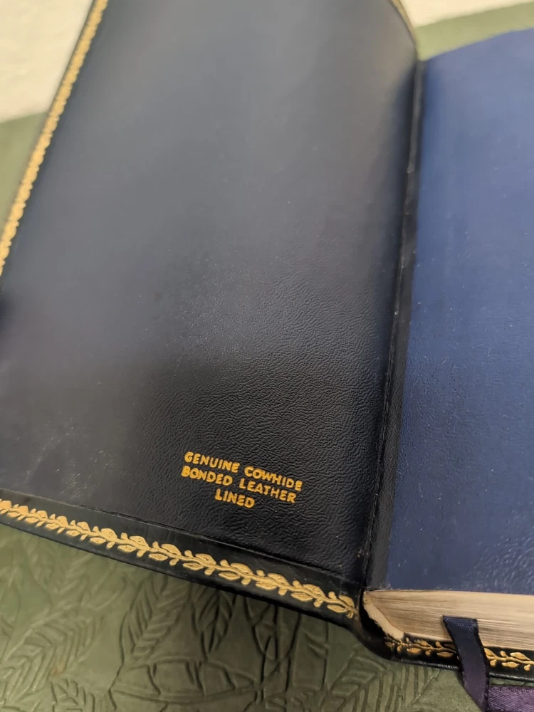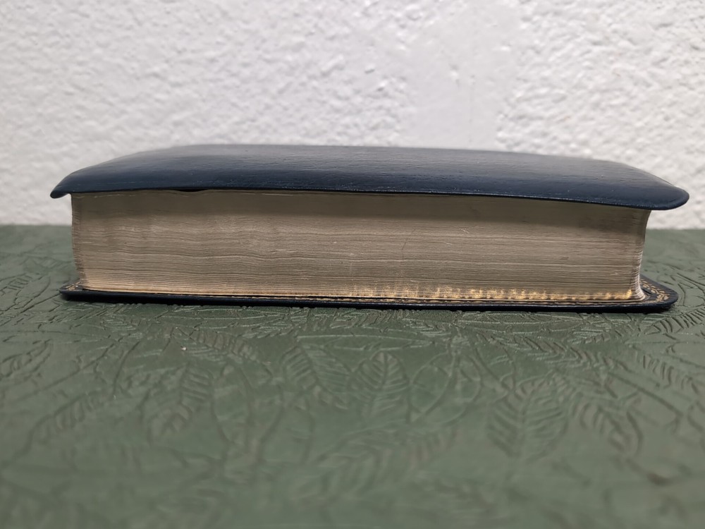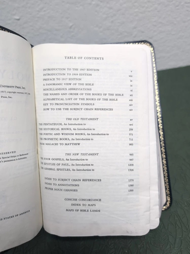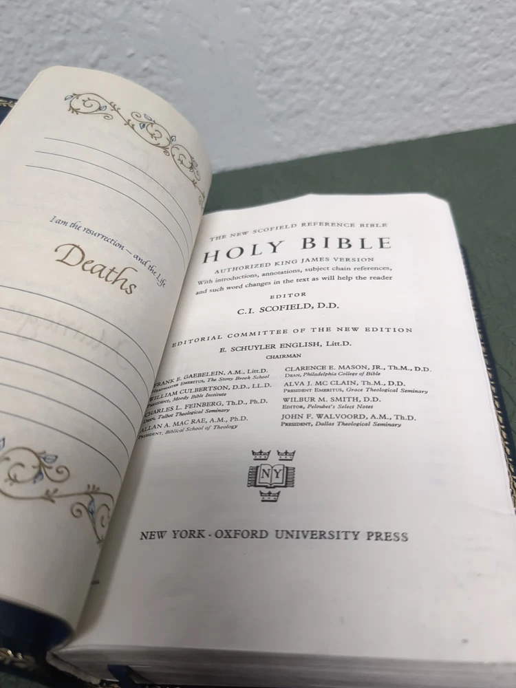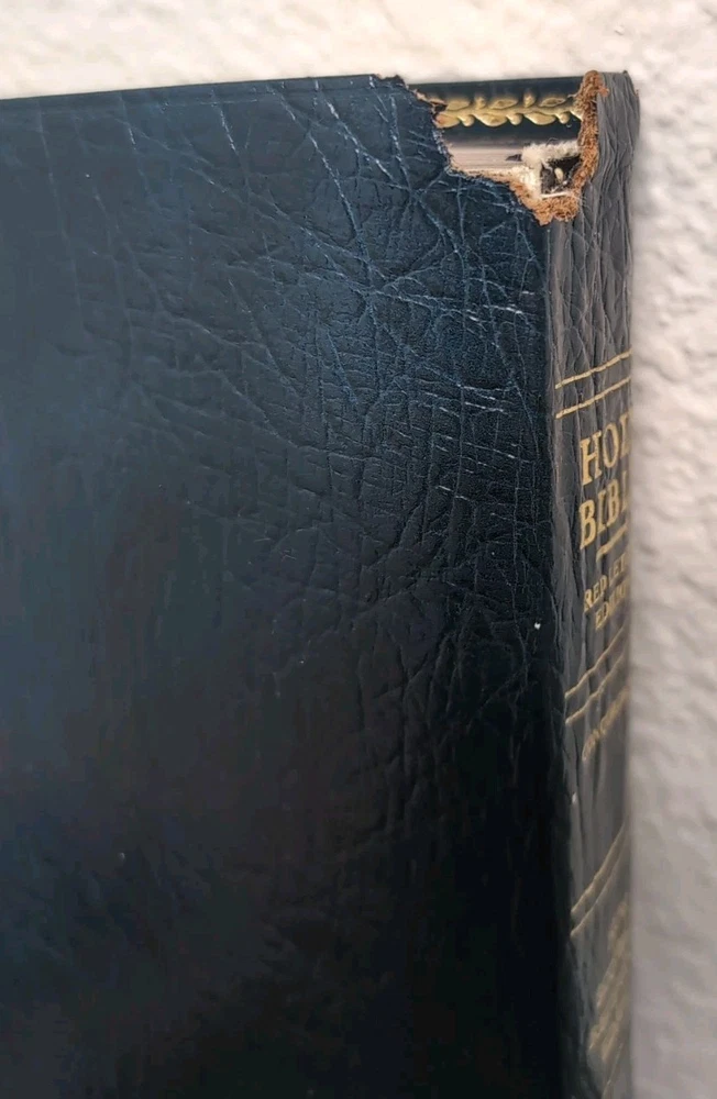 Bible is in good condition but does have some damage on the outside as shown. There may have been some light water damage on the first few pages as shown in last picture....