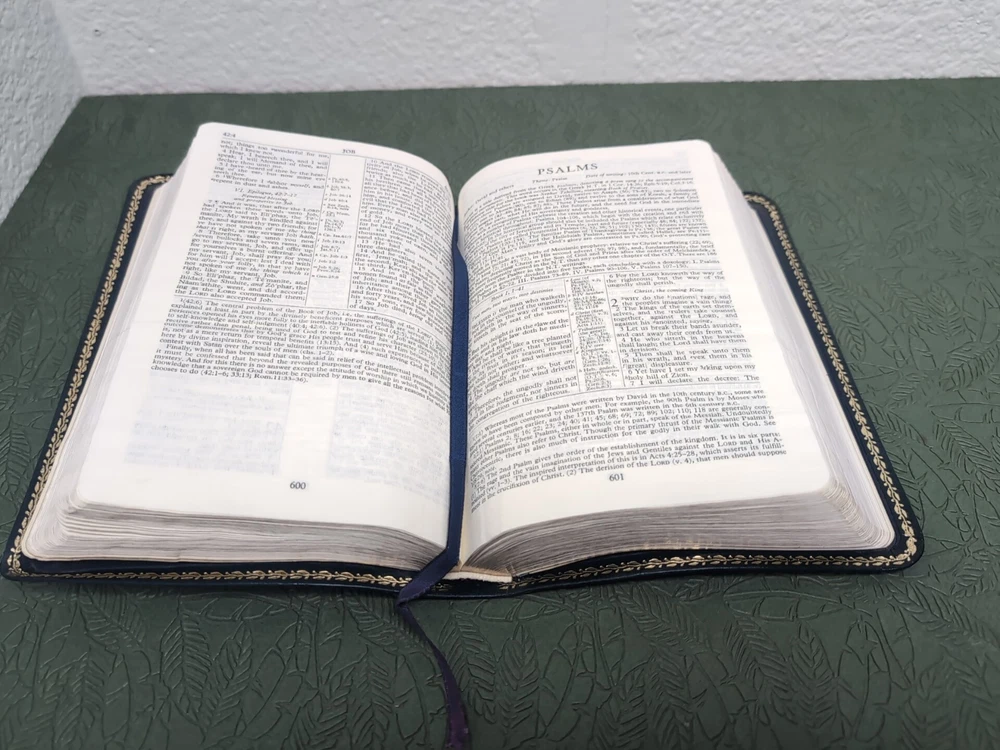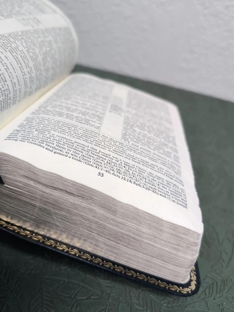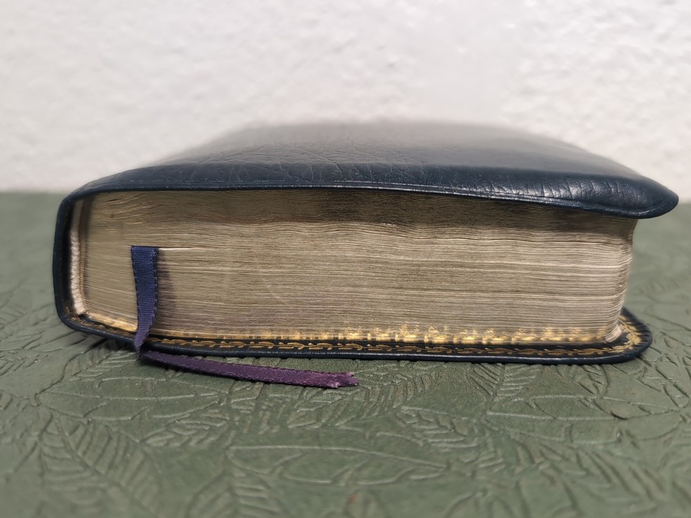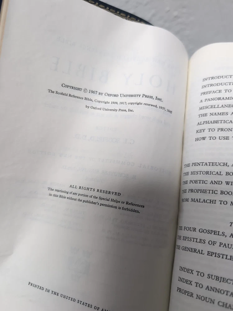 Bible is in good condition but does have some damage on the outside as shown. There may have been some light water damage on the first few pages as shown in last picture....