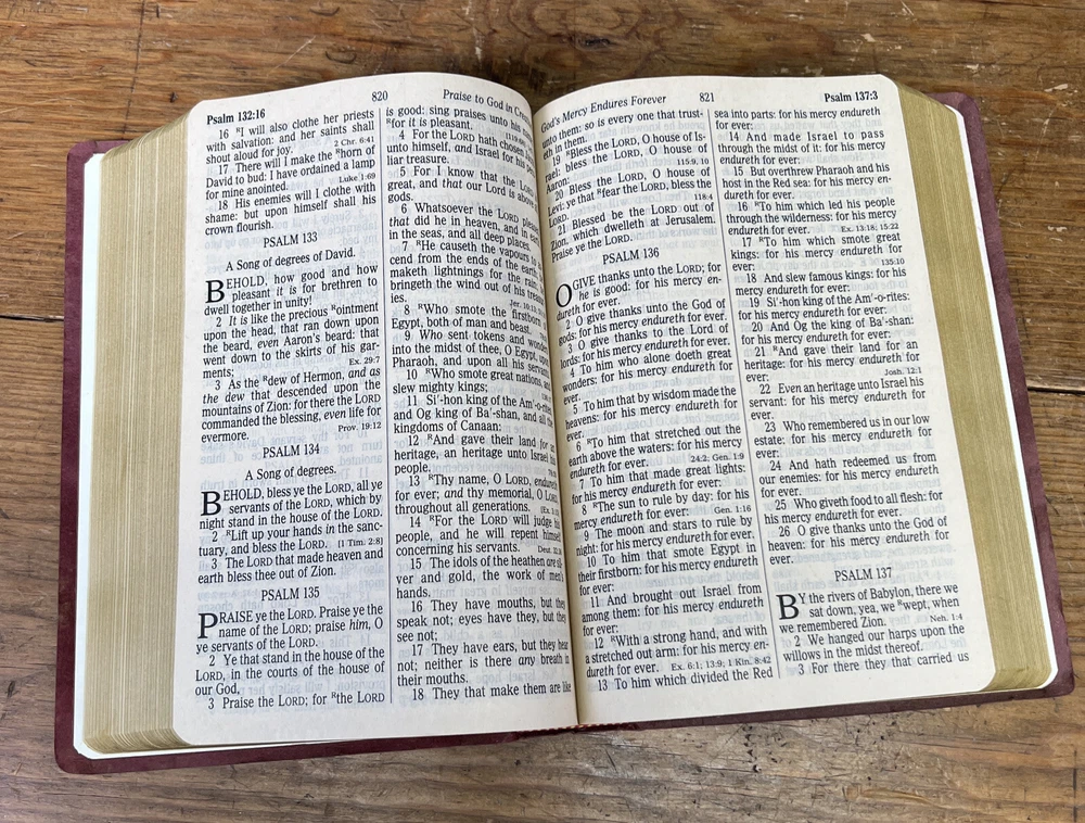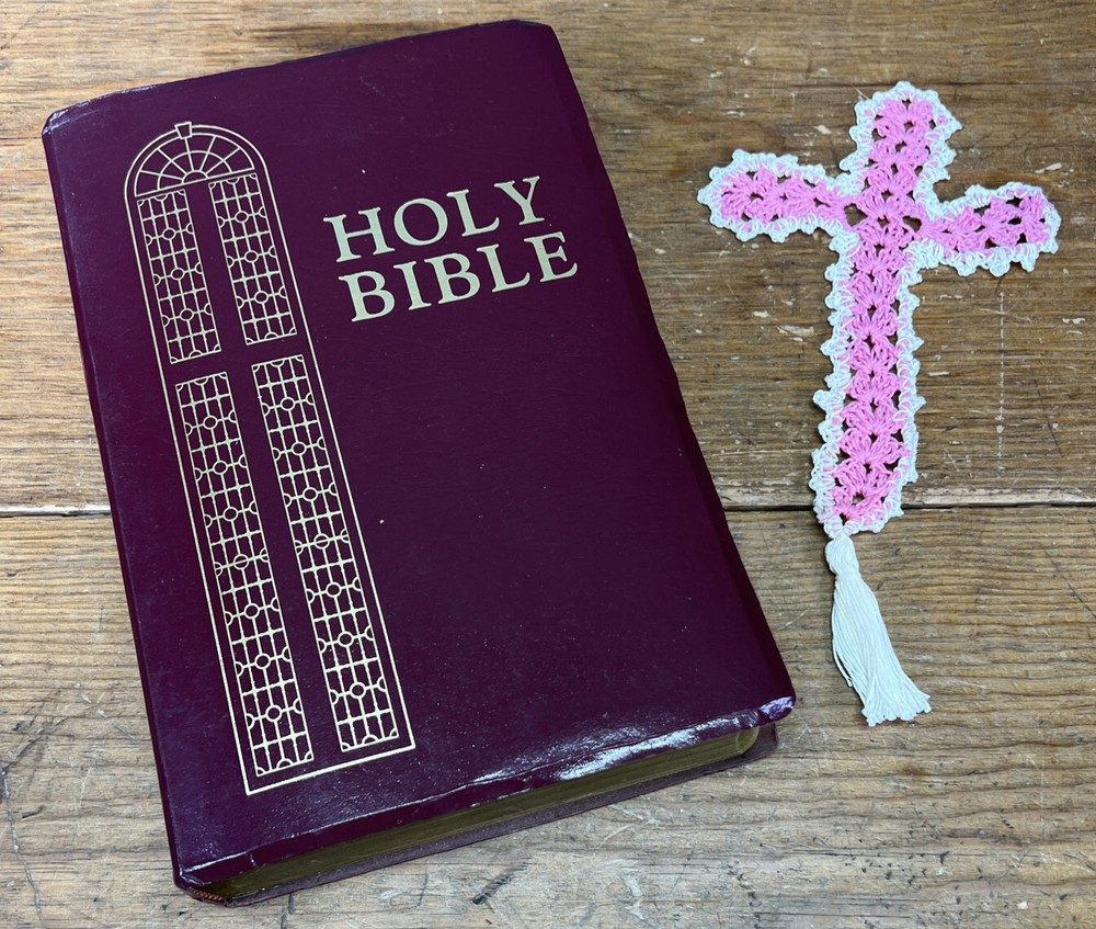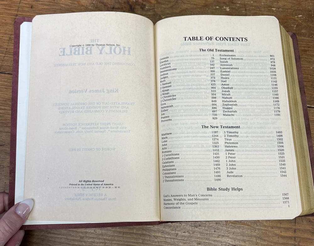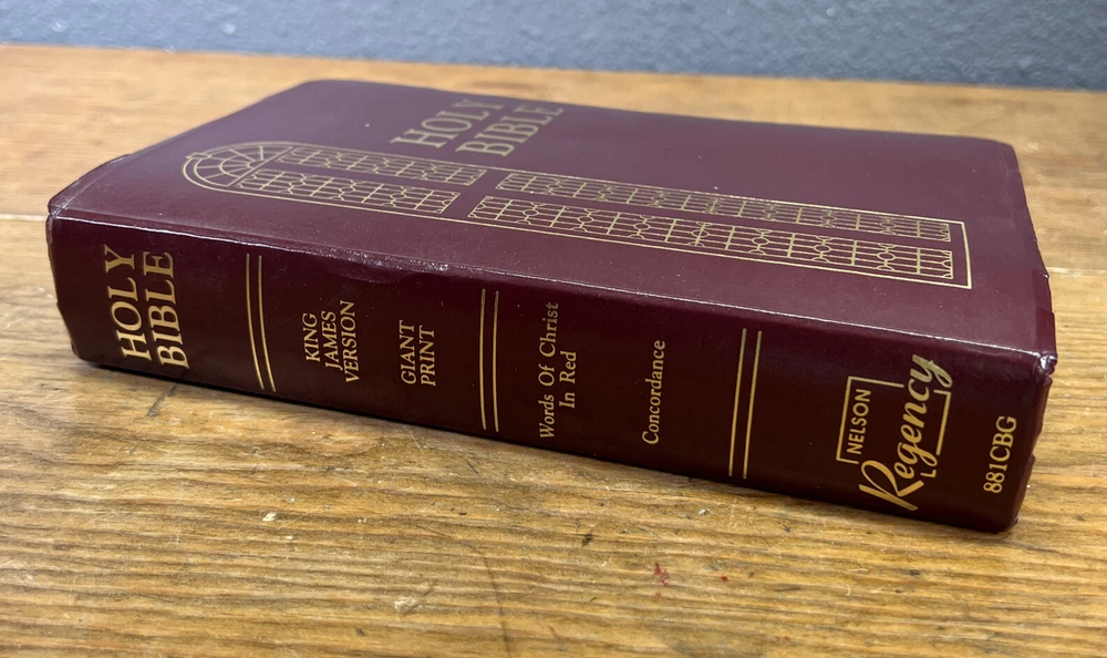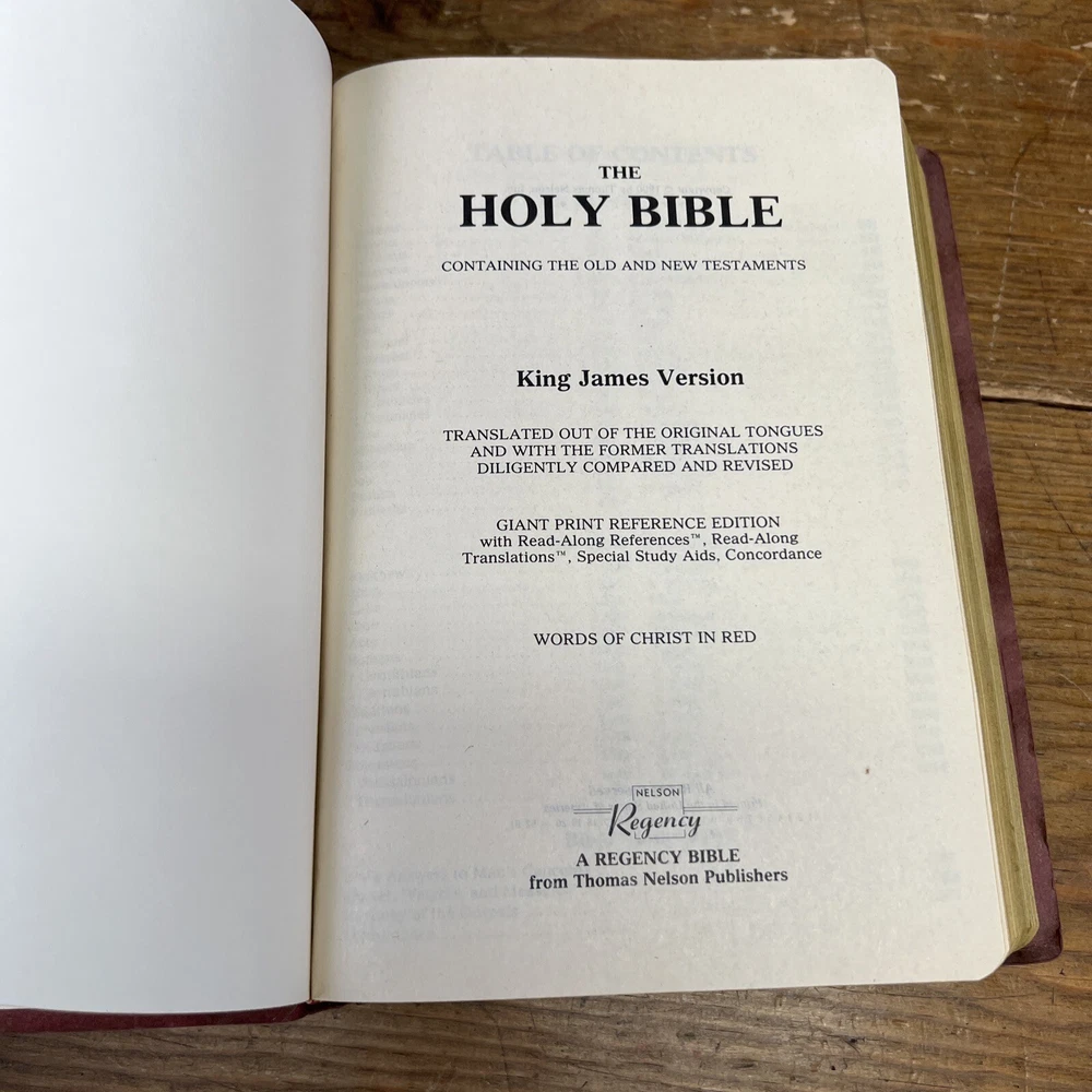 This beautifully bound book contains the most important and influential text in Western culture. Its timeless message has been inspiring readers for centuries. The edition I am offering is a King James Version, published by Thomas Nelson in 1990. In addition to its spiritual significance, this Bible is a work of art. It features a faux leather cover that is both durable and beautiful. The giant print allows for easy reading, and the red lettering highlights the words of Jesus. This is a must-have for anyone interested in spirituality or religious studies. Knitted Cross bookmark included. See photos there is a name written on front page.