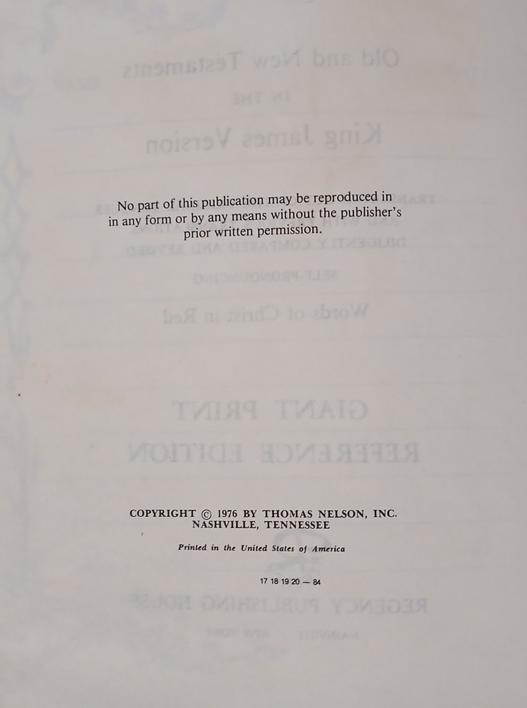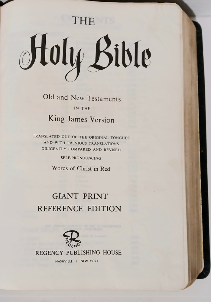 Great Condition Holy Bible KJV Giant Print Reference Concordance Red Letter Regency 883 Nelson 1976 The Thomas Nelson KJV Pew Bible Large Print Edition has long been a trusted and durable Bible for use in churches and various worship settings. This edition is published in Giant KJV Comfort Print type, which was designed exclusively for Thomas Nelson to be the most readable at any size. The classic King James Version, one of the most influential and beautiful works of art in the English language, continues to be the standard translation for numerous churches and millions of Christians. This bestselling Bible translation has helped inspire, encourage, and strengthen people from all walks of life. Invite your eyes to linger and engage God's Word with new, easy-to-read Comfort Print(R) KJV Bibles from Thomas Nelson. Blending modern technology with old-world craftsmanship, Comfort Print(R) KJV Bibles are designed with exclusive fonts, reflecting the beautiful and timeless character of the King James translation, to enhance your scripture reading experience. Bullet points: Words of Christ in red help you quickly identify Jesus' teachings and statements Miracles and parables of Jesus call out important events during Jesus' earthly ministry Easy-to-read Giant KJV print.
