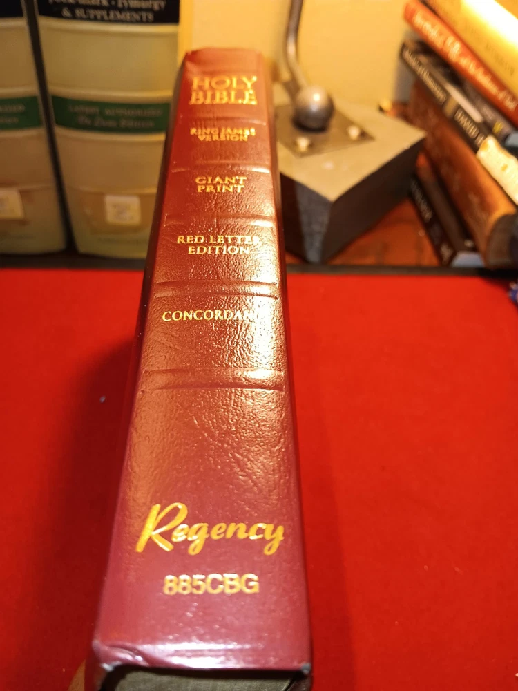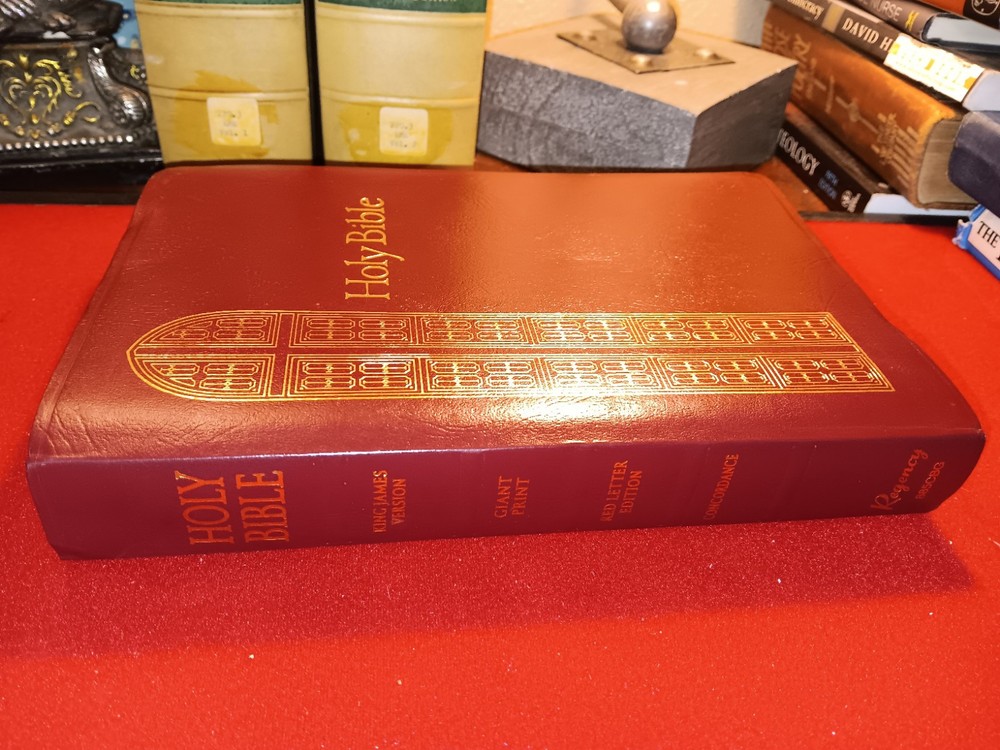 The Holy Bible KJV Giant Print Regency Reference Concordance Red Letter is a leather-like Bible published by Thomas Nelson in 1990. It features large print text, faux leather binding, and red lettering for the words of God. The book is authored by God and is written in English, making it easily accessible to readers. This Bible is designed for those looking for a larger, easy-to-read version of the King James Version with additional reference tools and features.