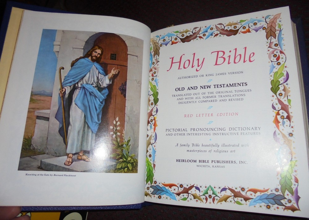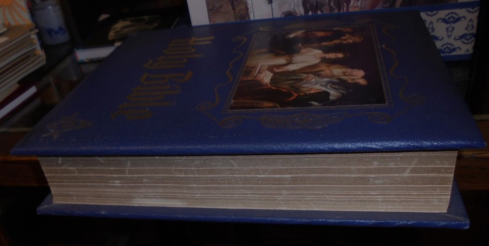 Large Bible: Very lightly rubbed. Strong binding. 1 notation on the flyleaf and names filled in on the presentation page. No other markings....