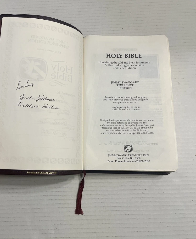 The Holy Bible KJV Jimmy Swaggart Reference Edition in Large Print Leather is a vintage Bible published by Jimmy Swaggart Ministries. This English language Bible features large print text and is bound in leather, making it a durable and stylish edition. With a reference edition design, this Bible is intended for young adults and adults looking for a spiritual and religious guide. Only writing I see are names on first pages. A nice Bible. See photos. FROM A SMOKE FREE HOME… Check out my other items! I have good and different items. I usually have a good number of nice Bibles. Remember to save me as a seller and check back often. Thanks for looking! Please read carefully: If you have any questions about the item or shipping costs please ask before you have purchased the item. All items I sell on eBay here are used items unless otherwise noted. I do my best to describe everything and take as many pictures as possible. However, it is used merchandise and is sold as is, no refunds. I would appreciate payment to be made within 3 days from purchase. Items will be shipped the same day or the next day that payment is received, as long as it is a business day. I use the service that is the most economical. If you prefer another service please let me know before you pay. Thanks in advance for your time and consideration of my items for sale.