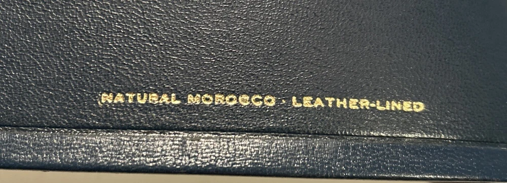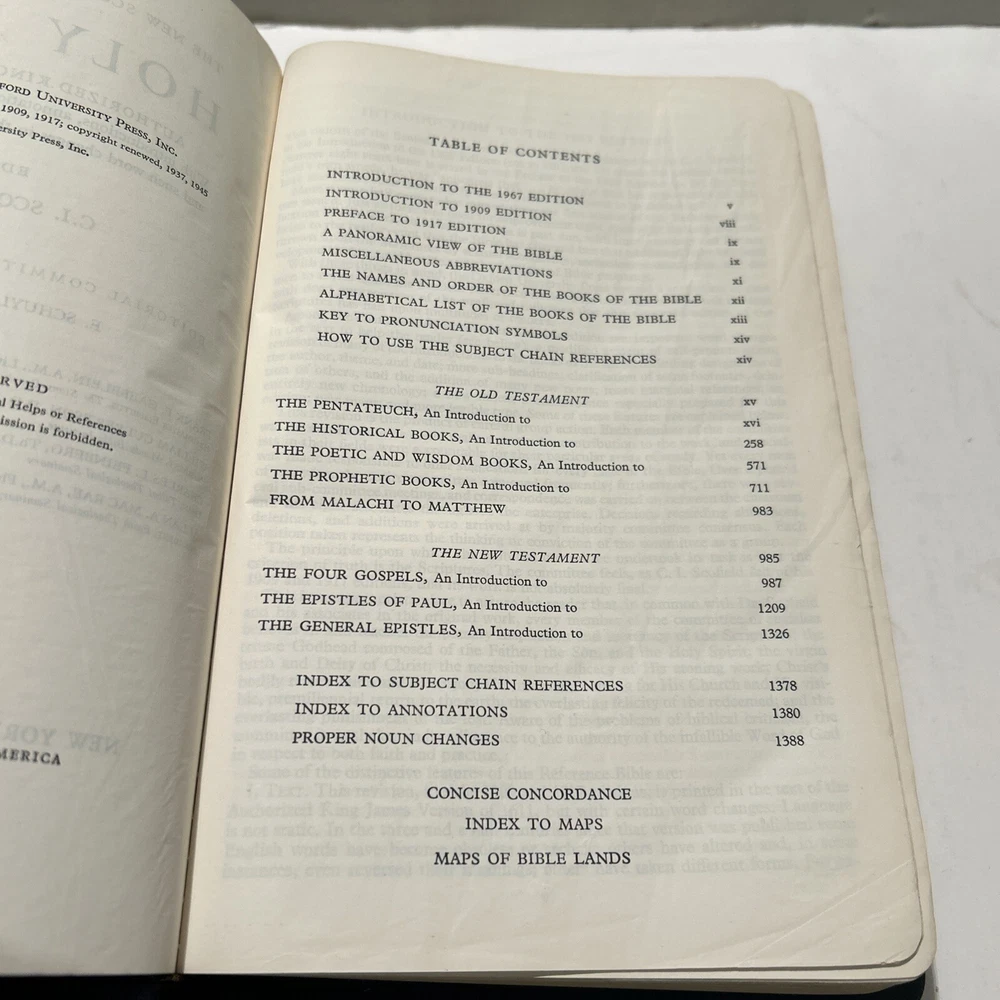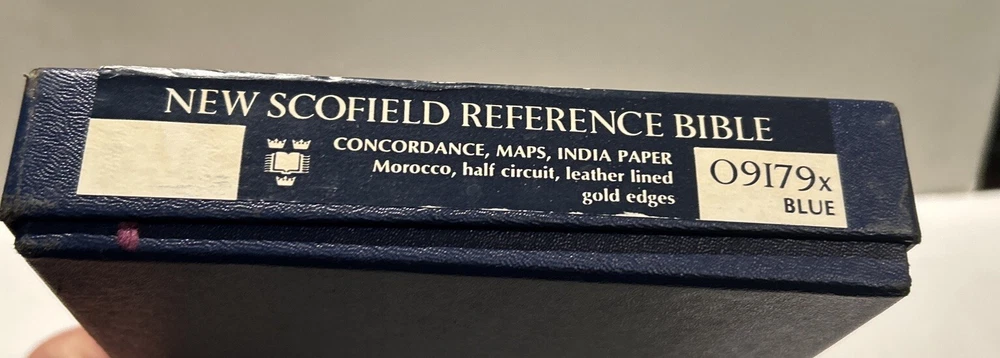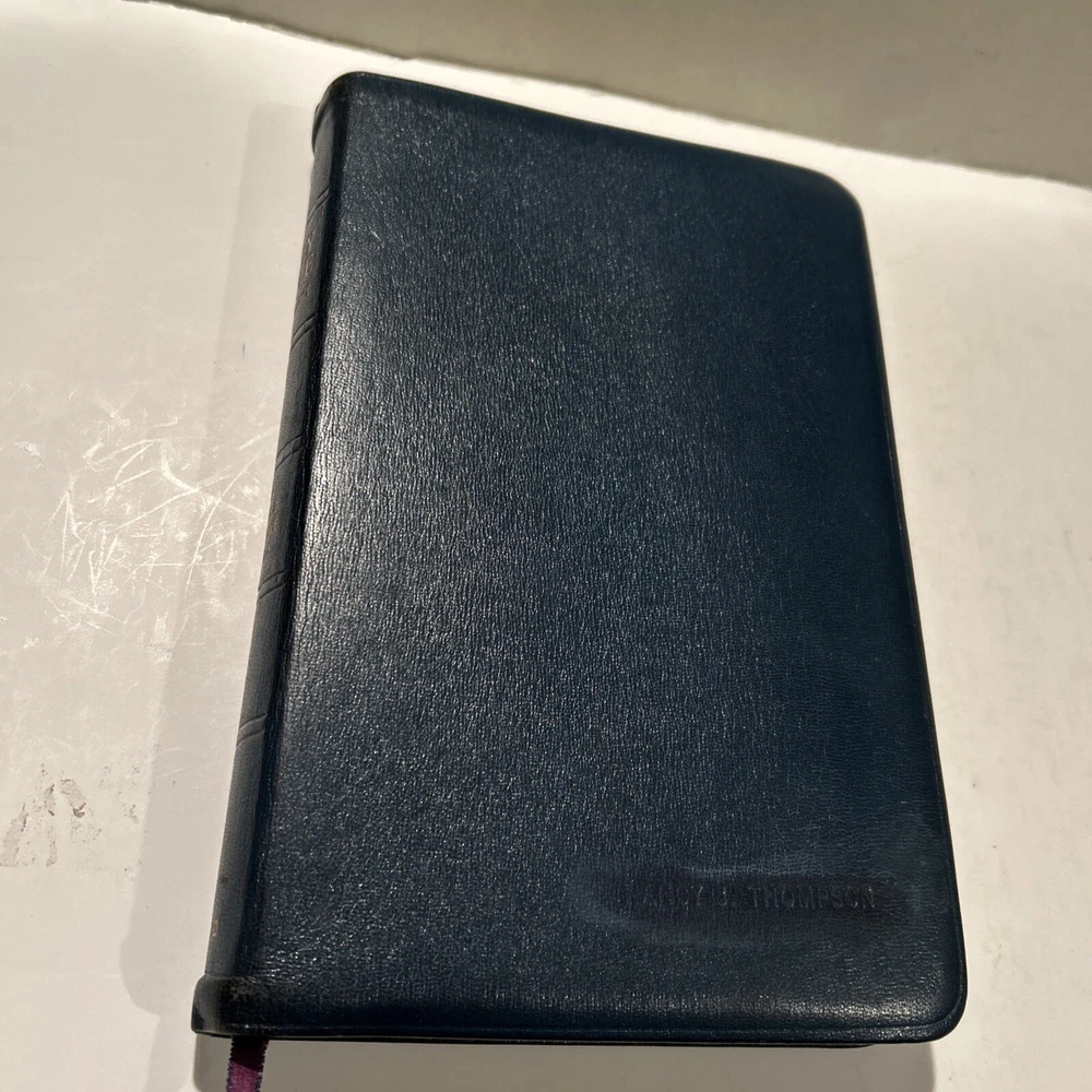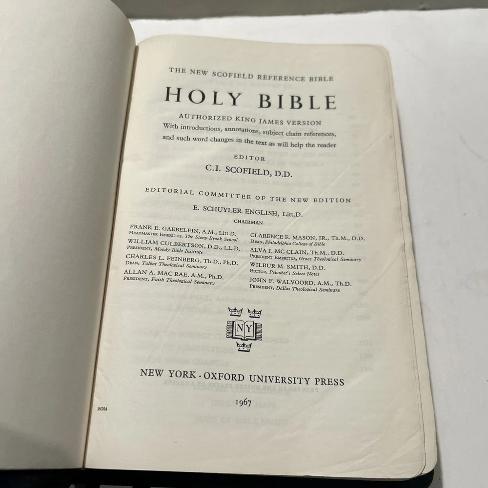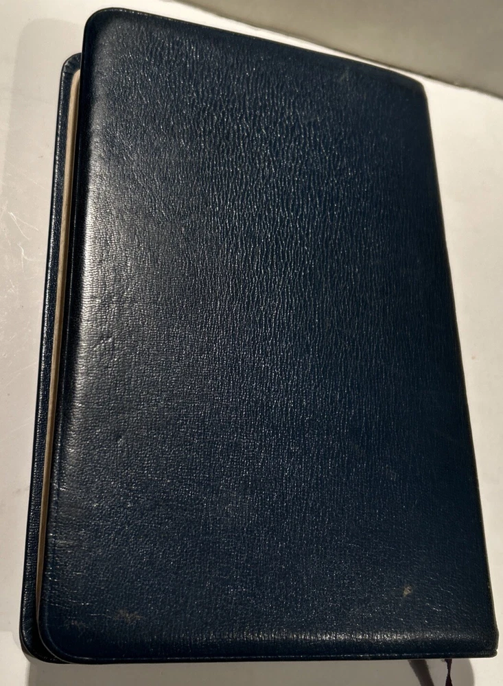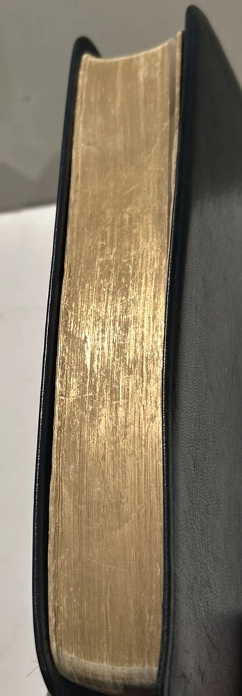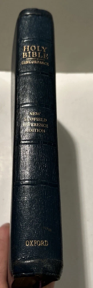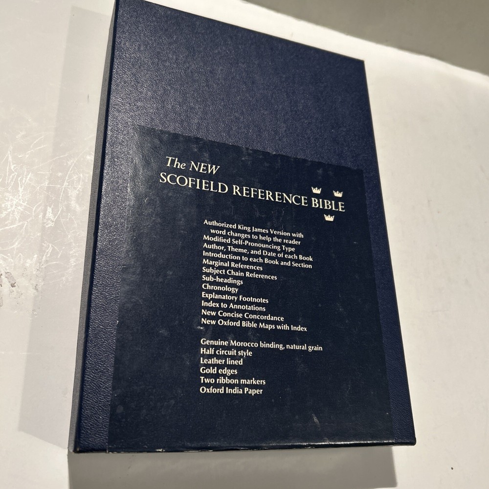 For your careful consideration here is a rare near fine copy of the Holy Bible KJV- 1945 Scofield Reference Edition - bound Natural Morocco Leather (Goatskin), Leather lined with Oxford Flexible (Smyth-Sewn) Binding. Facsimile Series 1. Print date code on back free end paper: T 10 63 indicates 1963 printing. FEATURES: Authorized King James Version with word changes to help the reader Modified Self-Pronouncing Type Author, Theme, and Date of Each Book Introduction to each Book and Section Marginal References Subject Chain References Sub-headings Chronology Explanatory Footnotes Index to Annotations New Concise Concordance New Oxford Bible Maps with Index STYLE: Genuine Morocco (Goatskin) Binding, Natural Grain Half Circuit style Gold edges Two Ribbon Markers Oxford India Paper Cover Measurements: 9.25" H x 6.1" W x 1.25" ITEM CONDITION NOTES: The text is clean and unmarked. The binding is tight and square. The cover is free of splits, chips, cracks or tears. NOTED DEFECTS: 1. The original owner's name was imprinted in gold on the front cover. The gold has been removed but the name is still visible on close inspection. 2. There is an inscription from the husband to his wife dated Christmas 1970 on the inside of the front fly leaf. PLEASE SEE ALL PHOTOS BEFORE BUYING.