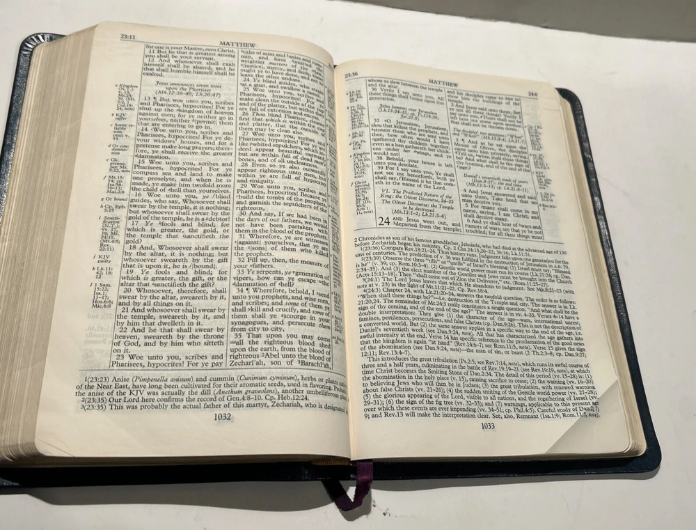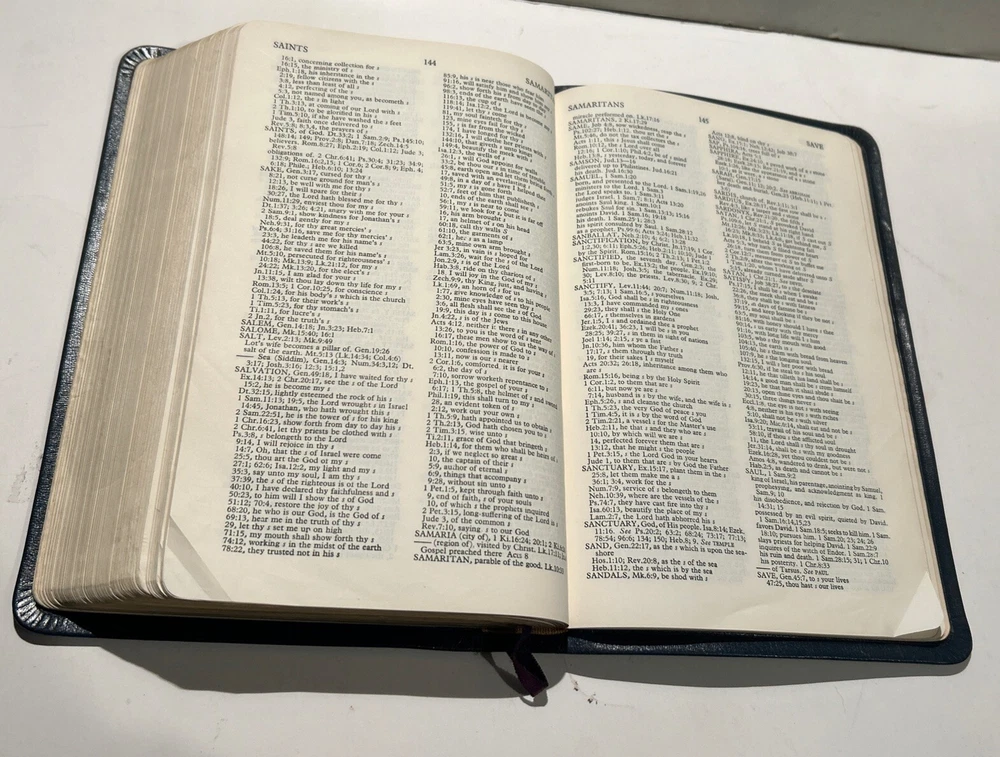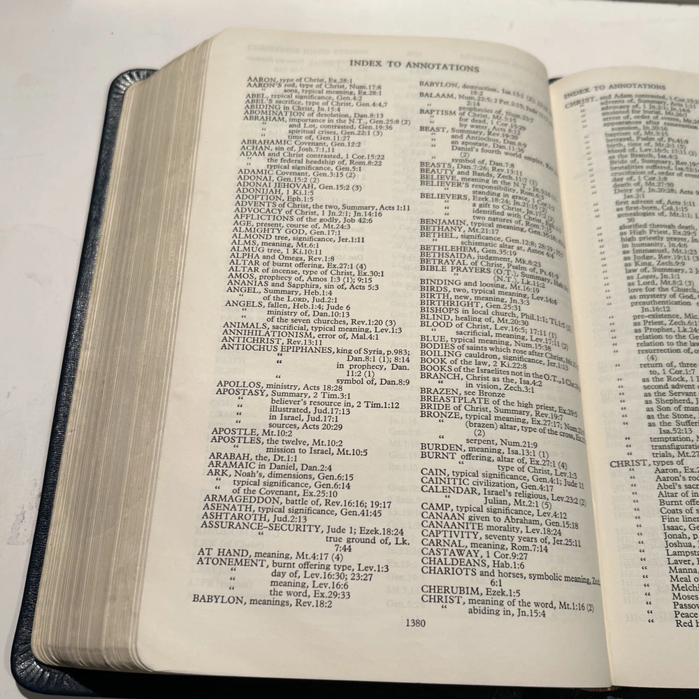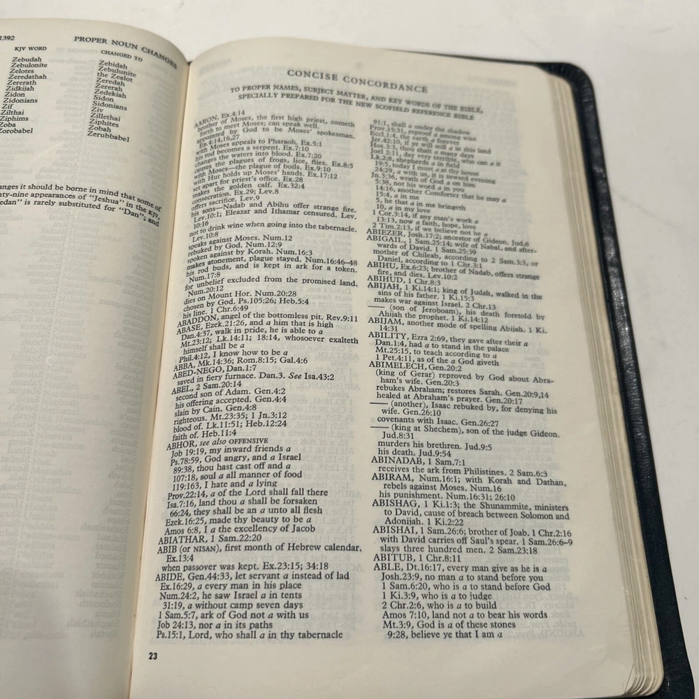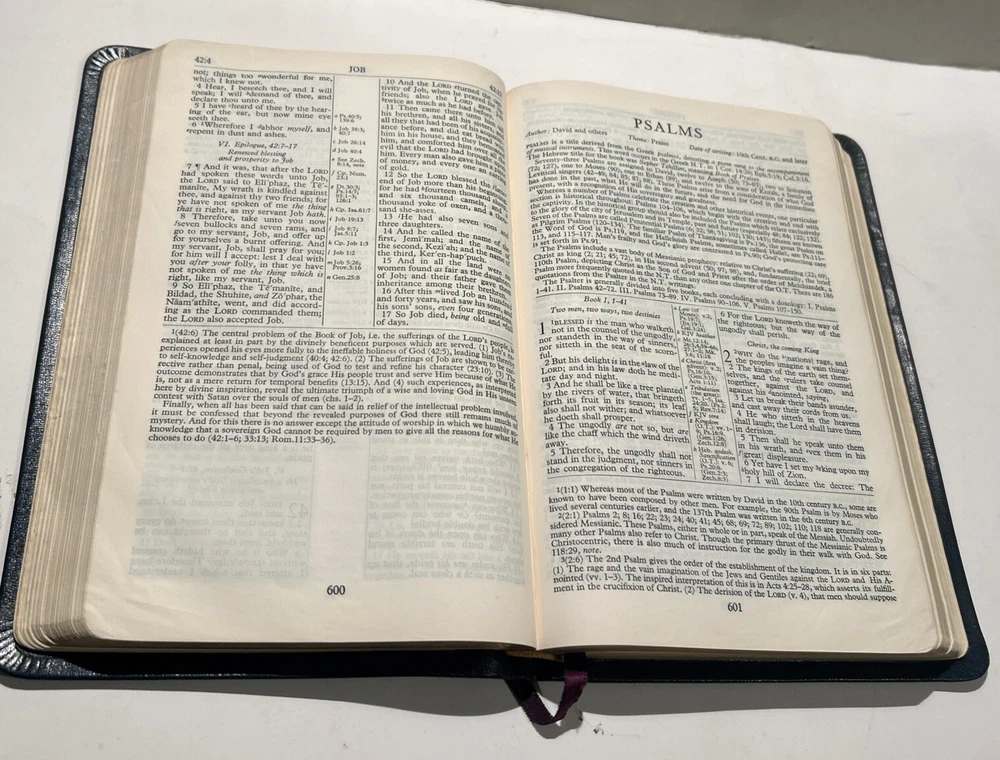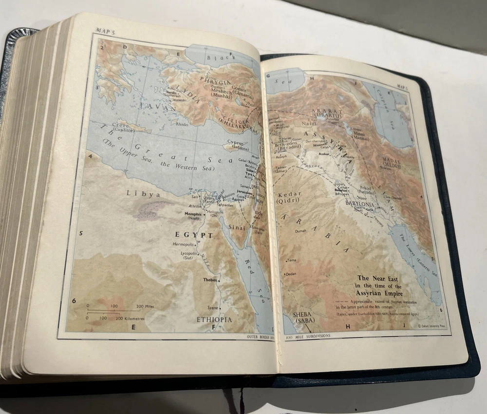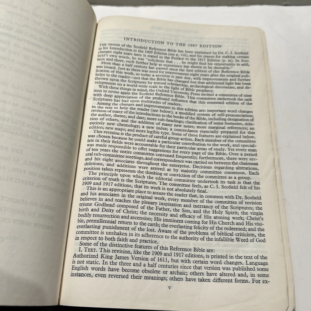 For your careful consideration here is a rare near fine copy of the Holy Bible KJV- 1945 Scofield Reference Edition - bound Natural Morocco Leather (Goatskin), Leather lined with Oxford Flexible (Smyth-Sewn) Binding. Facsimile Series 1. Print date code on back free end paper: T 10 63 indicates 1963 printing. FEATURES: Authorized King James Version with word changes to help the reader Modified Self-Pronouncing Type Author, Theme, and Date of Each Book Introduction to each Book and Section Marginal References Subject Chain References Sub-headings Chronology Explanatory Footnotes Index to Annotations New Concise Concordance New Oxford Bible Maps with Index STYLE: Genuine Morocco (Goatskin) Binding, Natural Grain Half Circuit style Gold edges Two Ribbon Markers Oxford India Paper Cover Measurements: 9.25" H x 6.1" W x 1.25" ITEM CONDITION NOTES: The text is clean and unmarked. The binding is tight and square. The cover is free of splits, chips, cracks or tears. NOTED DEFECTS: 1. The original owner's name was imprinted in gold on the front cover. The gold has been removed but the name is still visible on close inspection. 2. There is an inscription from the husband to his wife dated Christmas 1970 on the inside of the front fly leaf. PLEASE SEE ALL PHOTOS BEFORE BUYING.