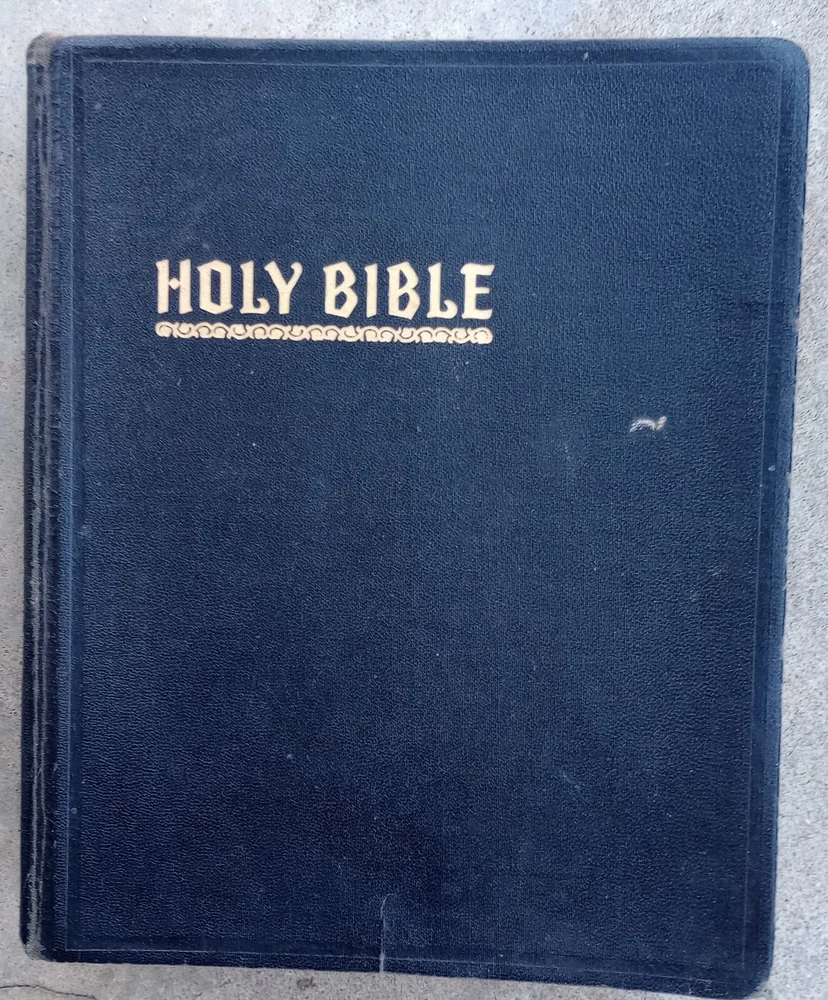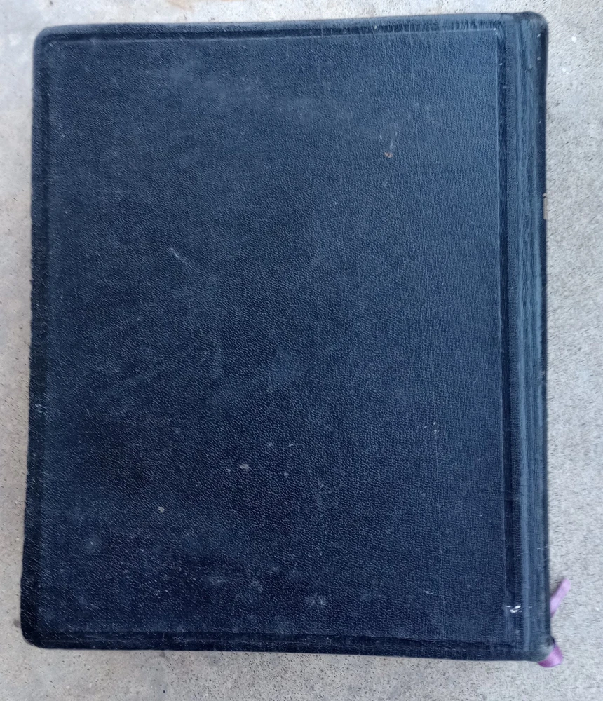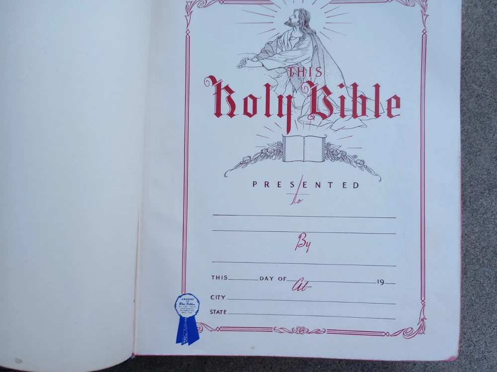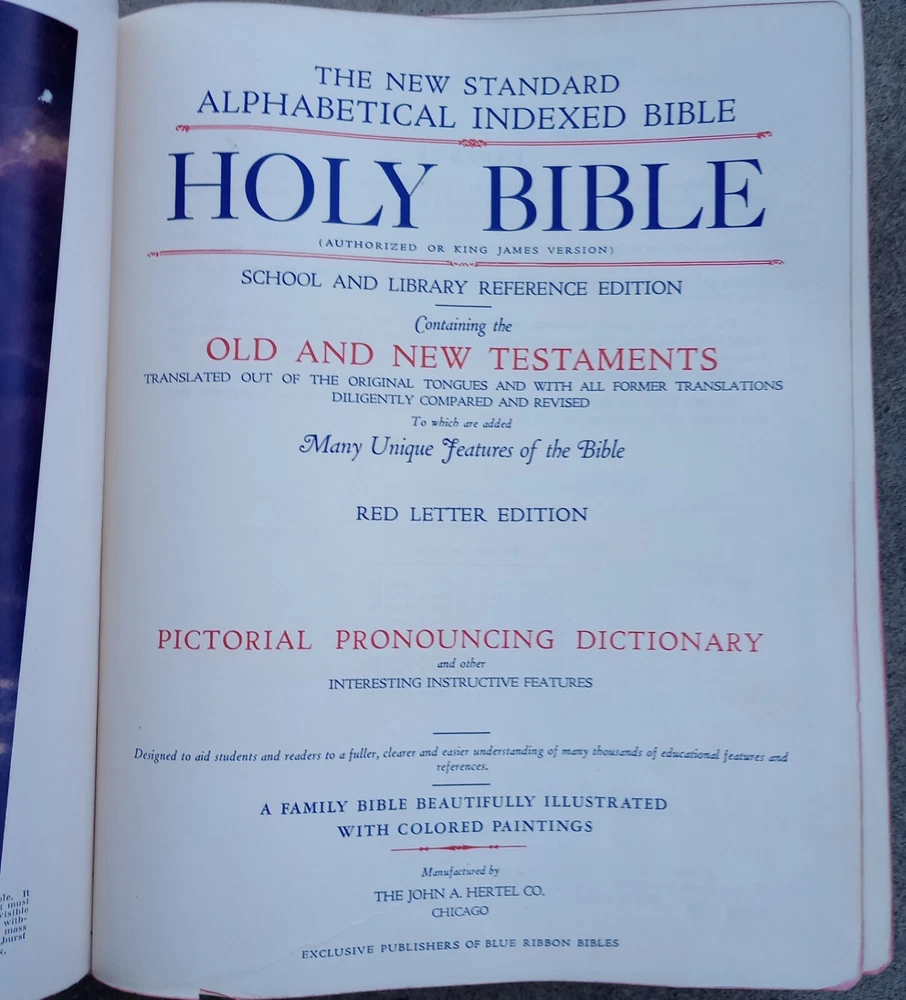 Has stains Has creases Has loose bottom cover Small rips Vintage King James Version by Hertel Reference bible Blue ribbon Binding is intact but has wear Original 1951 English Large bible...