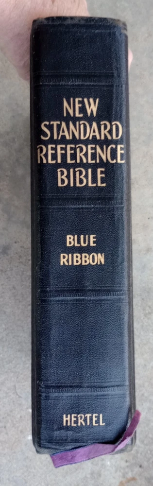 Has stains Has creases Has loose bottom cover Small rips Vintage King James Version by Hertel Reference bible Blue ribbon Binding is intact but has wear Original 1951 English Large bible