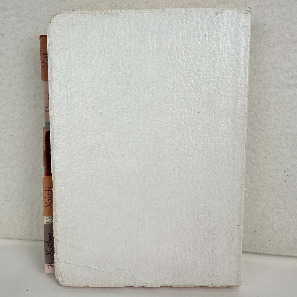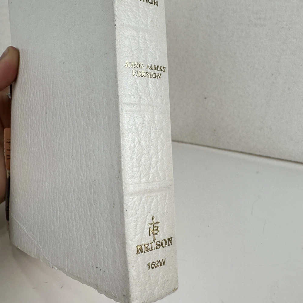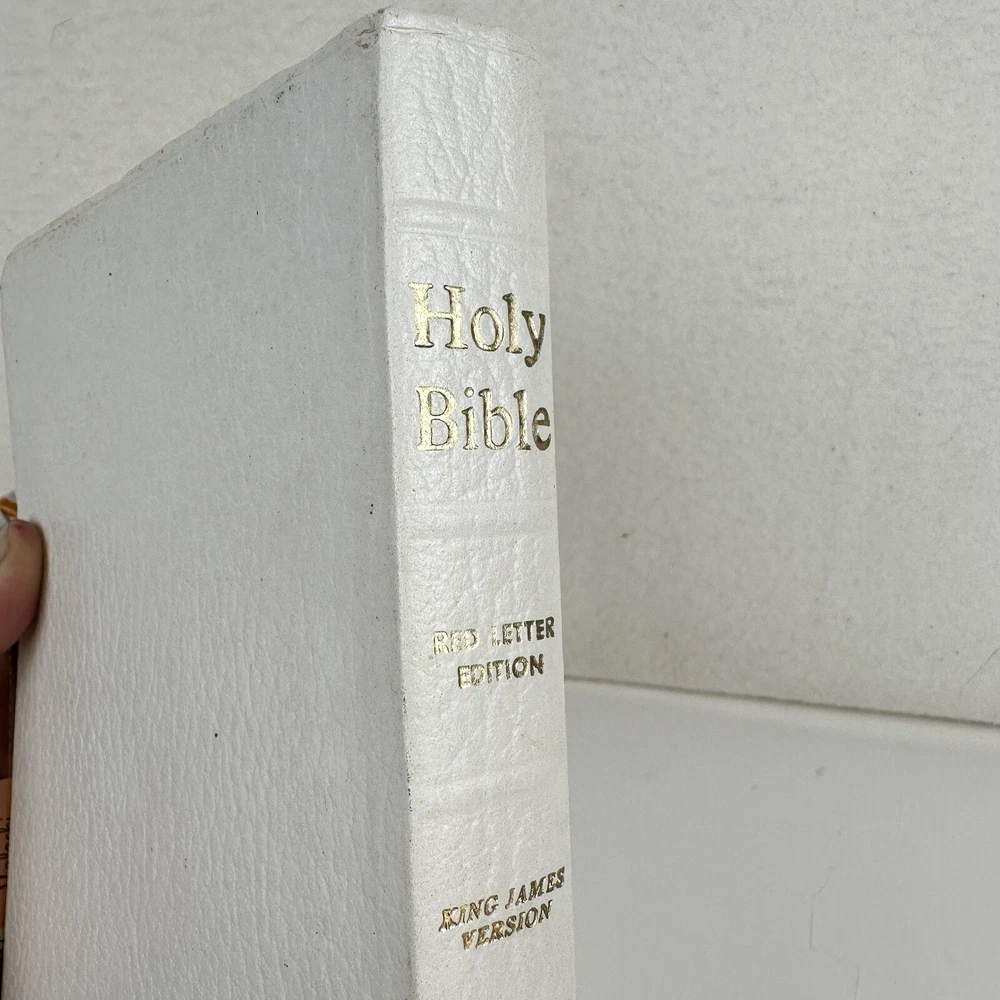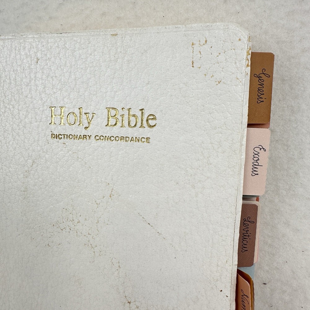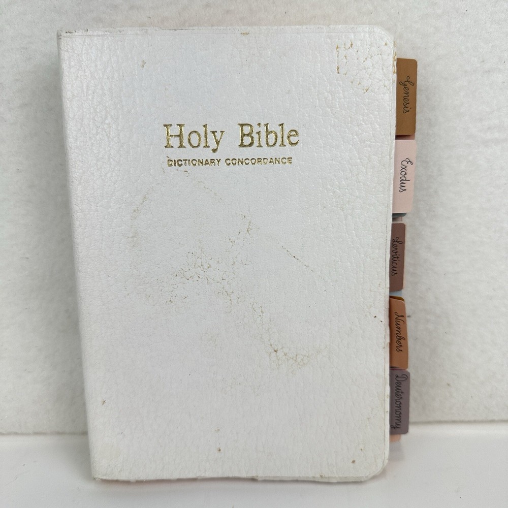 Holy Bible KJV Red Letter Concordance Dictionary Nelson 1977 White Cover W/ Tabs. Lots of life left! Pages are free of writing, spills, rips. Outside covers show signs of wear. Comes with tabs.