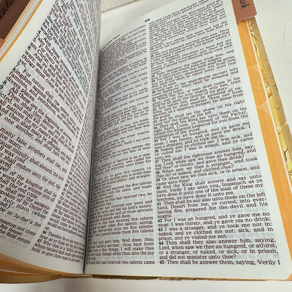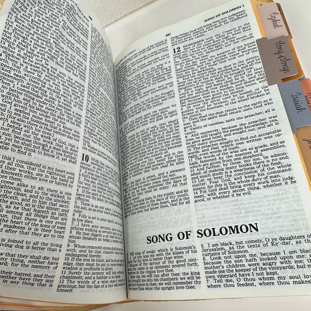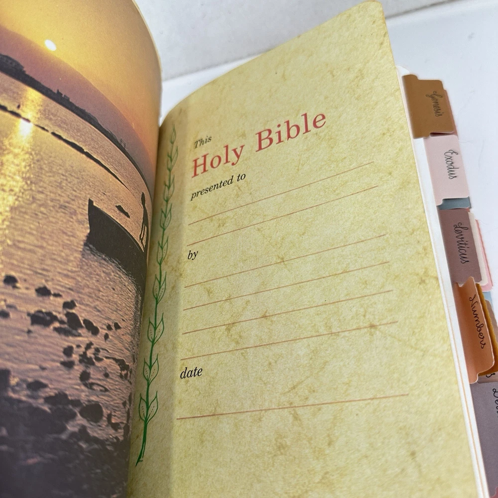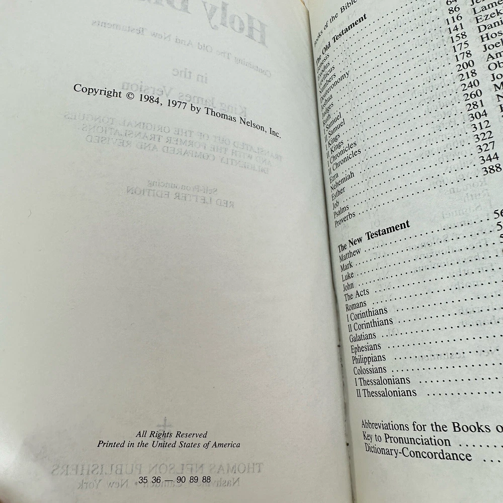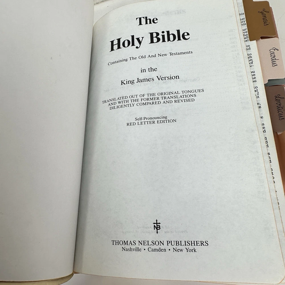 Holy Bible KJV Red Letter Concordance Dictionary Nelson 1977 White Cover W/ Tabs. Lots of life left! Pages are free of writing, spills, rips. Outside covers show signs of wear. Comes with tabs.