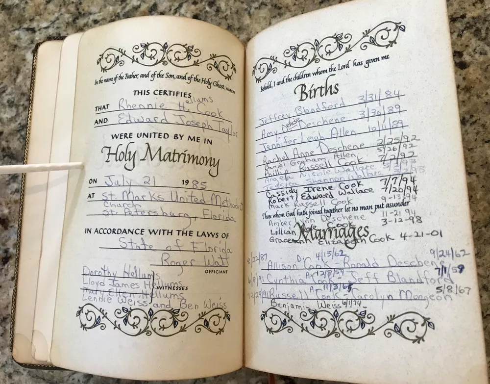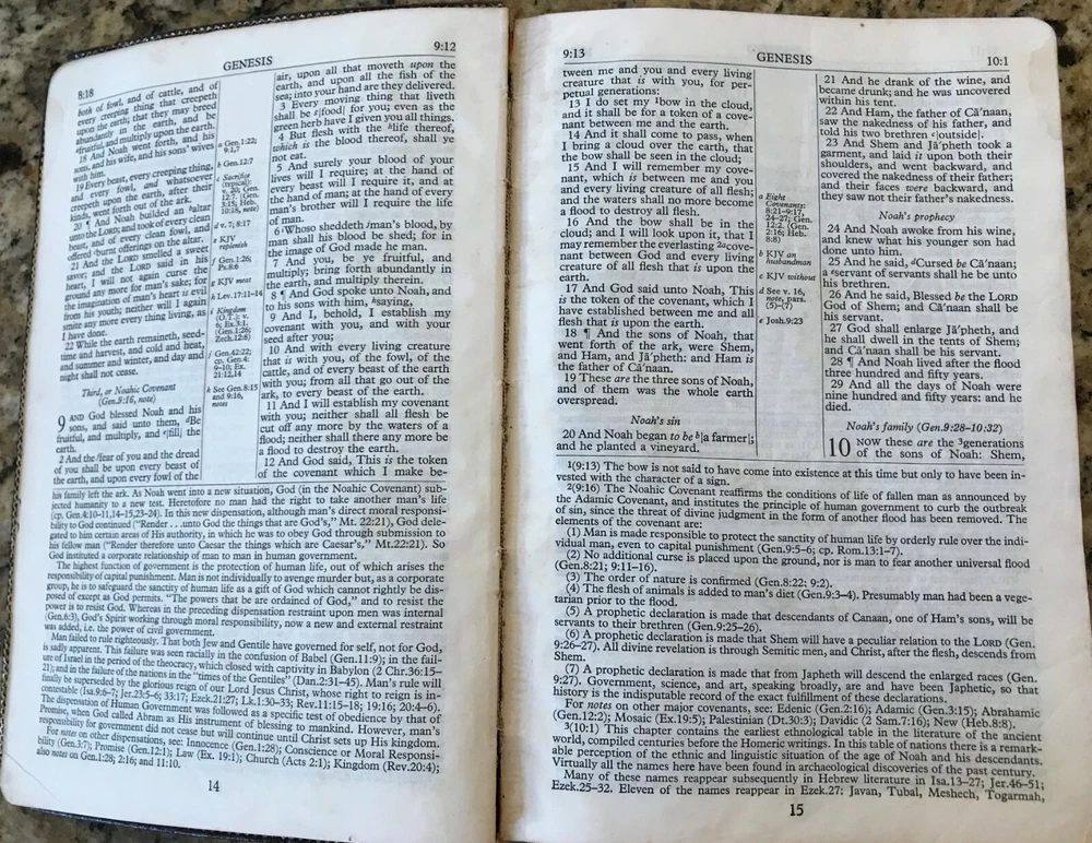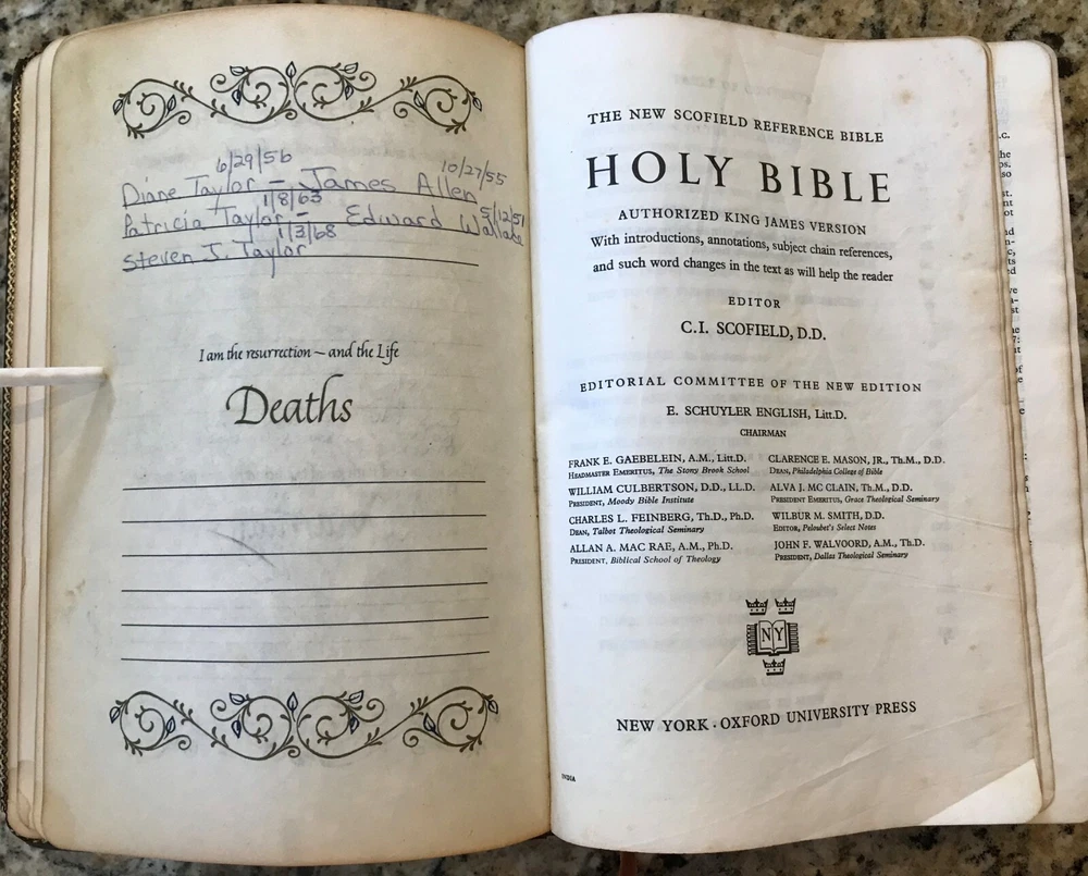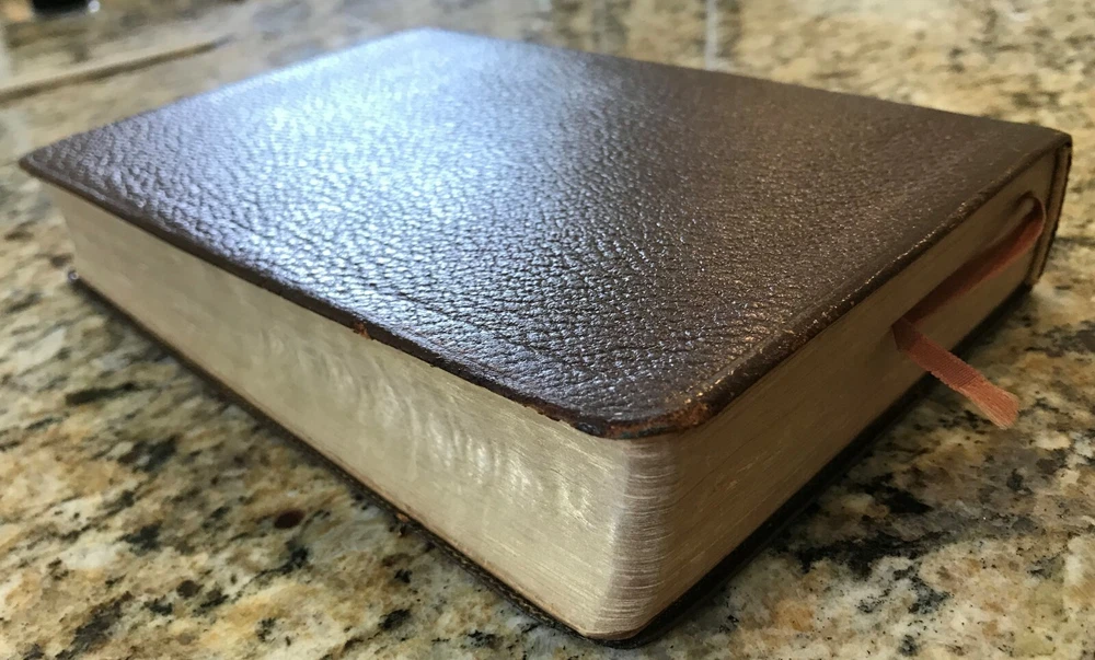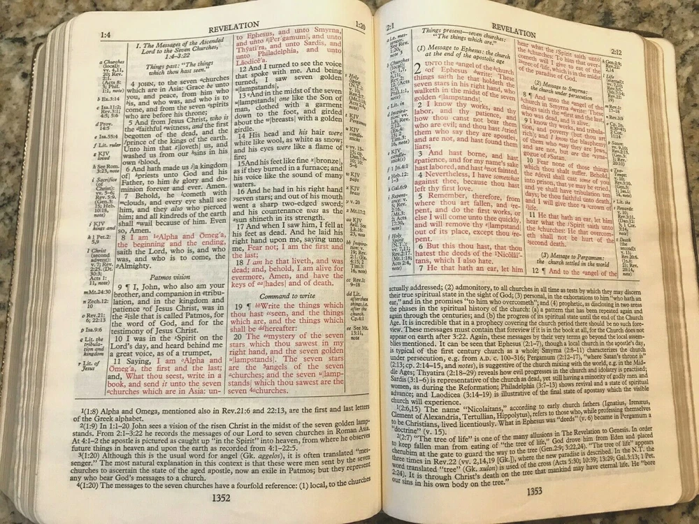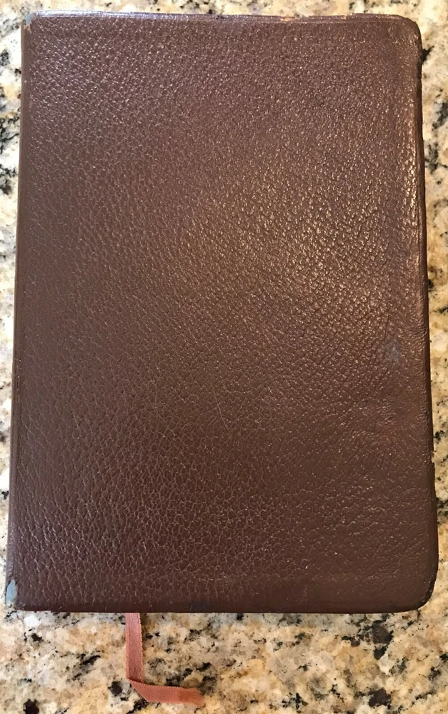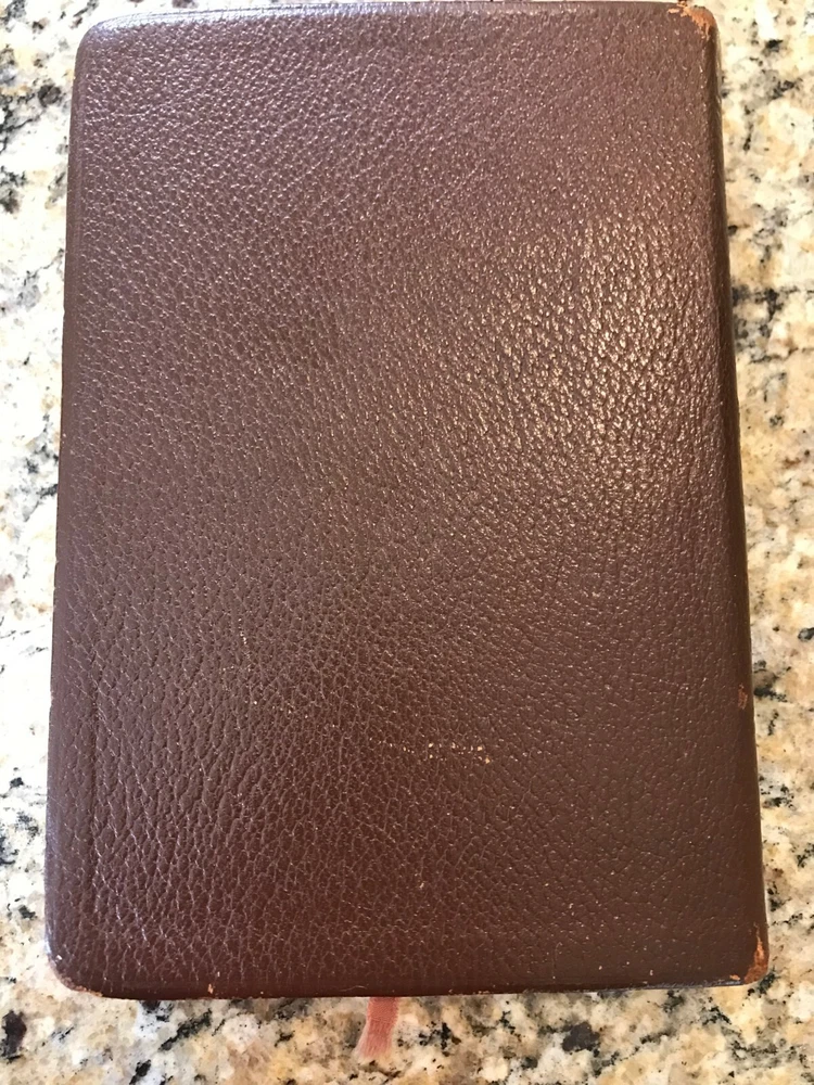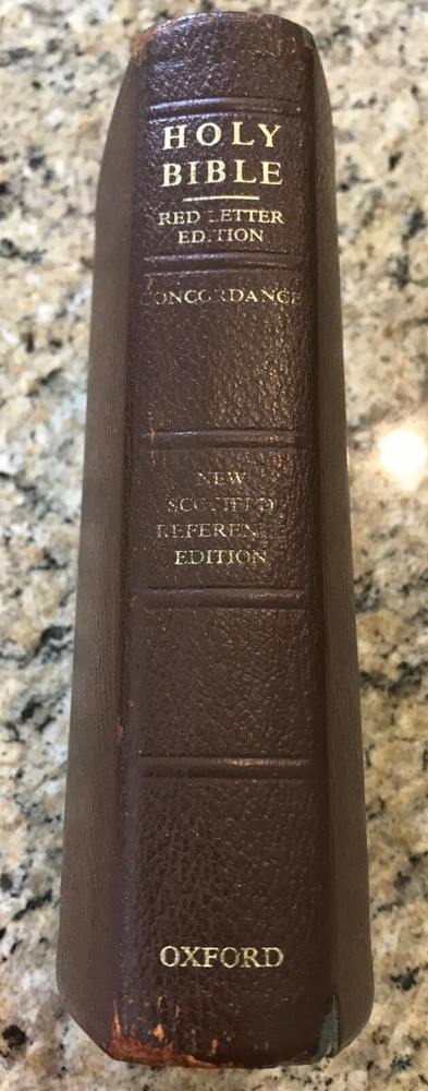 Holy Bible King James Version Red Letter Concordance New Scofield Reference Edition published by Oxford University Press copyright 1967. The bible is bound in brown leather and has gold gilded page edges. It is 7-7/8" by 5-1/4" by 1-1/4". The cover has some slight wear at the edges, some of the gold embossed lettering on the spine has worn, the family section has been filled out, 2 sections have a split with the spin, several pages have some wrinkled page edges and there is a circle on a verse number on page 1375. Some of these are shown highlighted in the last few pictures. Please see all the pages for more details on its condition.