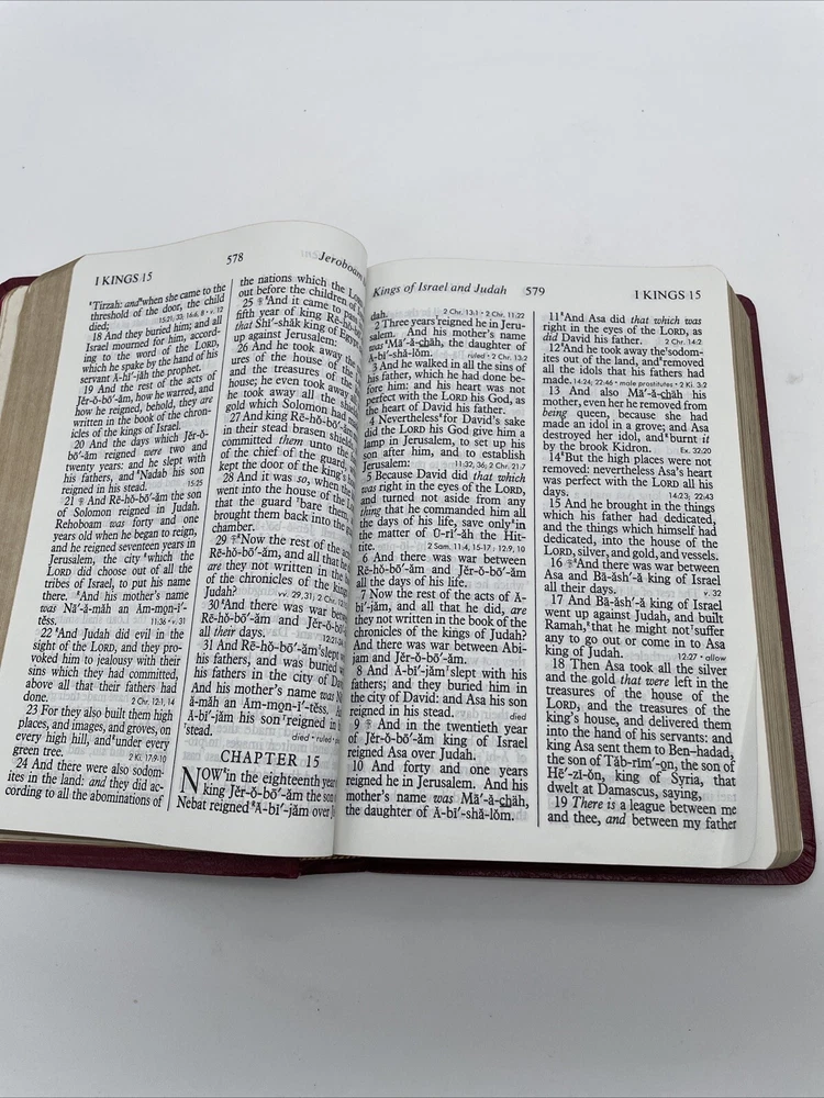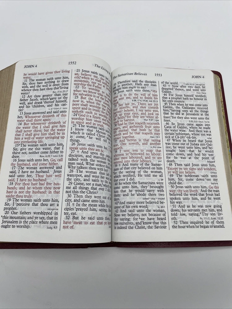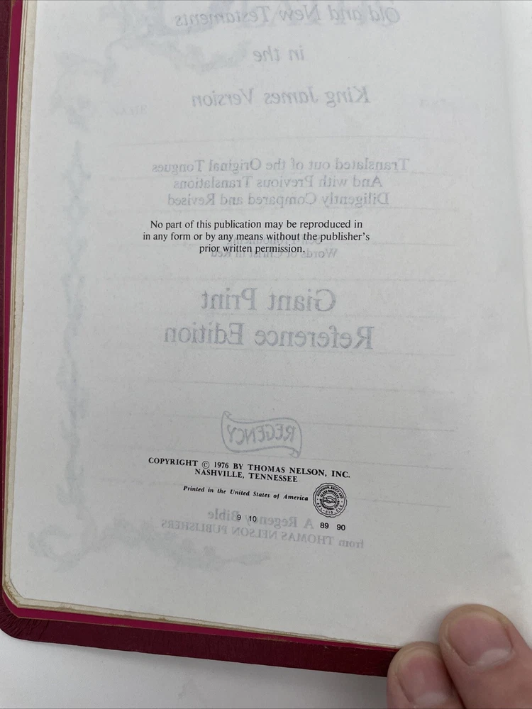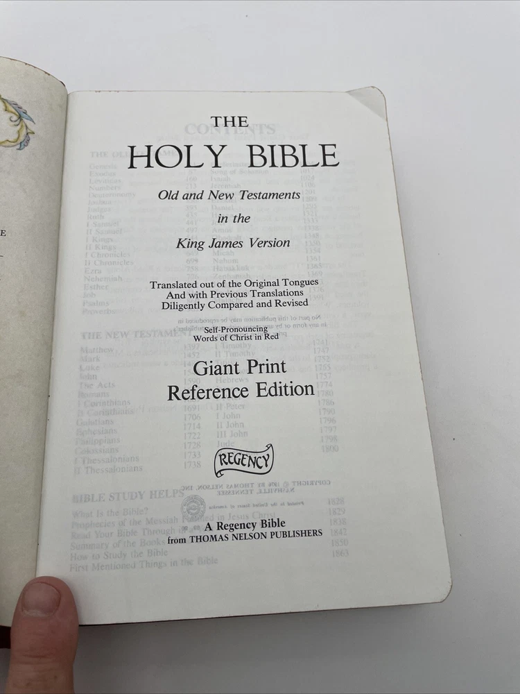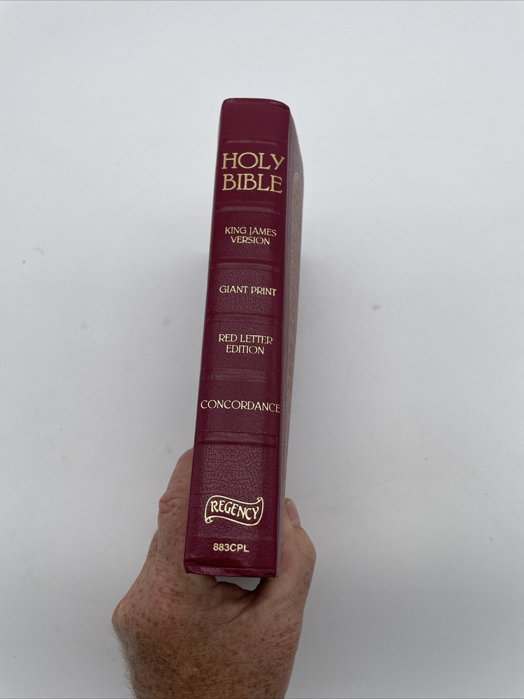 This Holy Bible in the King James Version comes in a giant print with a red letter edition. It also includes a reference concordance and is bound in leather. The author is Thomas Nelson and the publisher is Regency Bible. This original copy was printed in 1976 in the United States. It is a great addition to any collection and a valuable resource for those studying Christianity. It falls under the category of Antiquarian & Collectible books and is written in English.