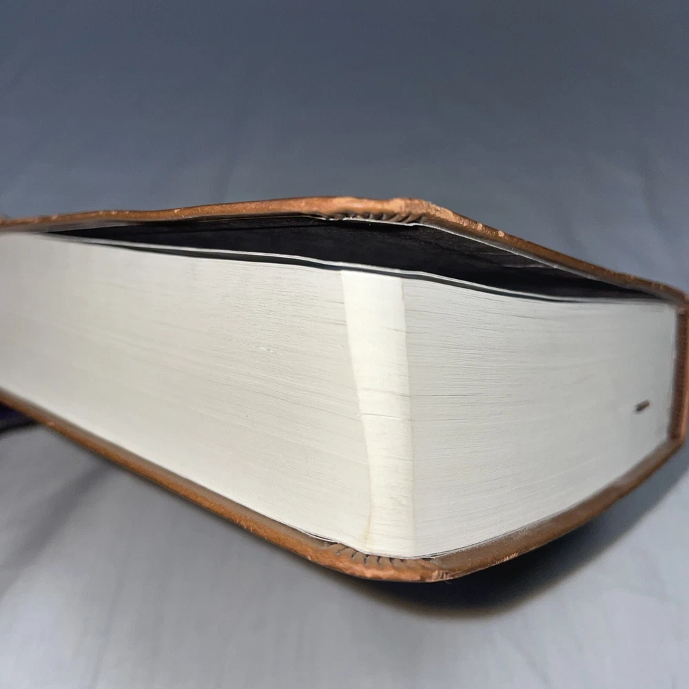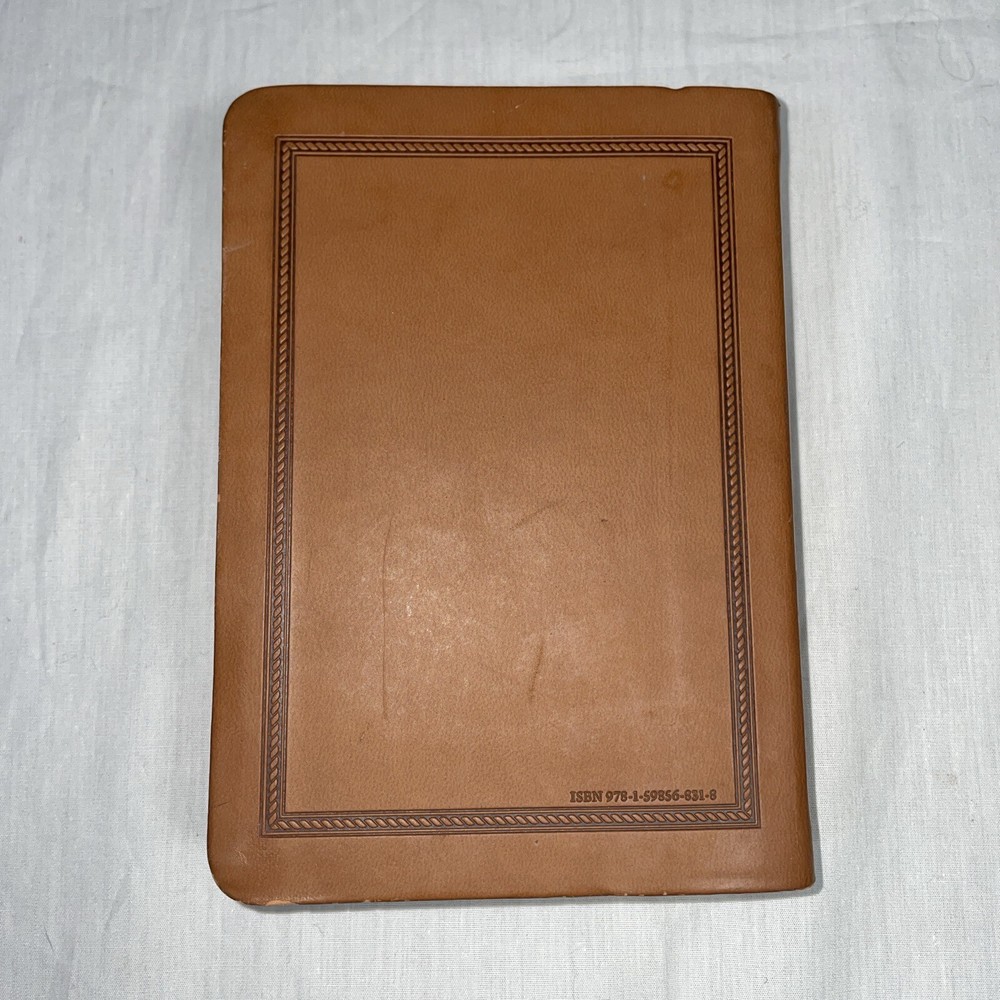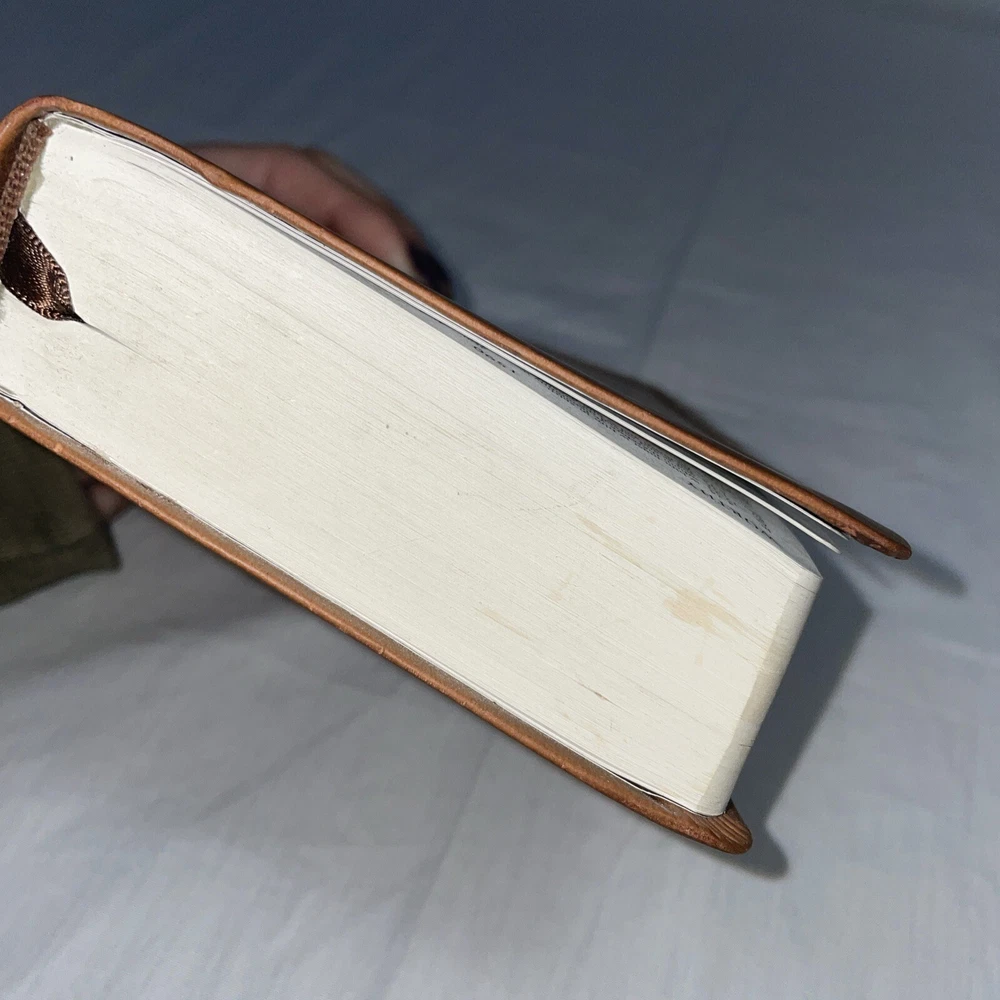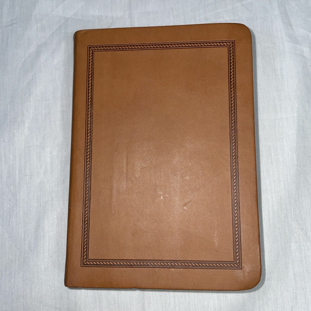 Pre owned condition has some wear to the cover especially on edges and corners as shown in photos. Some discoloration to edges of pages. I am unsure of the material of the cover but it is soft and leather-like. Measures about 6”x4.25”x1.25”.