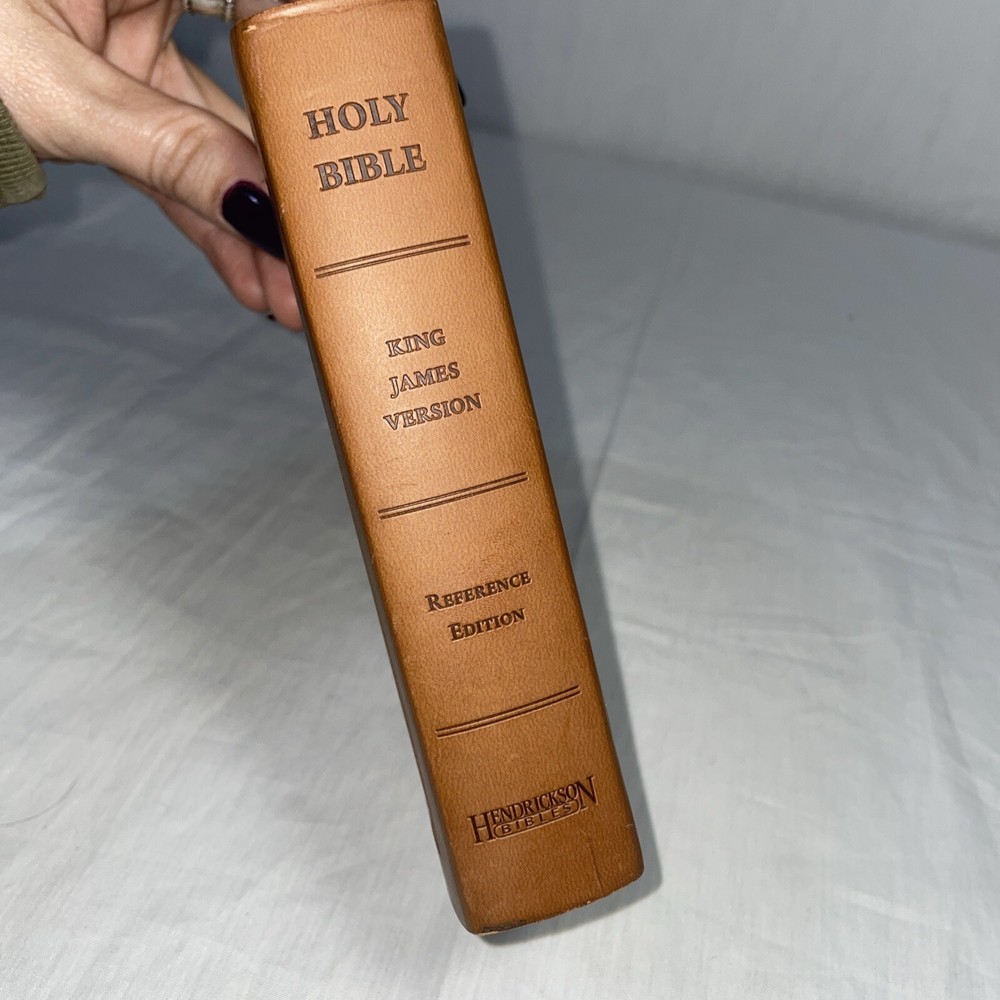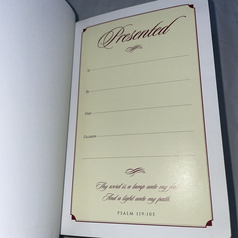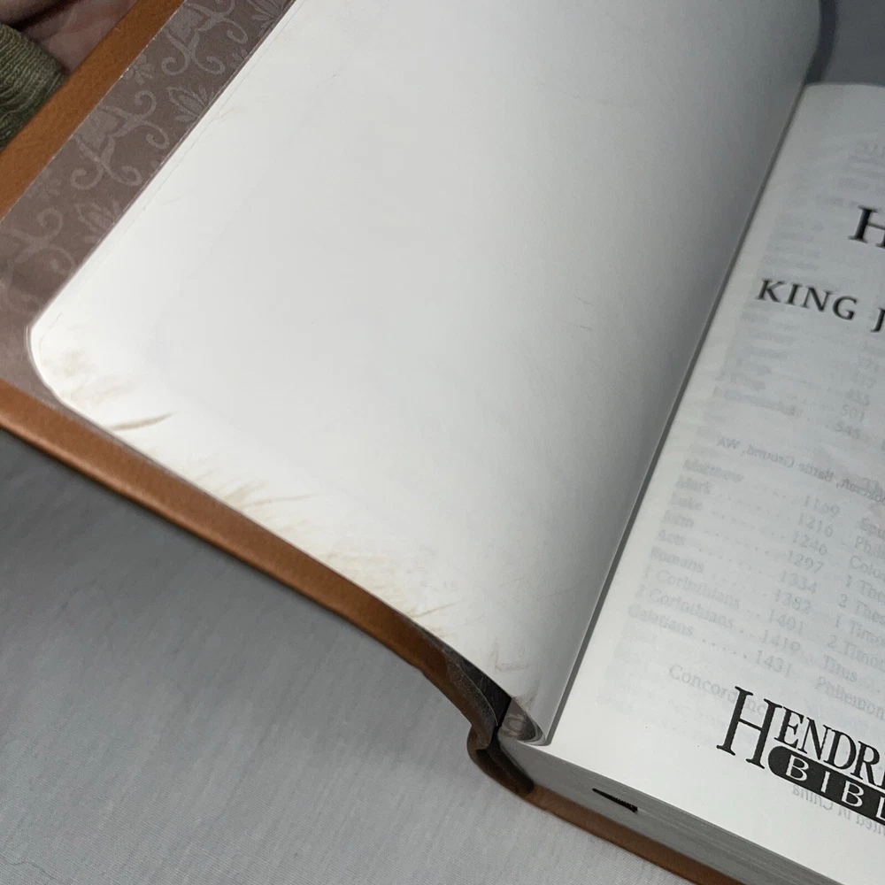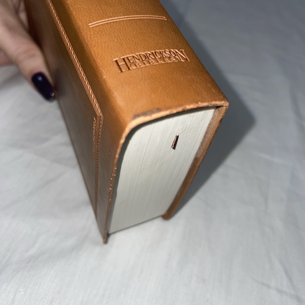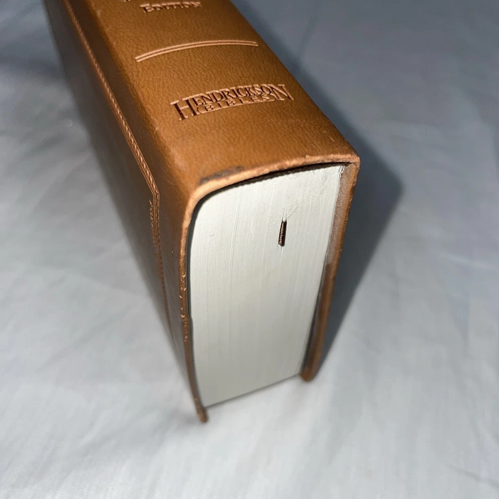 Pre owned condition has some wear to the cover especially on edges and corners as shown in photos. Some discoloration to edges of pages. I am unsure of the material of the cover but it is soft and leather-like. Measures about 6”x4.25”x1.25”.