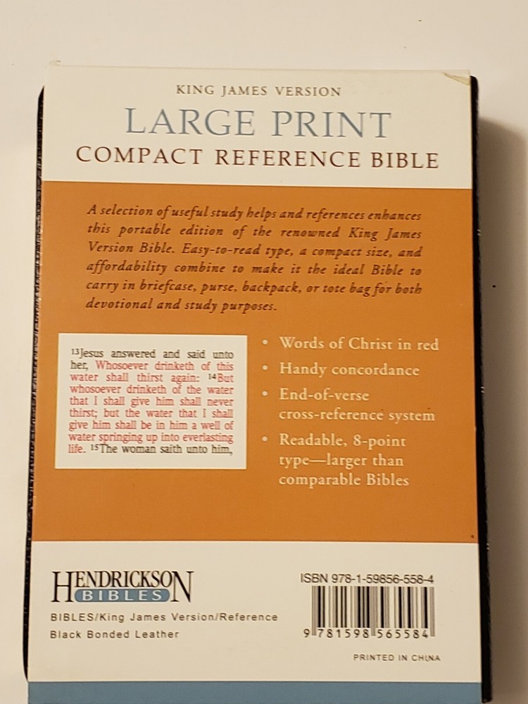 This is an Auction for one (1) Holy Bible KJV Red Print Compact Reference Edition Hendrickson Bonded Leather - Brand New! This item is BRAND New, the item pictured is the exact item for sale, and is being sold as is. Free Shipping via USPS Media Mail. NO Shipping outside the U.S. If you have any questions, please ask before you buy.