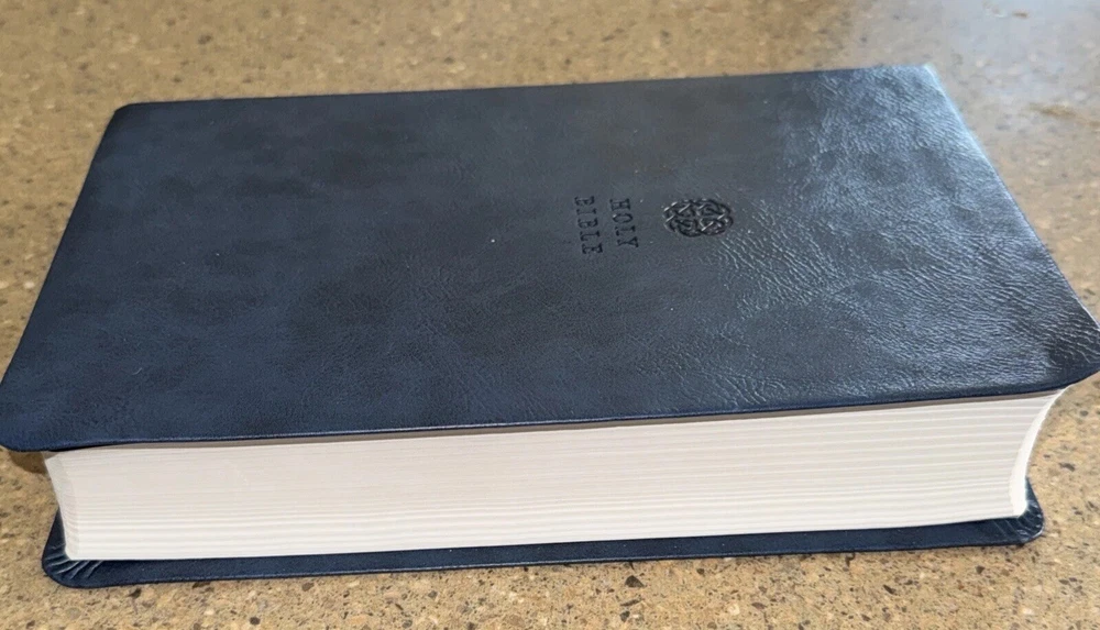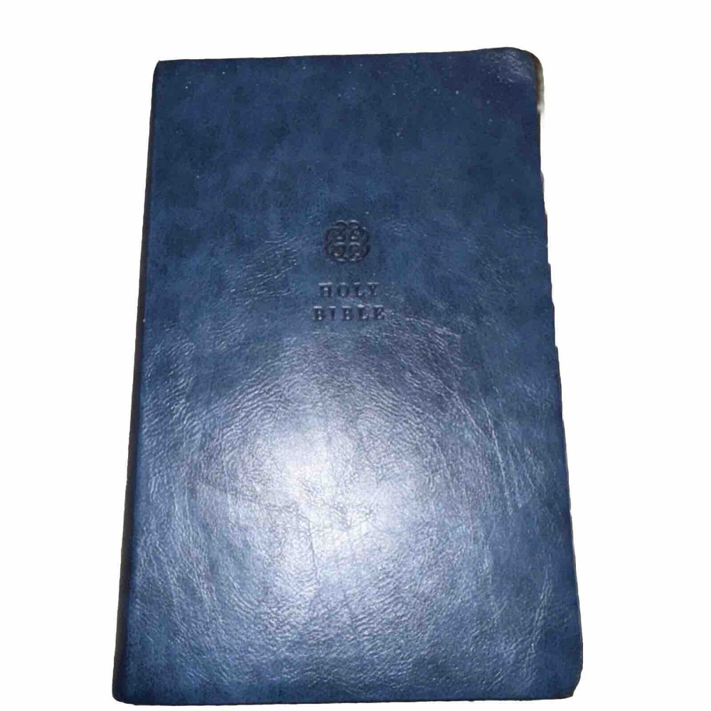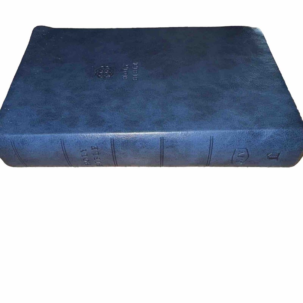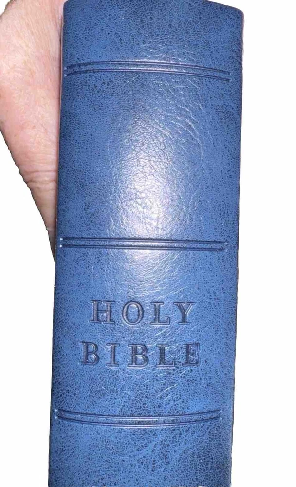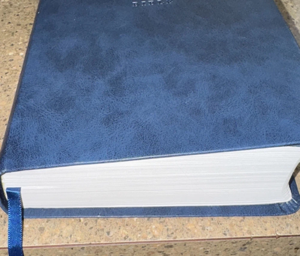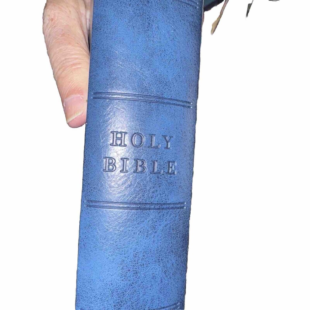 This Bible is a fantastic choice—large, easy-to-read print with vibrant red letters for Jesus' words. The blue leatherette cover looks elegant and feels durable. It’s in excellent condition, no markings inside, just a slight bend on one edge (shown in the photo). Perfect for daily reading or study!