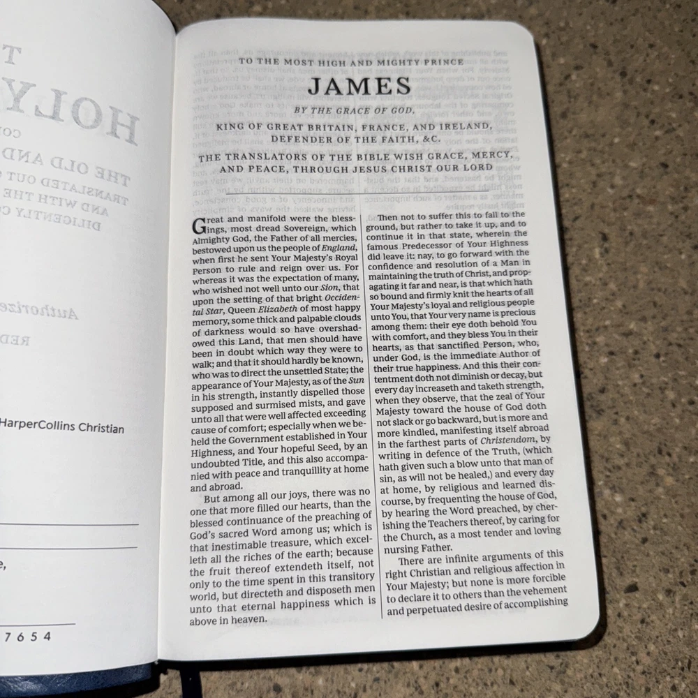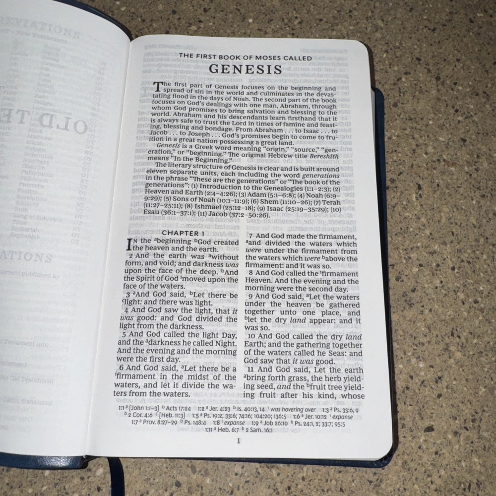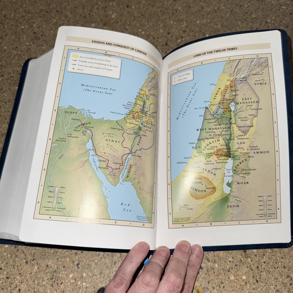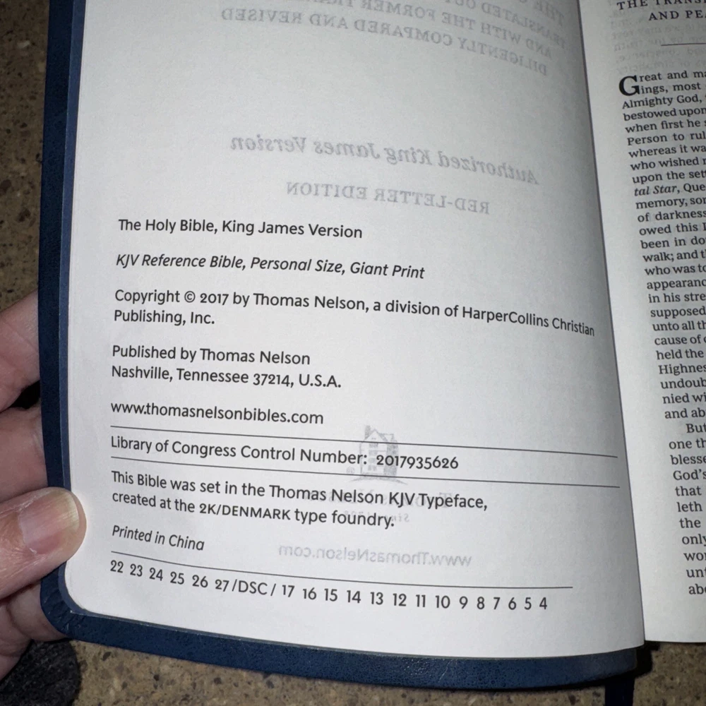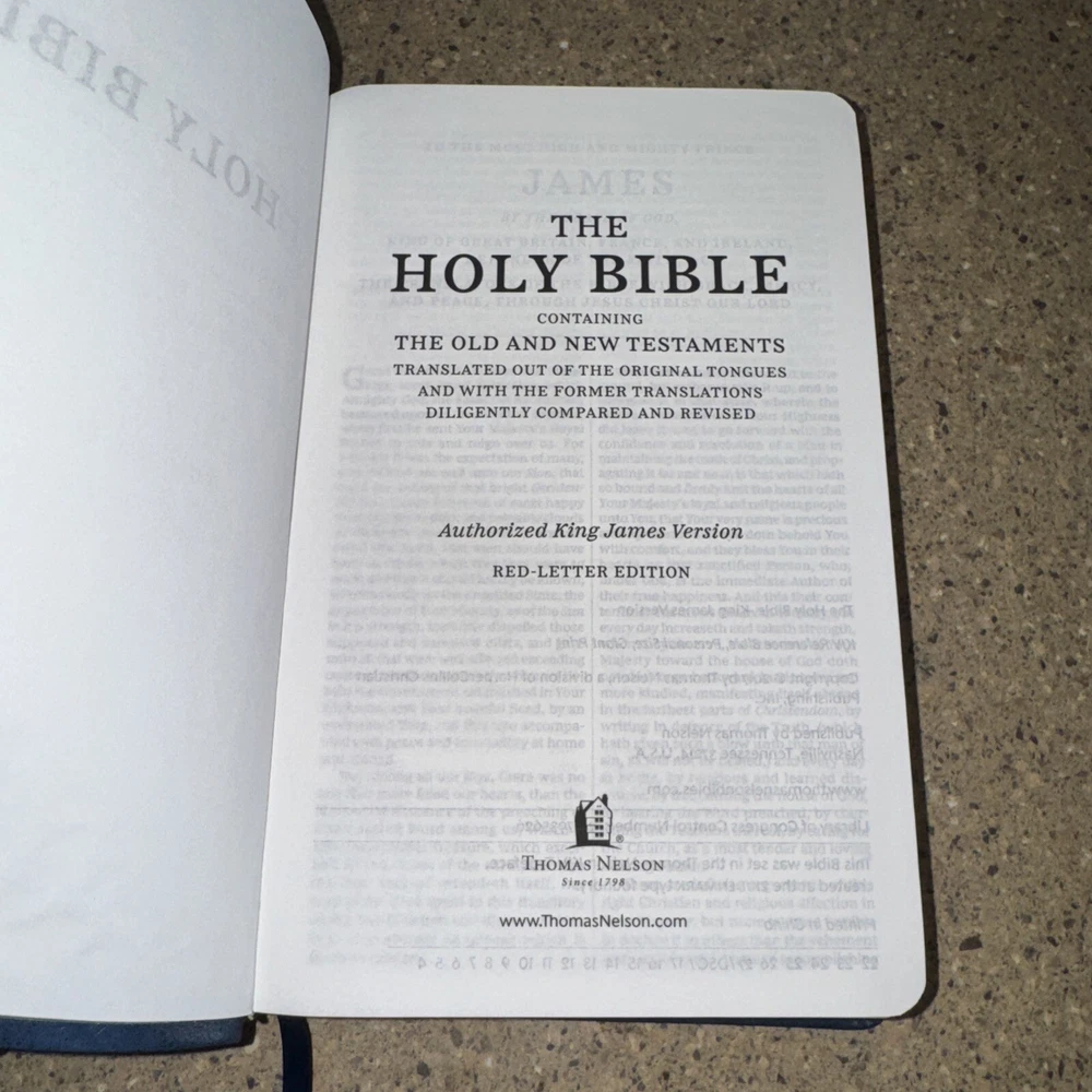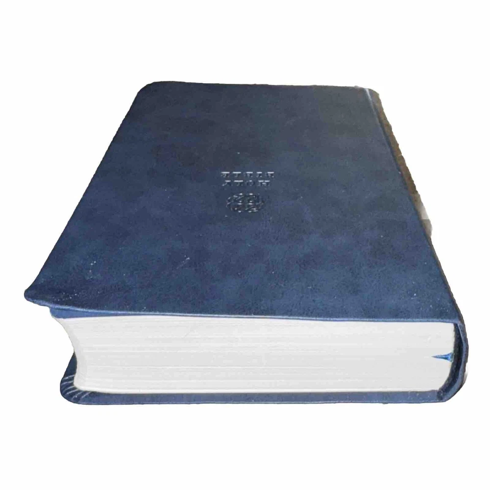 This Bible is a fantastic choice—large, easy-to-read print with vibrant red letters for Jesus' words. The blue leatherette cover looks elegant and feels durable. It’s in excellent condition, no markings inside, just a slight bend on one edge (shown in the photo). Perfect for daily reading or study!