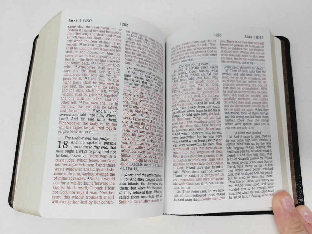 This Holy Bible KJV Reference Edition is a beautifully crafted book bound in black bonded leather with gold accents. It contains the complete King James Version of the Holy Bible, with 1590 pages of scripture. The book features a number of aspects to enhance the reading experience, including a comprehensive index, detailed footnotes, and clear typography. It is suitable for adults of all denominations who seek to deepen their spiritual understanding. All photos are of the actual item you will receive. Our items are packaged securely then shipped FAST, same or next business day. Thanks for looking.
