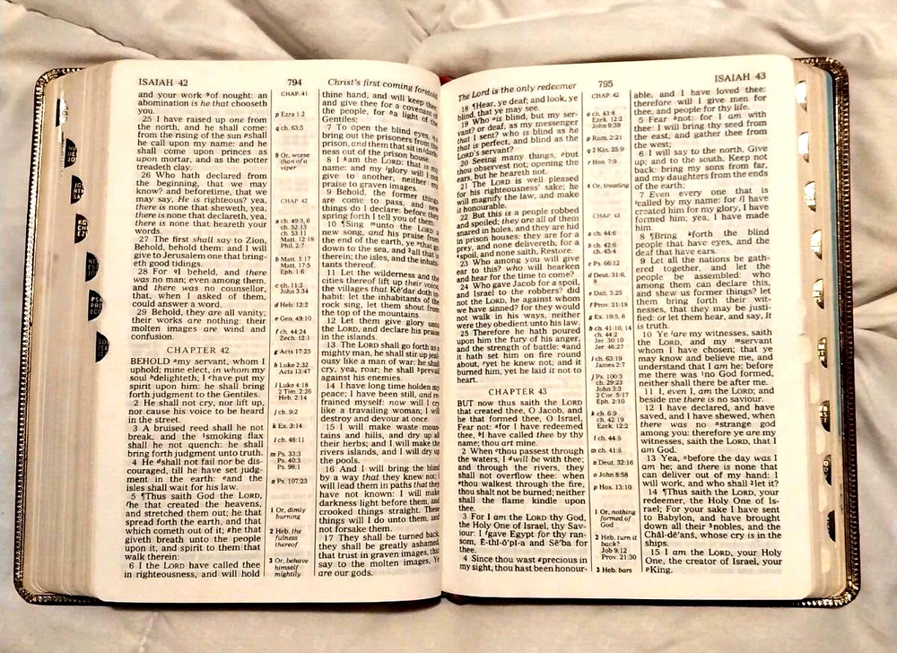 This KJV Reference Bible is a beautiful, high-quality edition with a soft leather cover that feels great in hand. The gold-gilded pages and Smyth-sewn binding make it durable for daily use, while the thumb-indexed tabs help quickly find books. The clear, readable text and helpful cross-references make studying scripture effortless. Perfect for personal devotion or gifting, this timeless Bible is a treasure that will last for years.