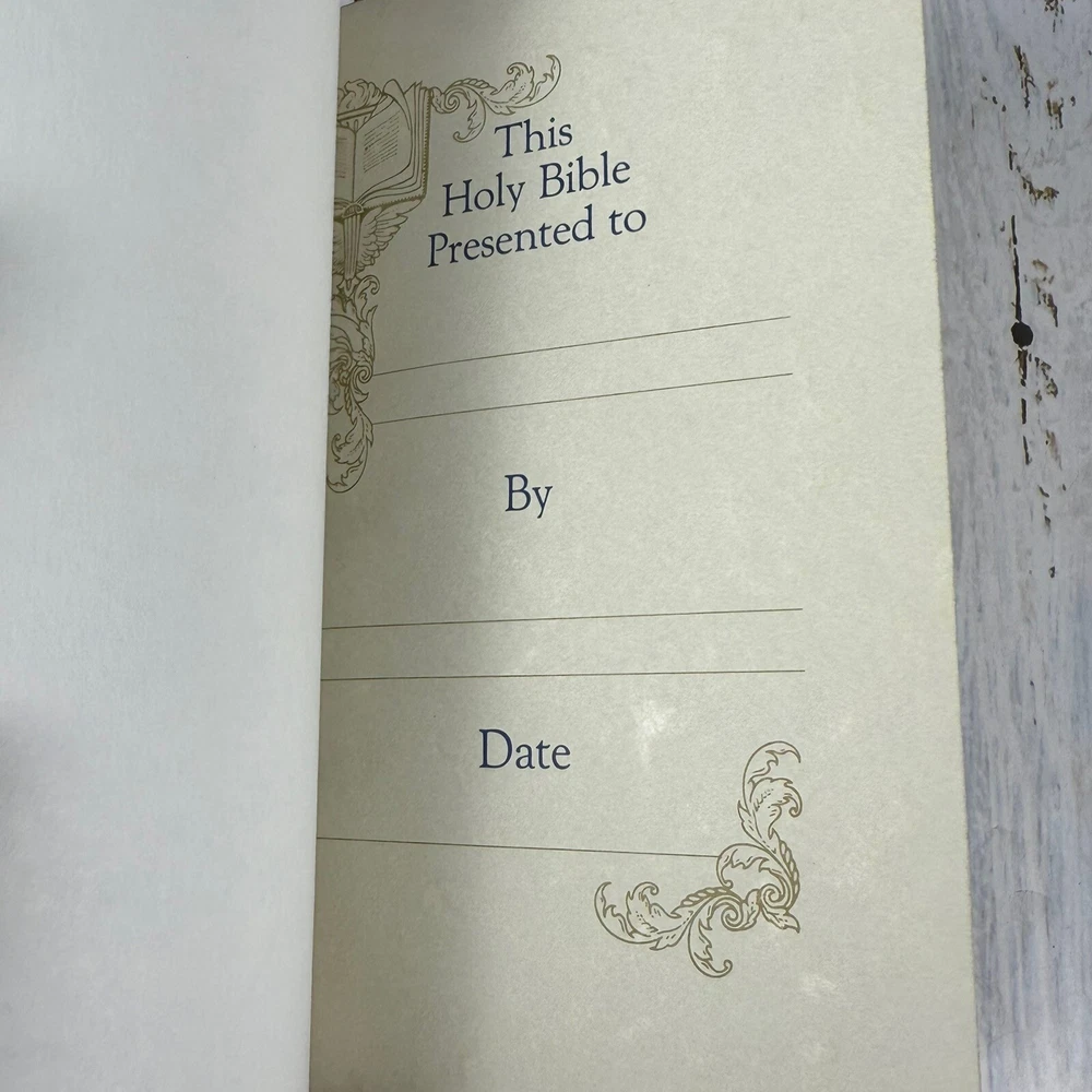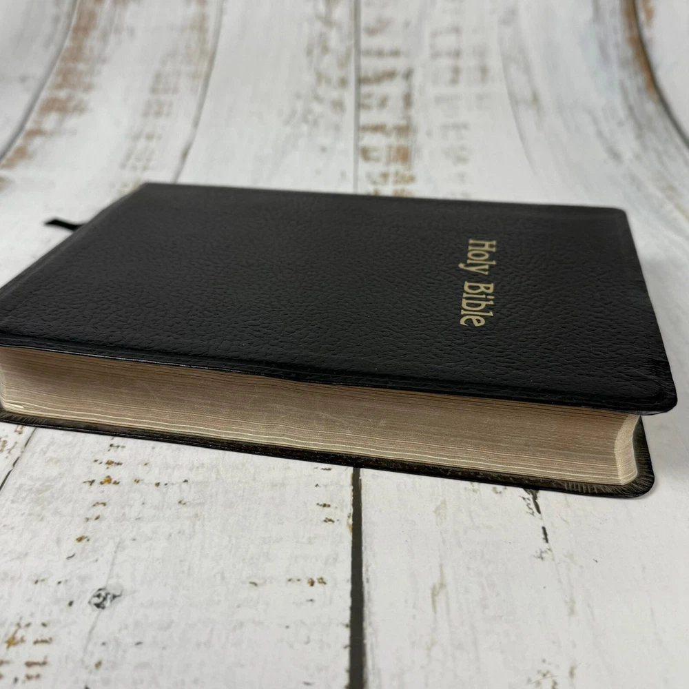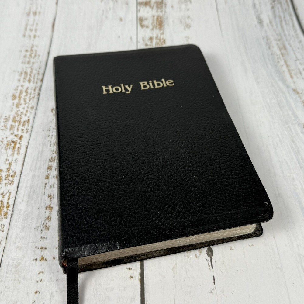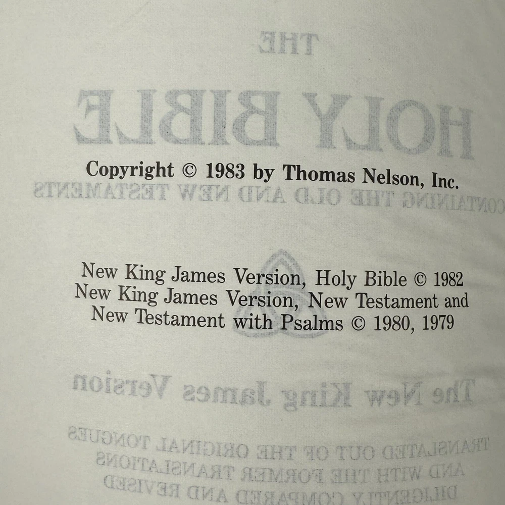 This is a 1984 KJV edition of the Holy Bible published by Thomas Nelson NUMBER 443. It is a red letter edition is bound in black faux leather. The book has 1524 pages and includes references, concordances, and blank presentation, marriage, births, family trees, and deaths pages. The book is in good condition and is intended for young adults and adults who are interested in religion and spirituality.