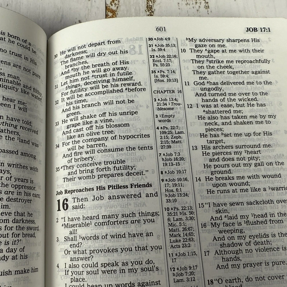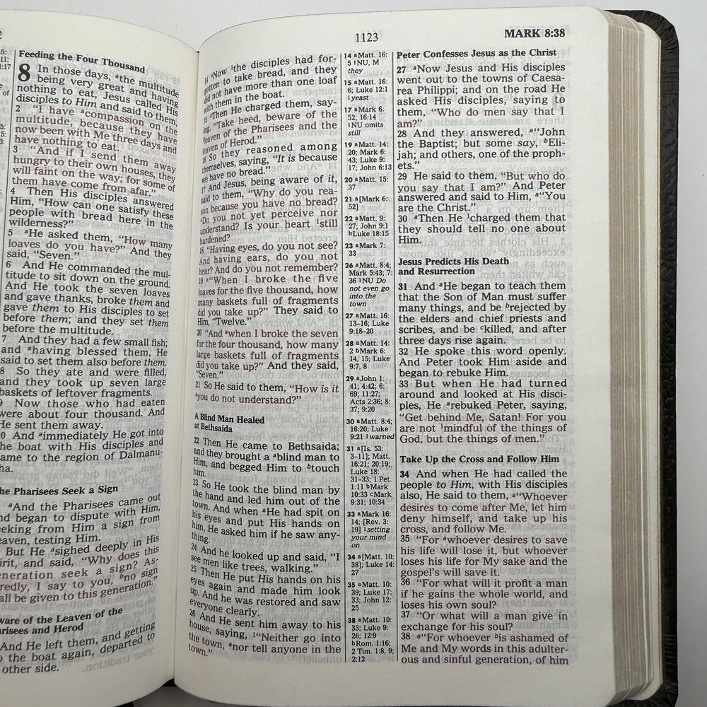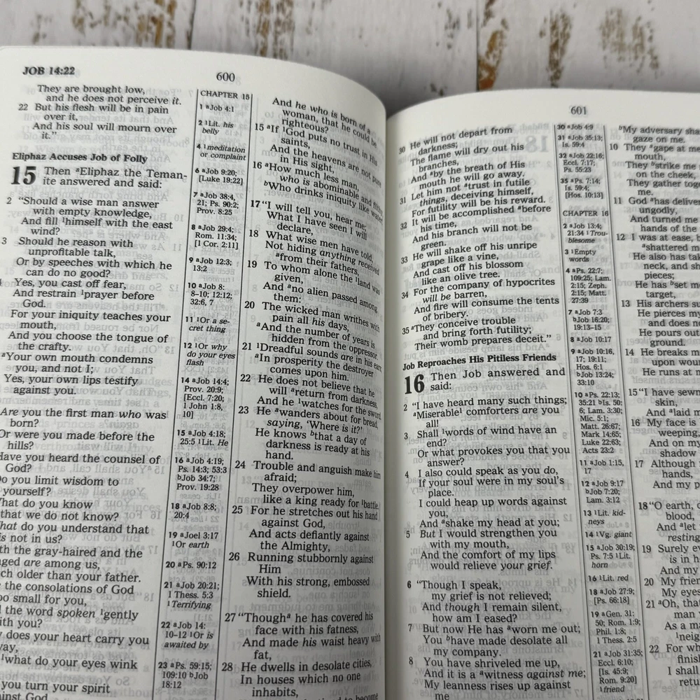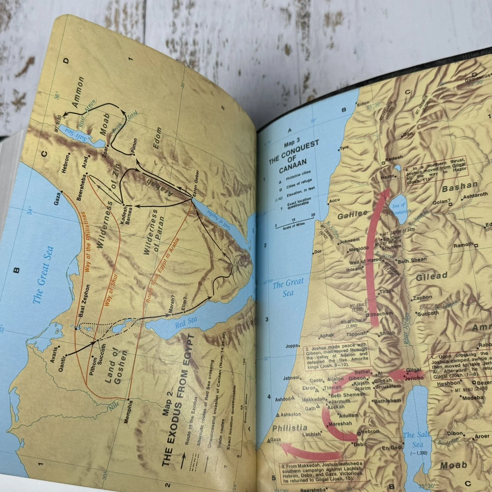 This is a 1984 KJV edition of the Holy Bible published by Thomas Nelson NUMBER 443. It is a red letter edition is bound in black faux leather. The book has 1524 pages and includes references, concordances, and blank presentation, marriage, births, family trees, and deaths pages. The book is in good condition and is intended for young adults and adults who are interested in religion and spirituality.